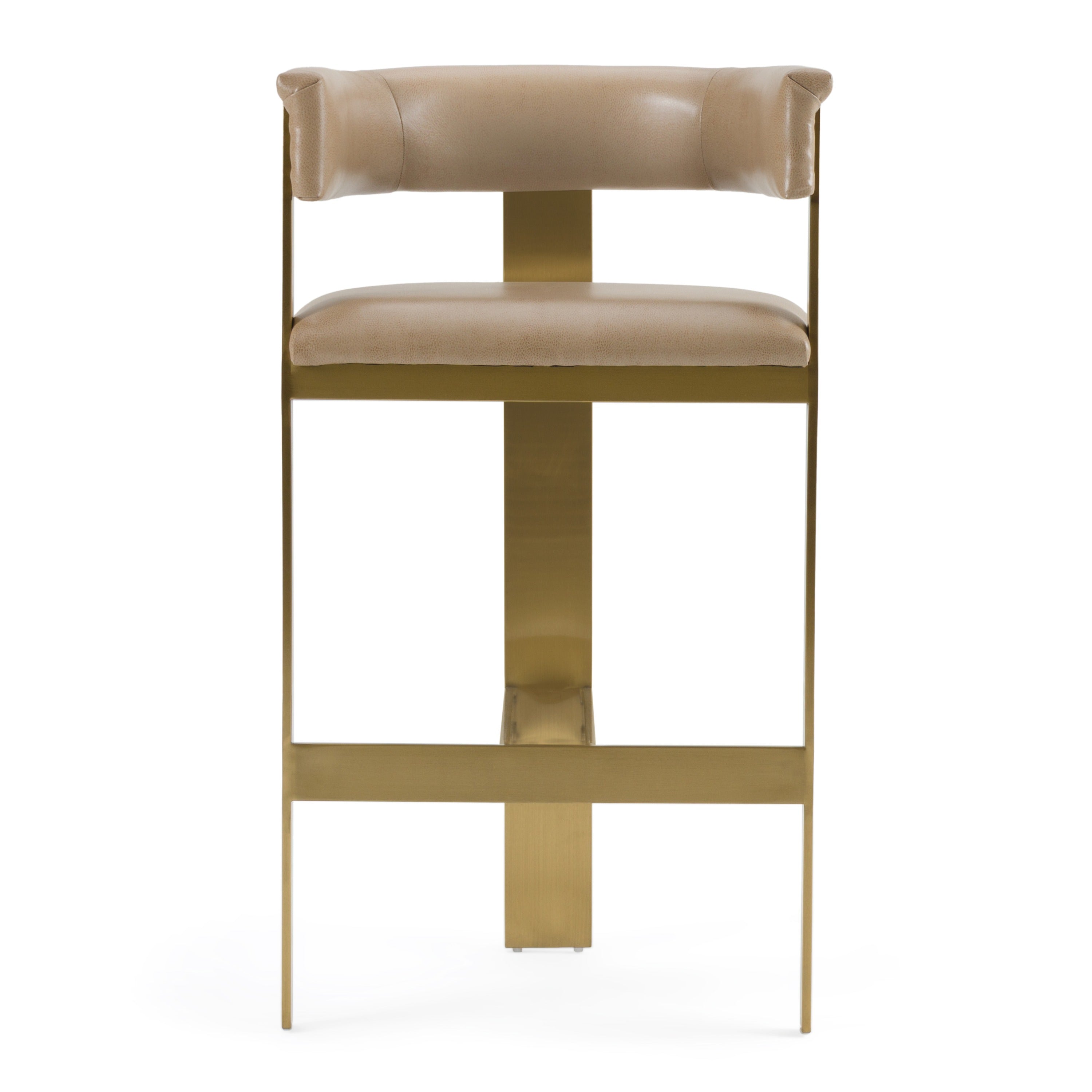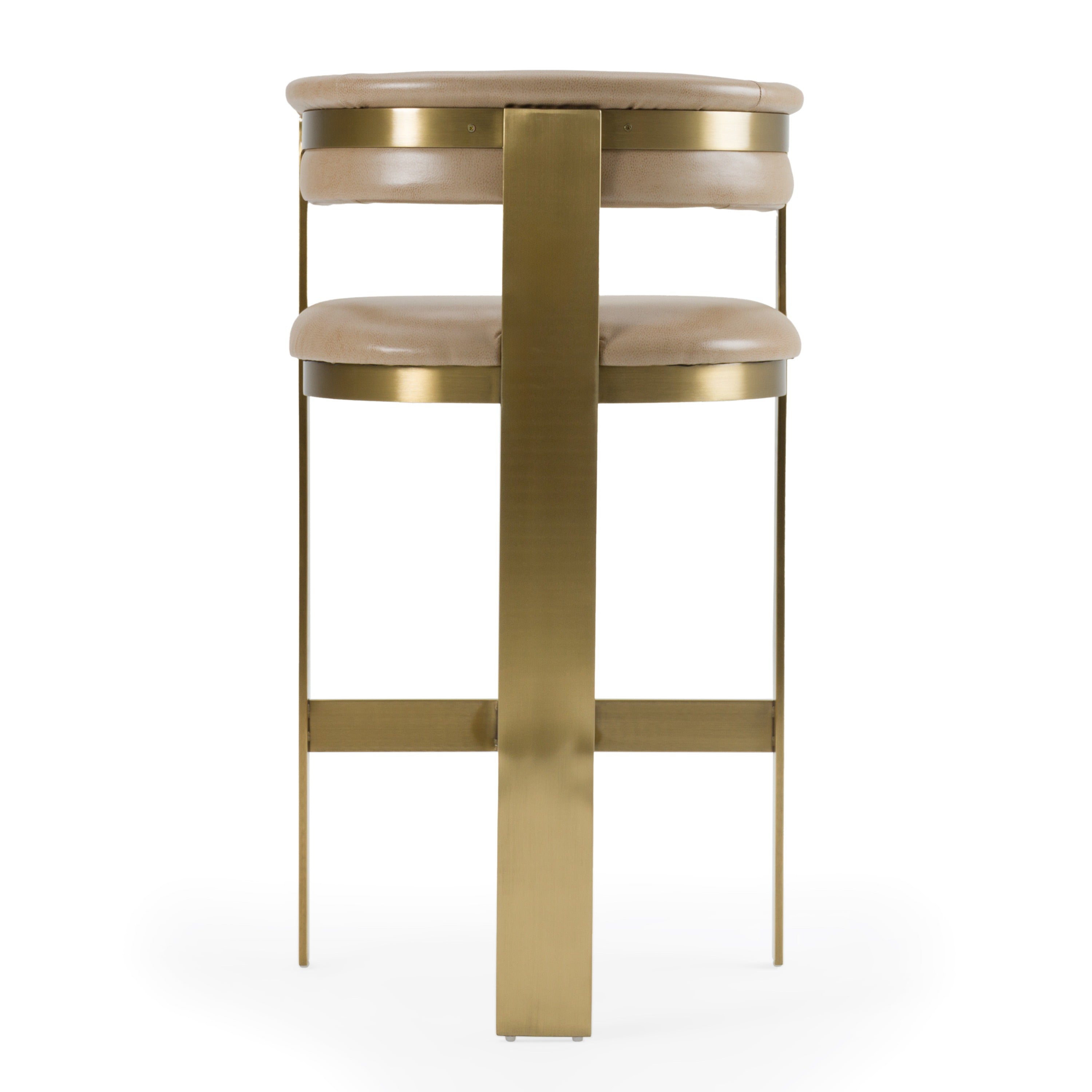 The Modrest Boswell Counter Chair in rich brown faux leather and matte gold exudes sophisticated charm. Its luxurious, rounded back and plush seat rest gracefully atop a sleek golden frame, offering both comfort and visual elegance. This chair s sculptural presence and inviting aesthetic make it a perfect addition to any refined kitchen or bar area, blending modern artistry with timeless allure. The Boswell Counter Chair redefines luxury seating, transforming everyday moments into stylish statements.