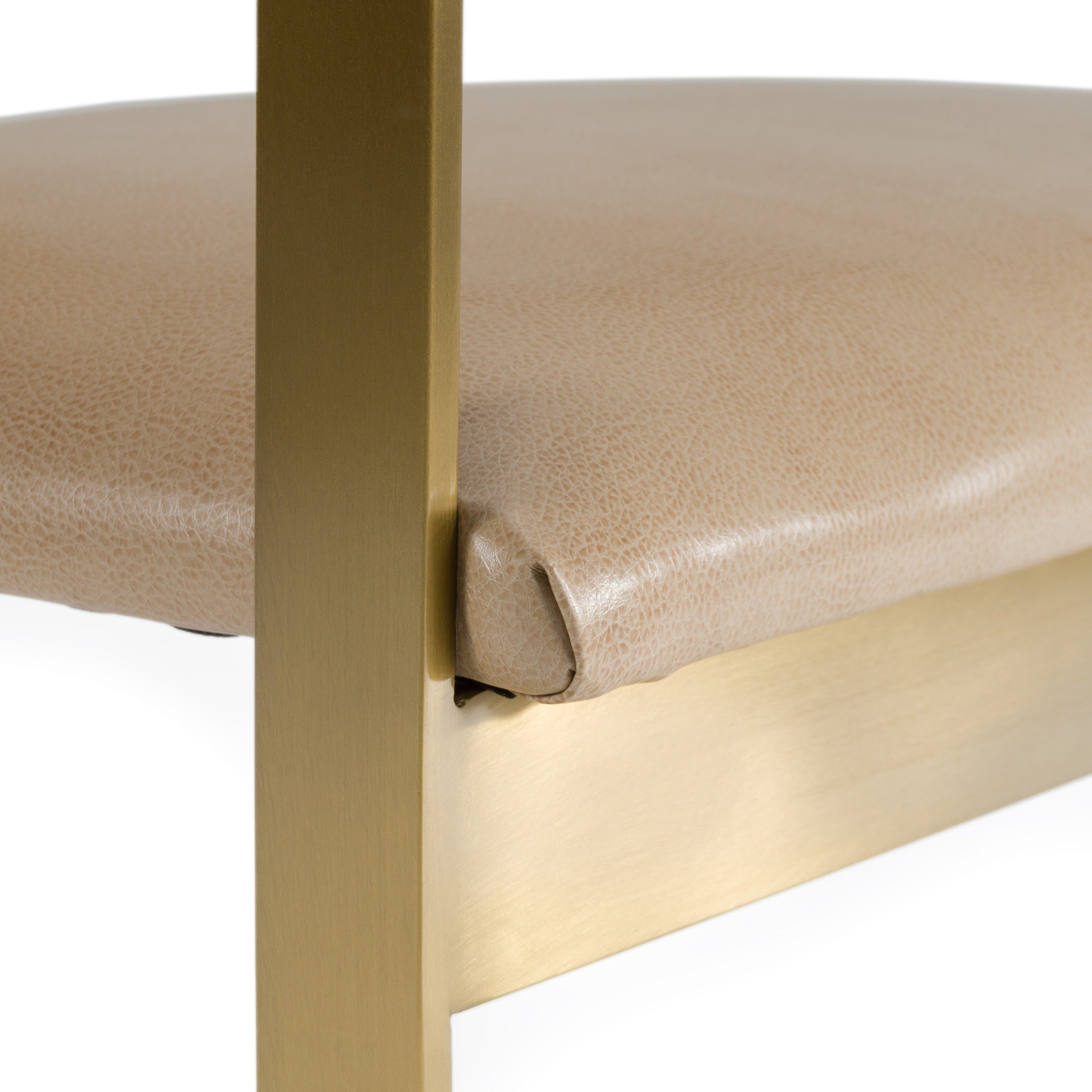 The Modrest Boswell Dining Chair radiates modern elegance with its sumptuous brown faux leather and sophisticated matte gold frame. This piece is designed to elevate any dining space, merging style with an enveloping comfort that invites you to linger. The curved backrest and plush seat add a sense of graceful luxury, while the golden tripod base introduces a sleek, sculptural element. Perfect for those who appreciate refined design, the Boswell chair transforms a dining area into an exquisite showcase of contemporary taste.