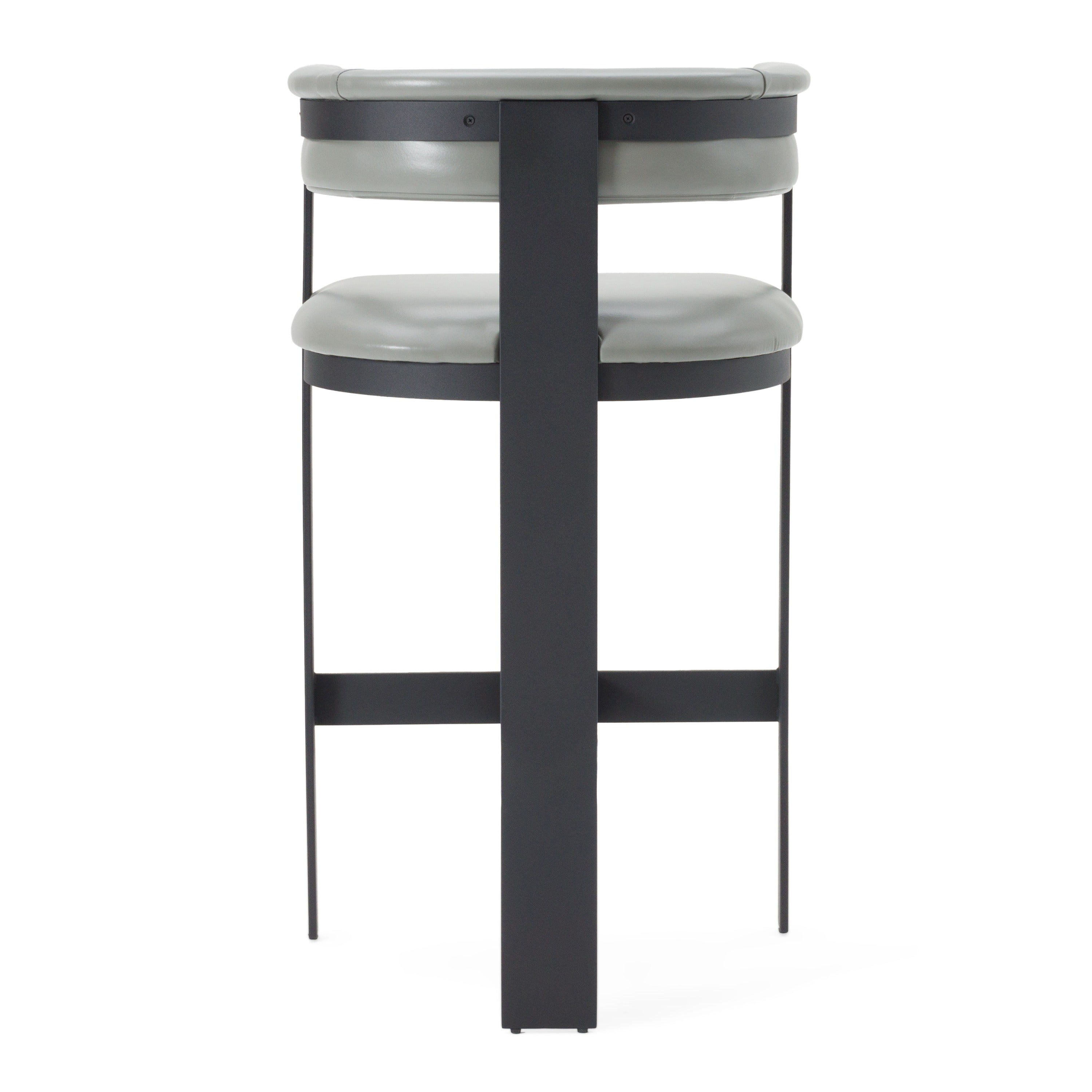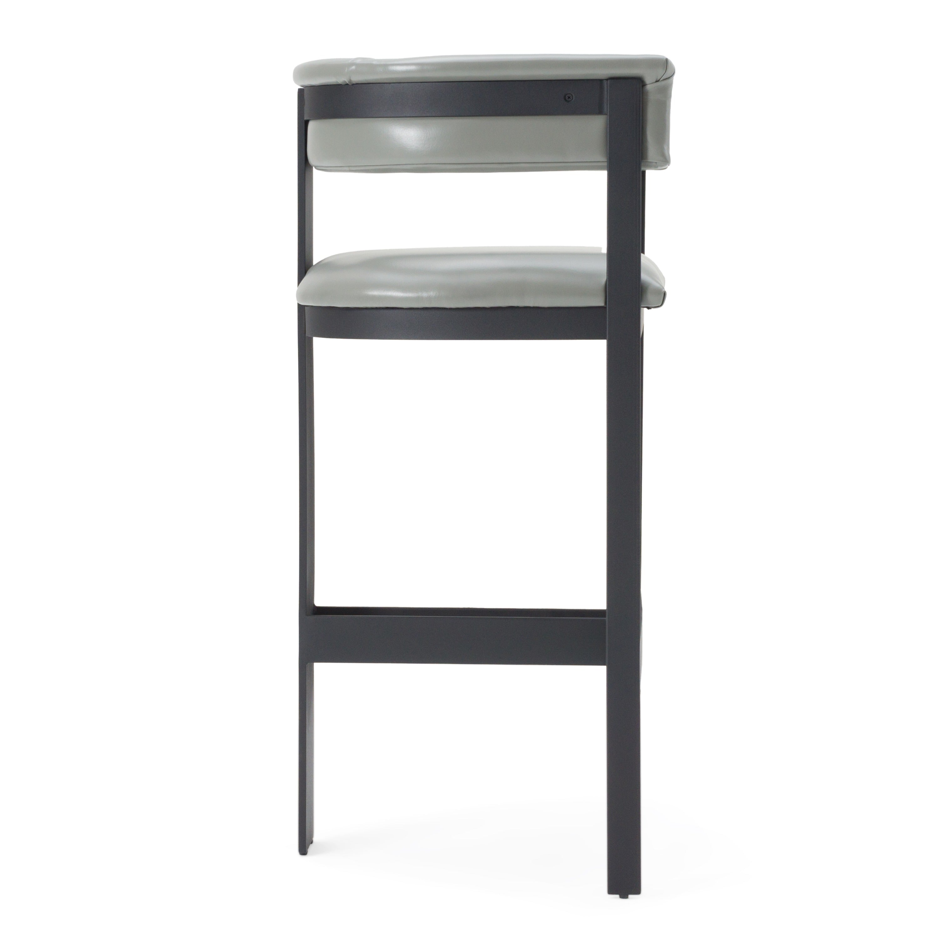 The Modrest Boswell Barstool is the epitome of contemporary sophistication, seamlessly blending sleek design with luxurious comfort. Its grey faux leather upholstery and bold black metal frame create a striking contrast, while the rounded armrest and back provide an inviting embrace. This stool s minimalist elegance enhances any modern bar setting, bringing an aura of refined style that is both captivating and effortlessly chic. A perfect blend of form and function, the Boswell Barstool redefines modern luxury in the heart of the home.