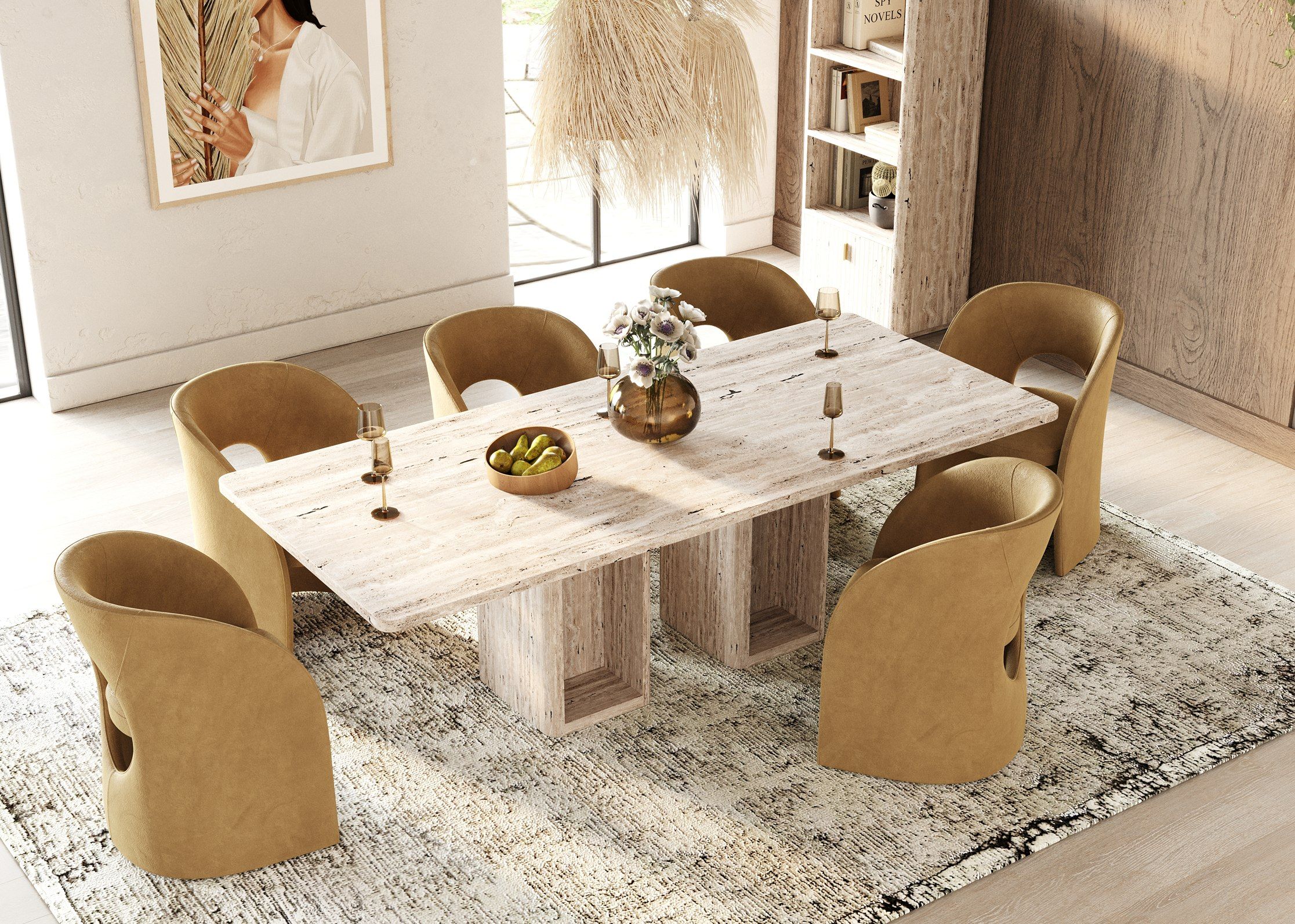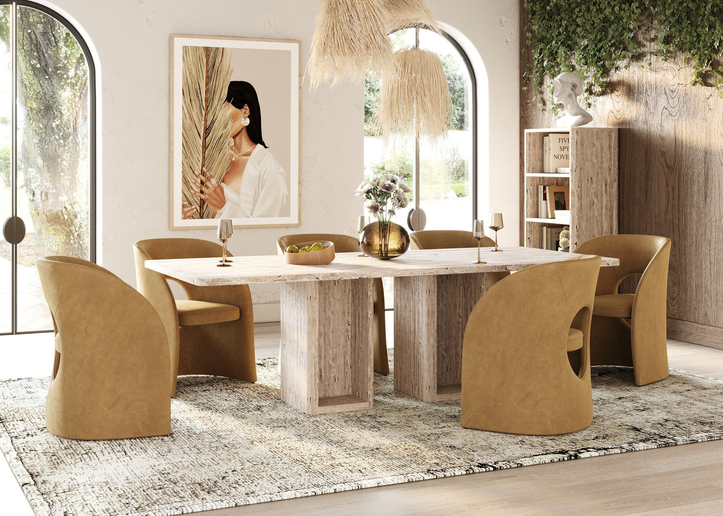 The Brea Dining chair features characteristics of Art Deco design with a modern twist, from its wraparound silhouette to its tan Jade cushions. A cut-out back gives the appearance of a floating seat, giving the chair a whimsical and lavishly modern appearance.