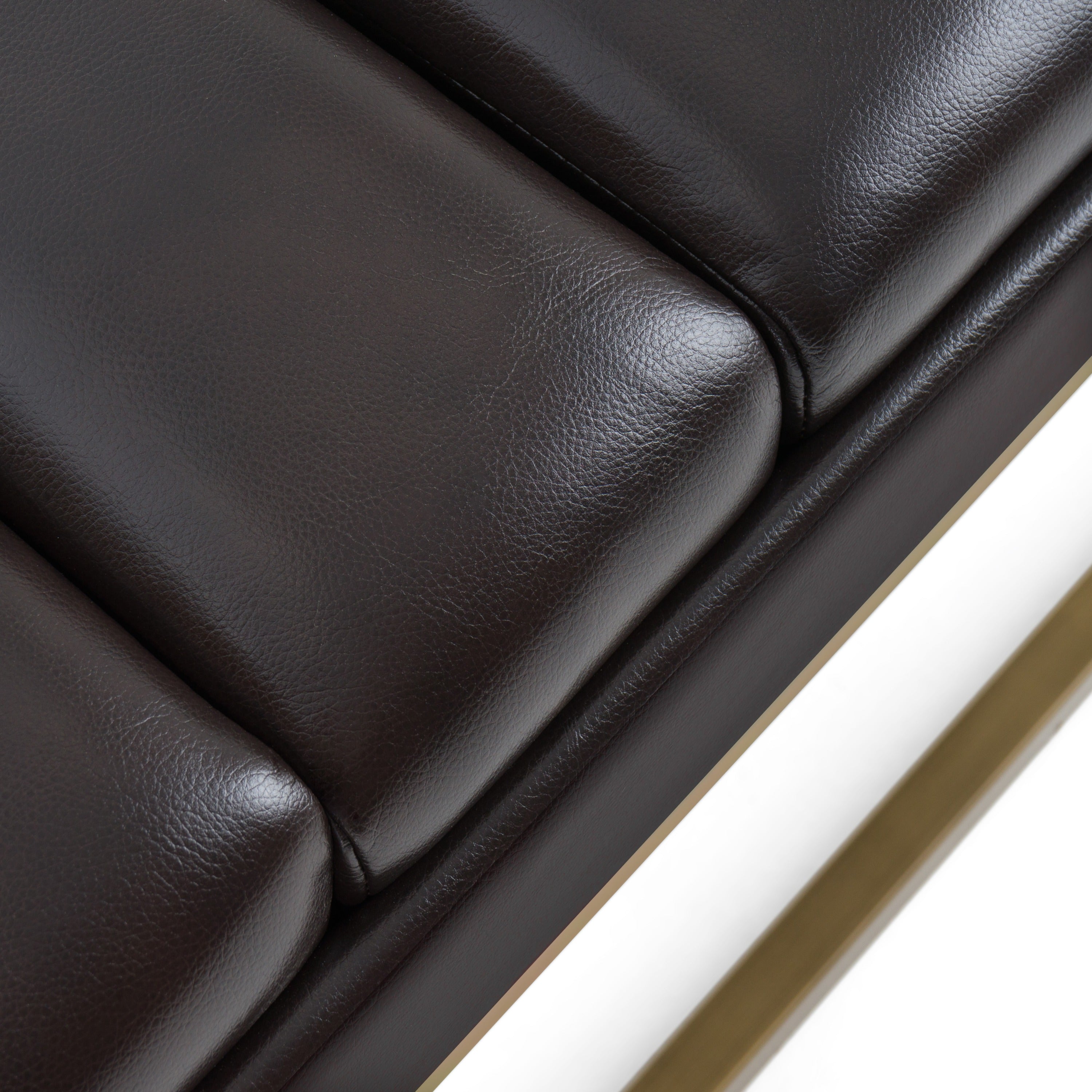 The Modrest Bridger Modern Black Vegan Leather & Brass Dining Bench is the epitome of sleek, modern elegance. Upholstered in luxurious black vegan leather, its tufted seat offers both style and comfort, while the antique brass frame adds a touch of timeless sophistication. Perfect for a minimalist dining space or chic entryway, this bench seamlessly blends functionality with high design. A true statement piece, it invites you to enjoy its clean lines and luxurious materials, embodying the art of modern living with understated grace and refinement.