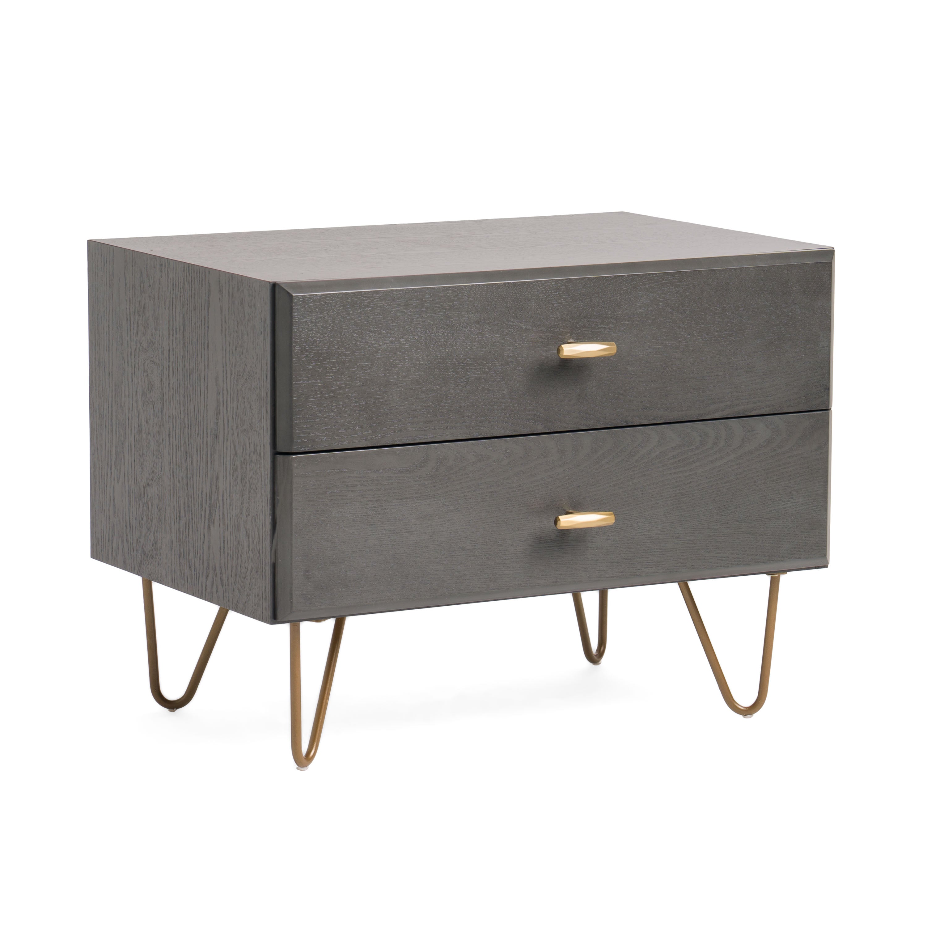 The right details can elevate a standard design to crave worthy results. This is especially true of the Bryan series and its Nightstand. Its simple rectangular shape has a grey washed Ash veneer on the frame and two soft-closing drawer fronts. A little metal contrast is achieved with brushed gold metal on the drawer pulls and angled powder-coated feet below. A great match for other Bryan series items. Some assembly is required.