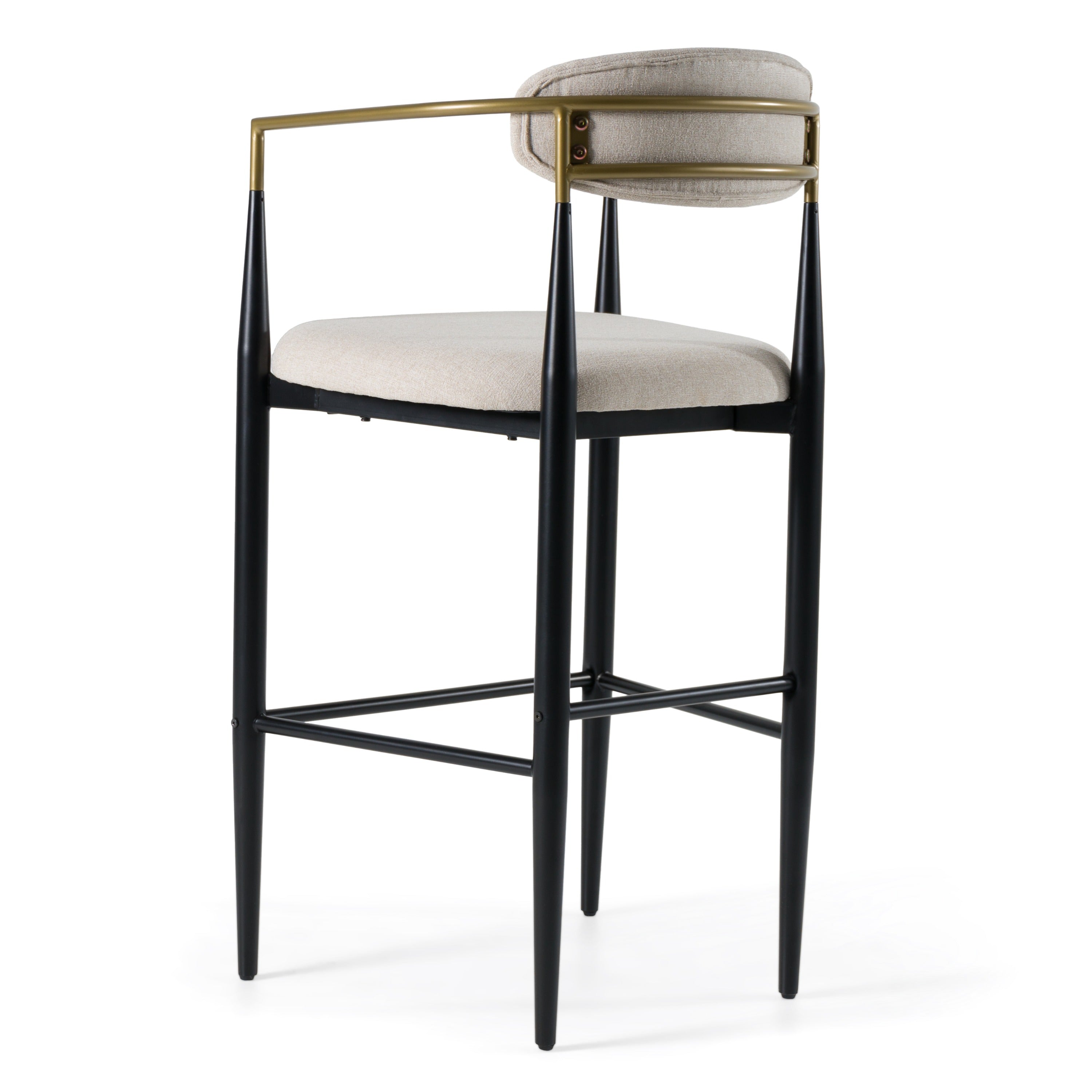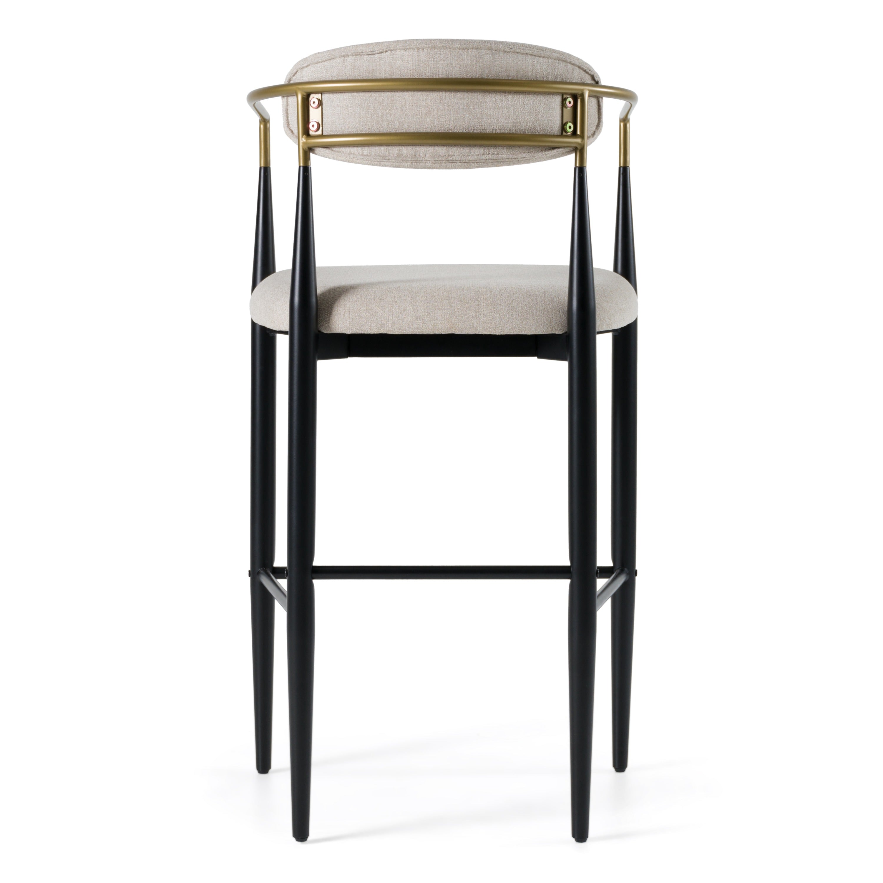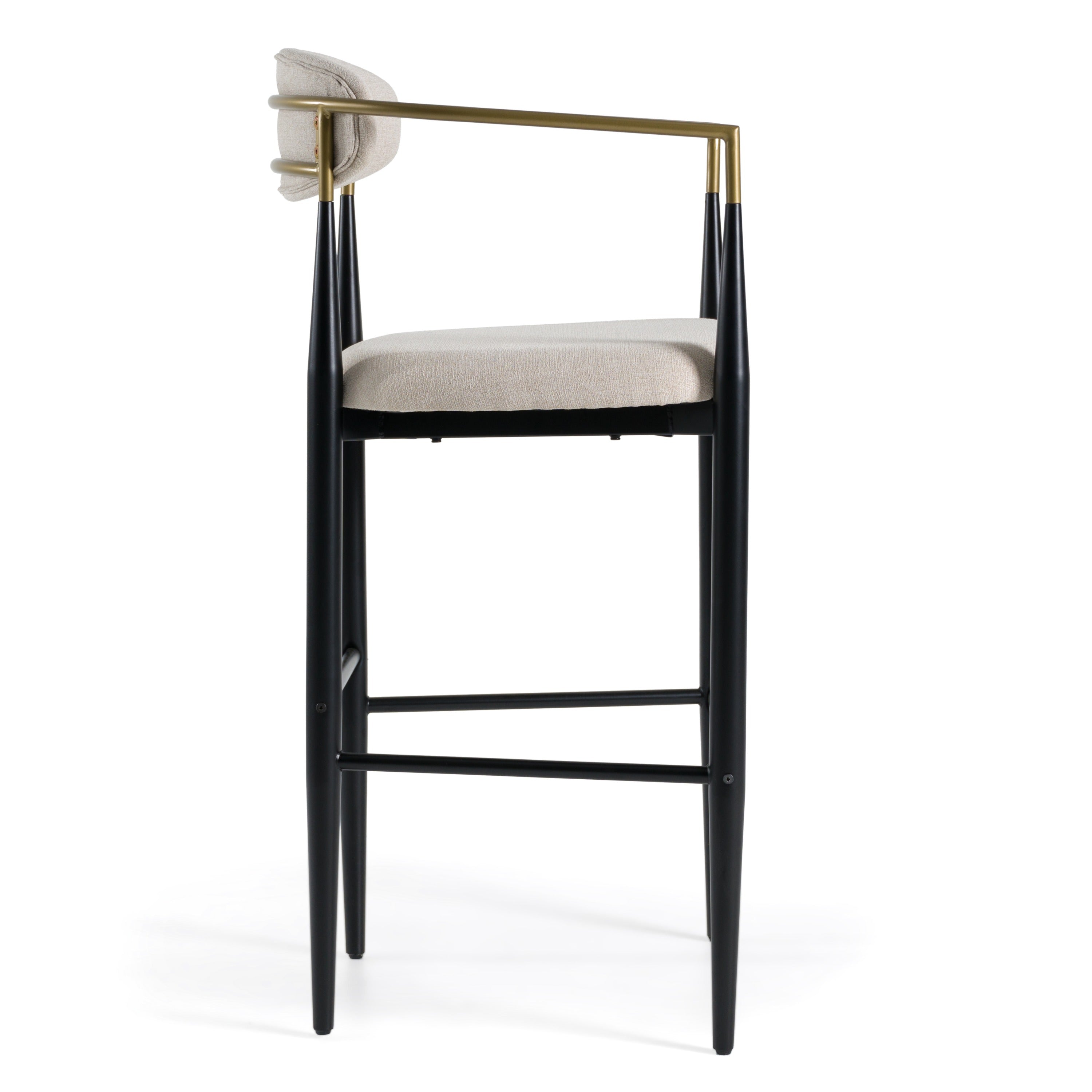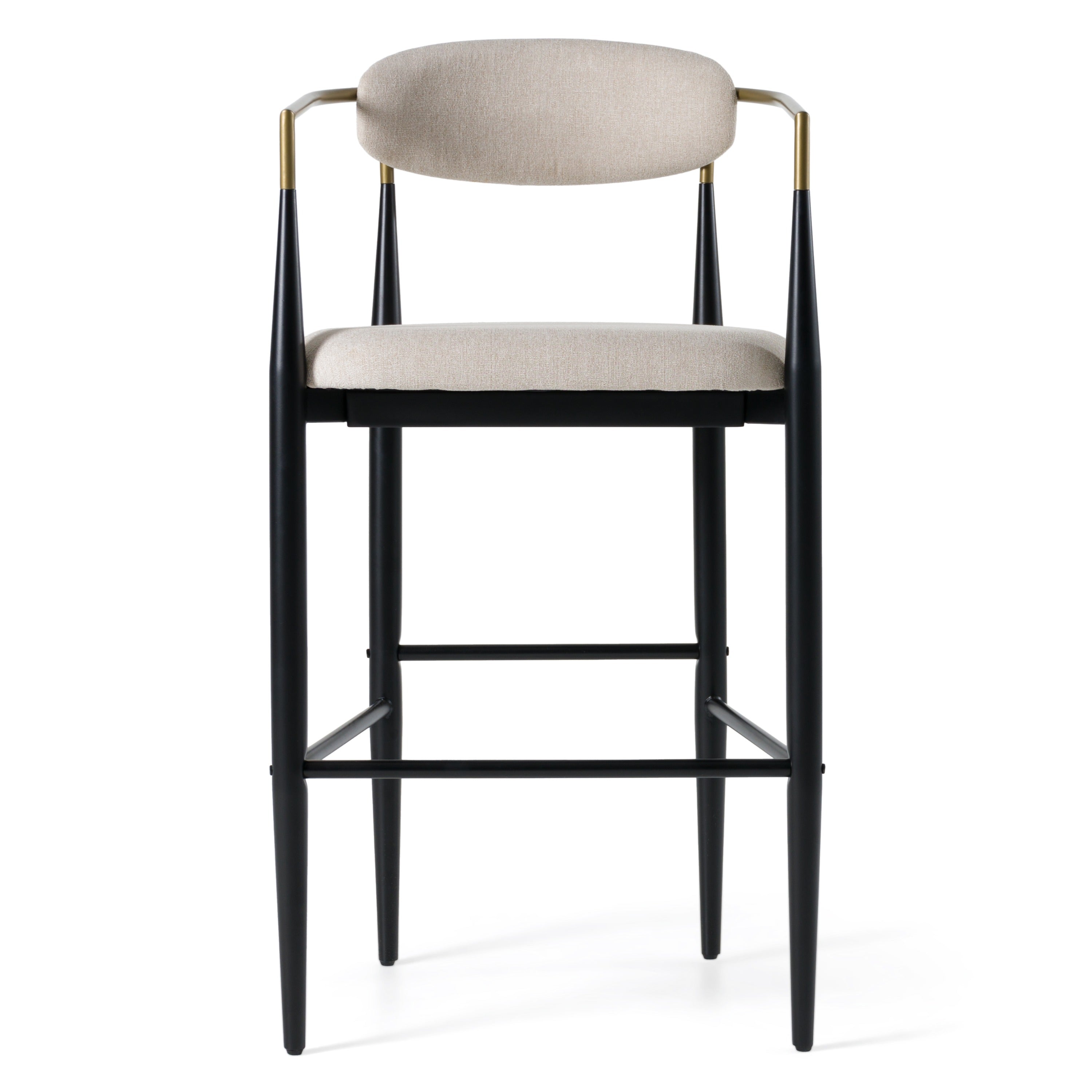 Introducing the Modrest Buchtel Arm Bar Chair, a stunning blend of mid-century modern design with contemporary flair. Elevated by a sleek black frame, the chair features elegant gold accents on the arms, creating a luxurious contrast with the soft beige upholstery. The streamlined silhouette and pointed legs add a touch of sophistication, making it a perfect addition to any bar or kitchen setting. Ideal for both comfort and style, this chair is a chic solution for modern interiors, inviting guests to enjoy a meal or cocktail in refined elegance.