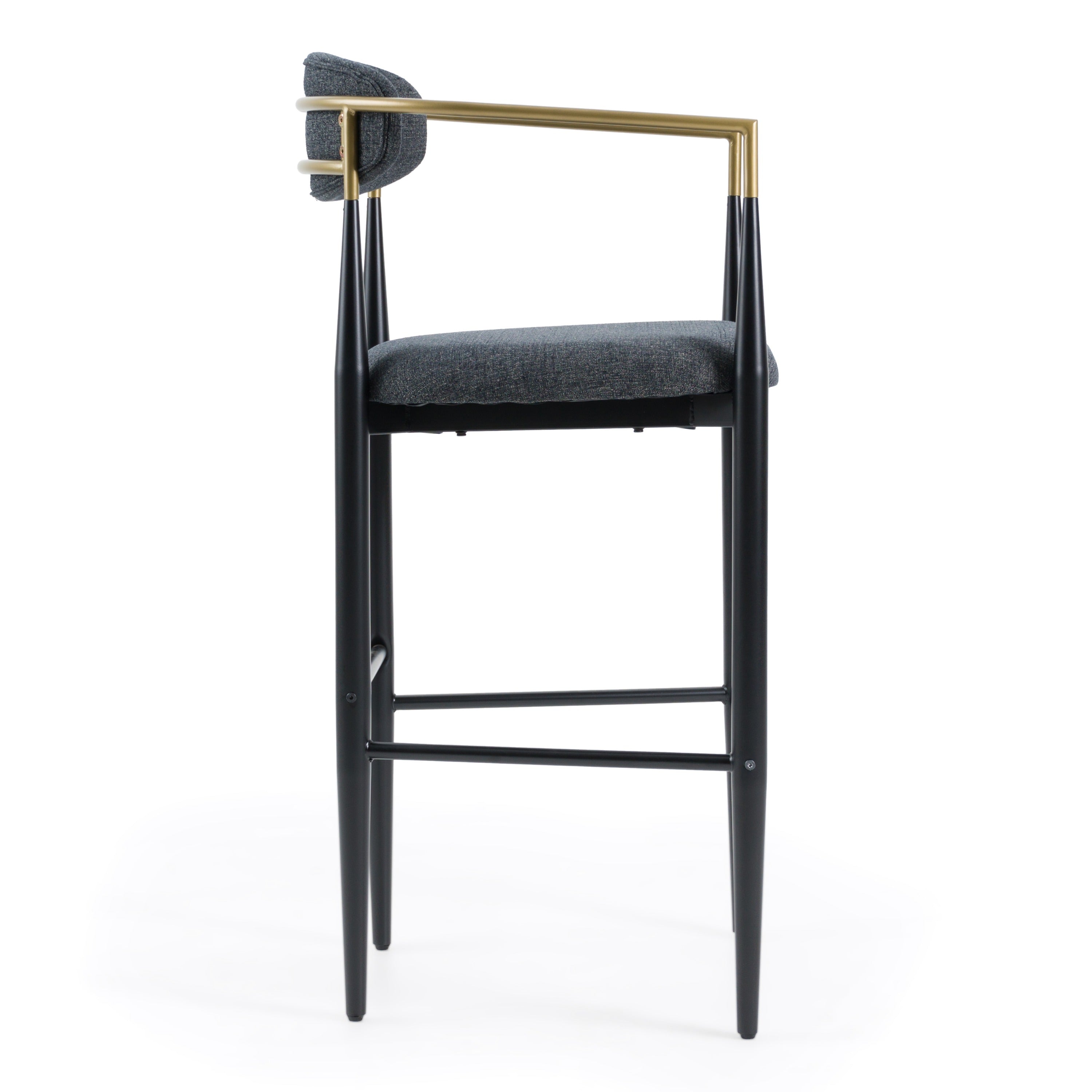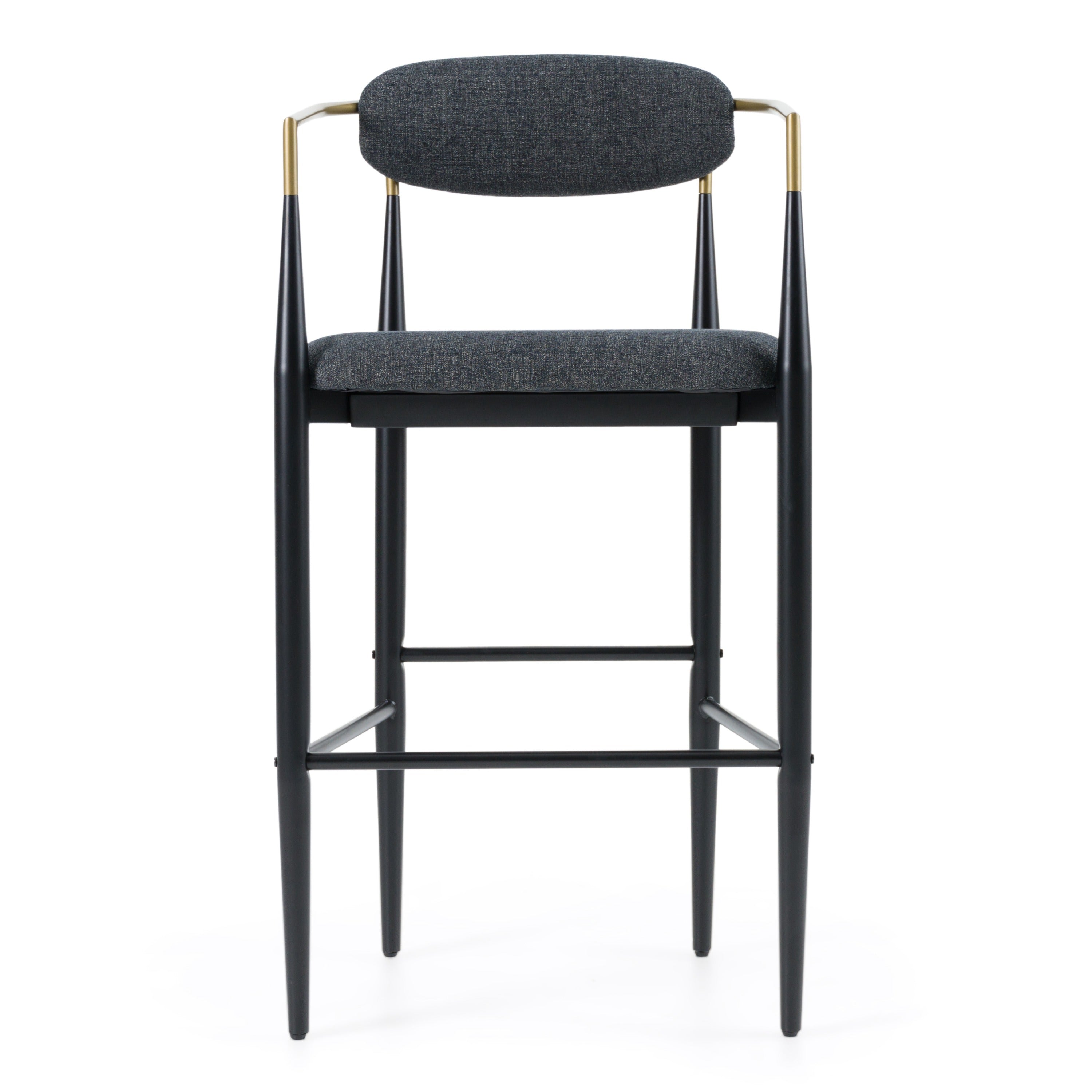 Introducing the Modrest Buchtel bar chair, a stunning blend of Mid-Century Modern aesthetic and contemporary flair. Featuring a sleek dark grey upholstered seat and backrest, the chair exudes elegance, complemented by gold accents on the armrests. Its tall, tapered black legs offer a striking contrast, ensuring stability while enhancing its sophisticated silhouette. Perfect for stylish kitchen islands or bars, this chair adds a touch of refined warmth to any space. Ideal for those with a discerning taste in design, it seamlessly elevates modern interiors.