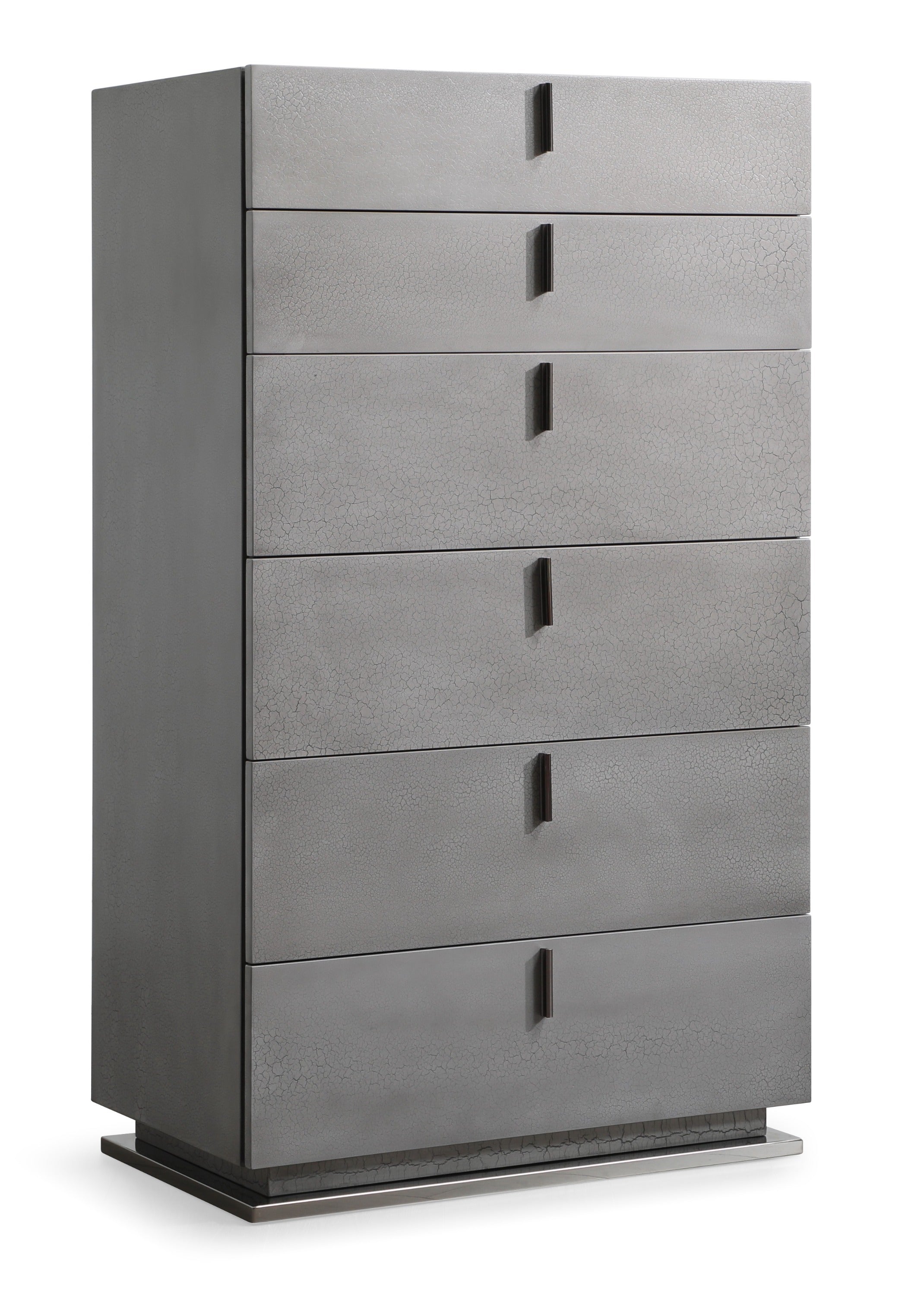 The Buckley Chest is a very unique item. The crackle matte lacquer finish adds texture and style to any room. The metal handles create a long clean line against the rough finishing and the black gunmetal base adds to the industrial feeling. Pair with a white fur rug and a platform bed for the perfect modern bedroom.