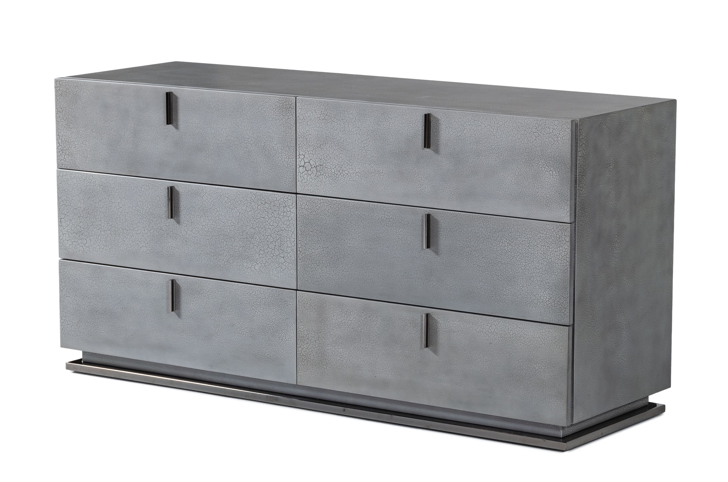 The Buckley Dresser is a very unique item. The crackle matte lacquer finish adds texture and style to any room. The metal handles create a long clean line against the rough finishing and the black gunmetal base adds to the industrial feeling. Pair with a white fur rug and a platform bed for the perfect modern bedroom.