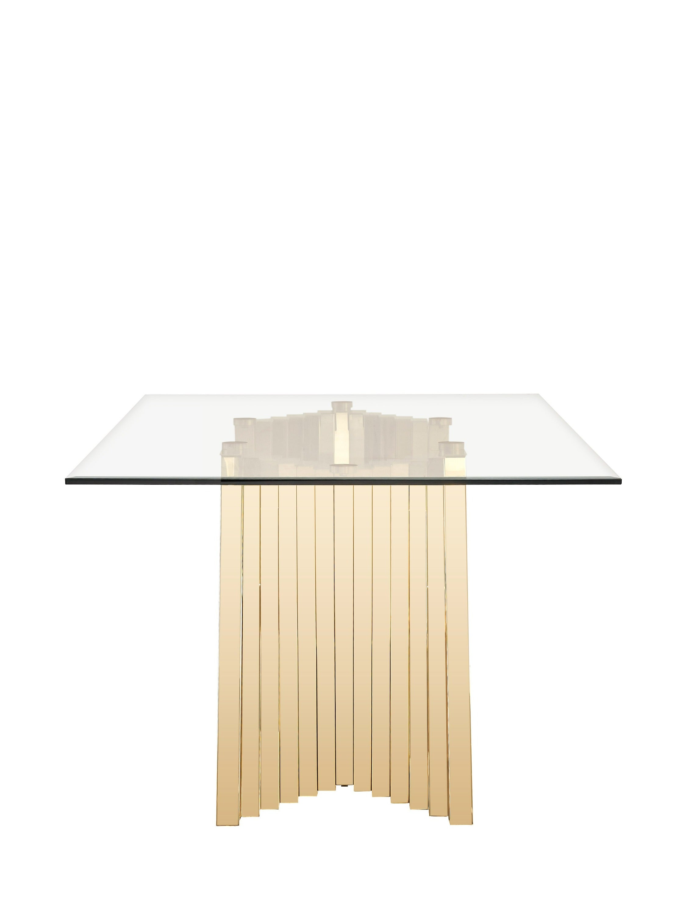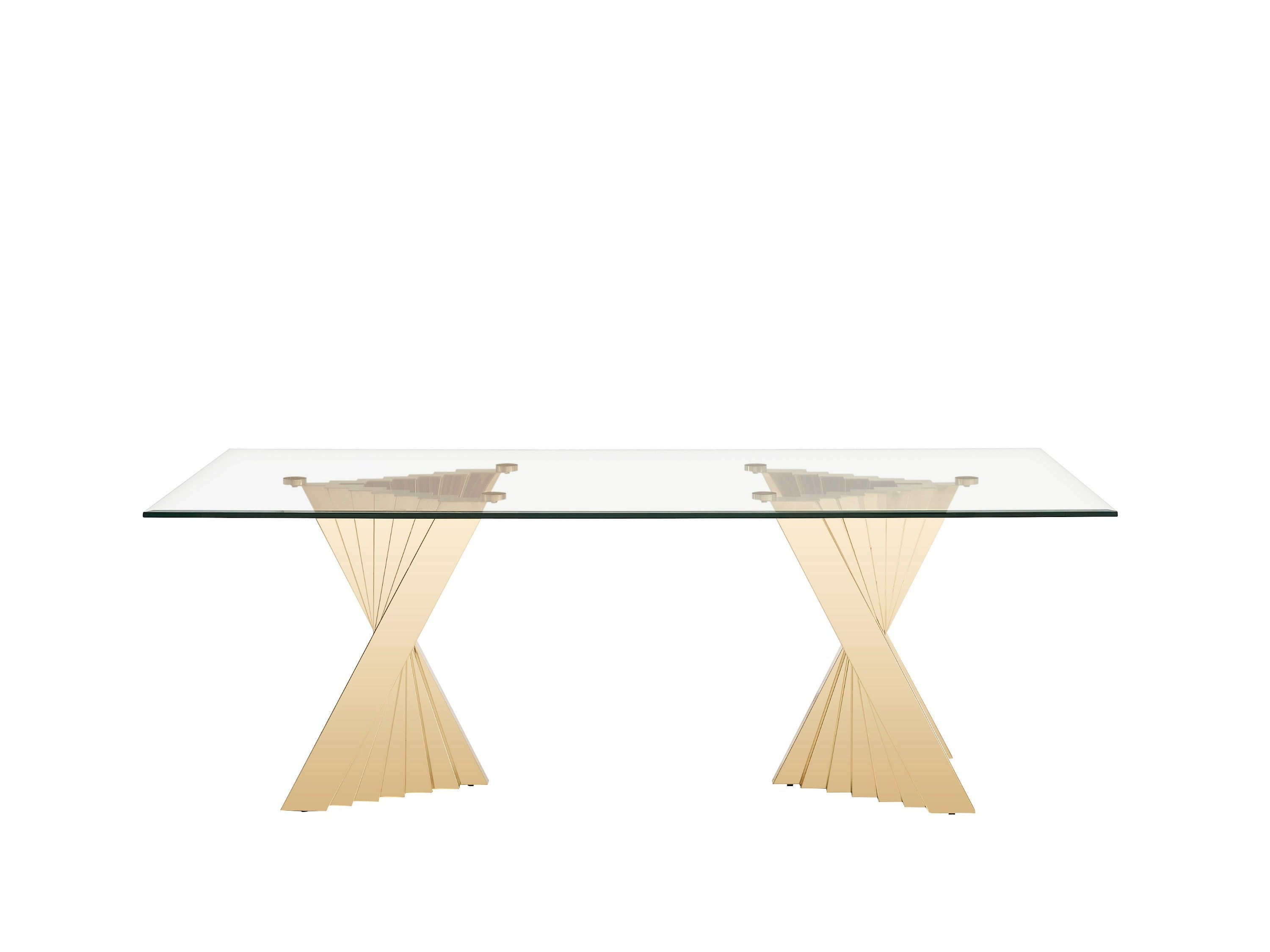 The Buquet Dining Table has a beautiful tempered glass top that shows off the beautiful stainless-steel brushed champagne gold legs. The Art Deco style of this contemporary table is sure to add glamor and elegance to your dining room. Pair with white fabric chairs or a bold colored velvet dining chair and gold buffet.