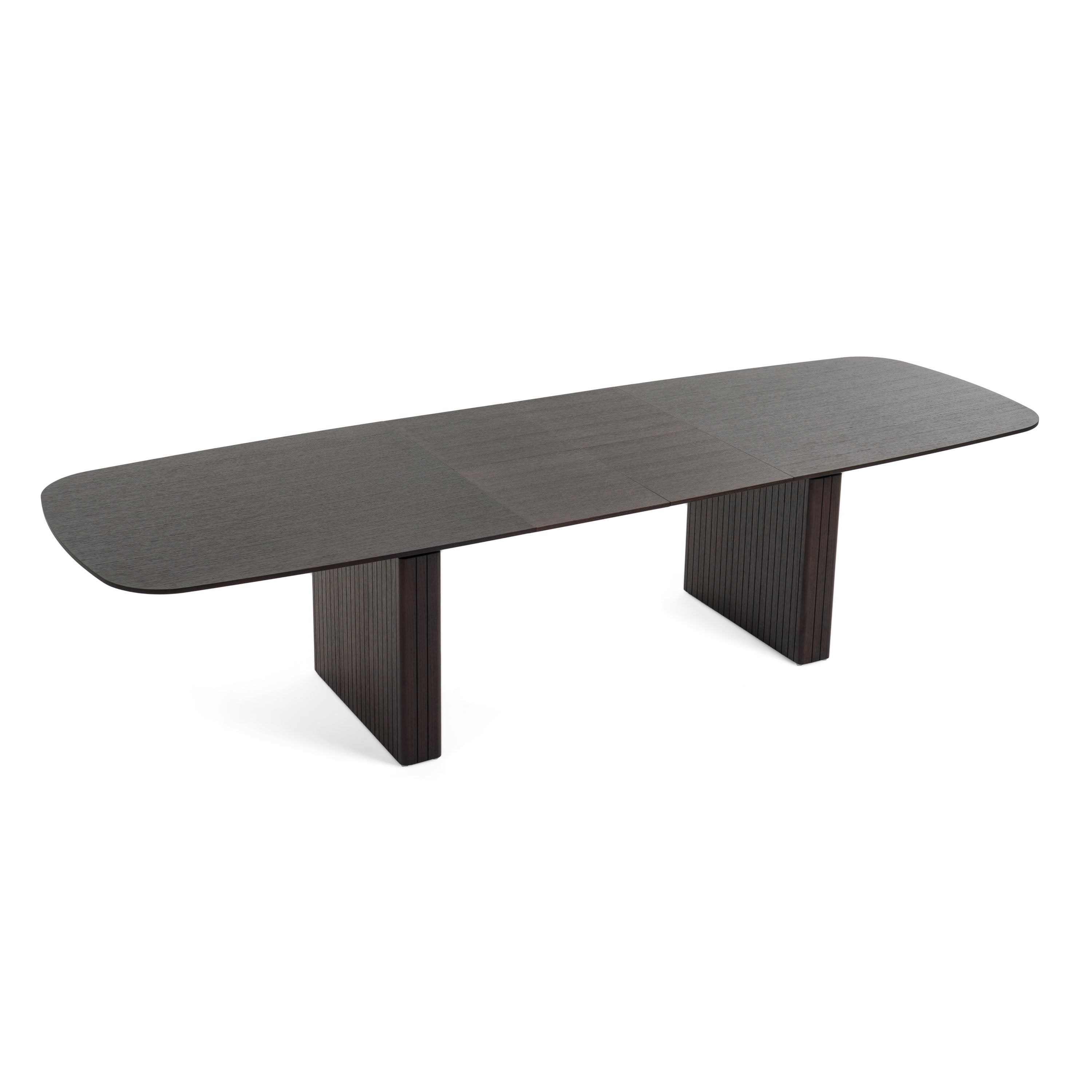 The Calhoun Extendable Dining Table is the perfect modern dining table for a modern home. The slatted, smoked oak veneer, pedestal legs of this gorgeous table create a dramatic silhouette for this table. The table seats up to 8 and 12 when it is fully entended with two of the extensions.