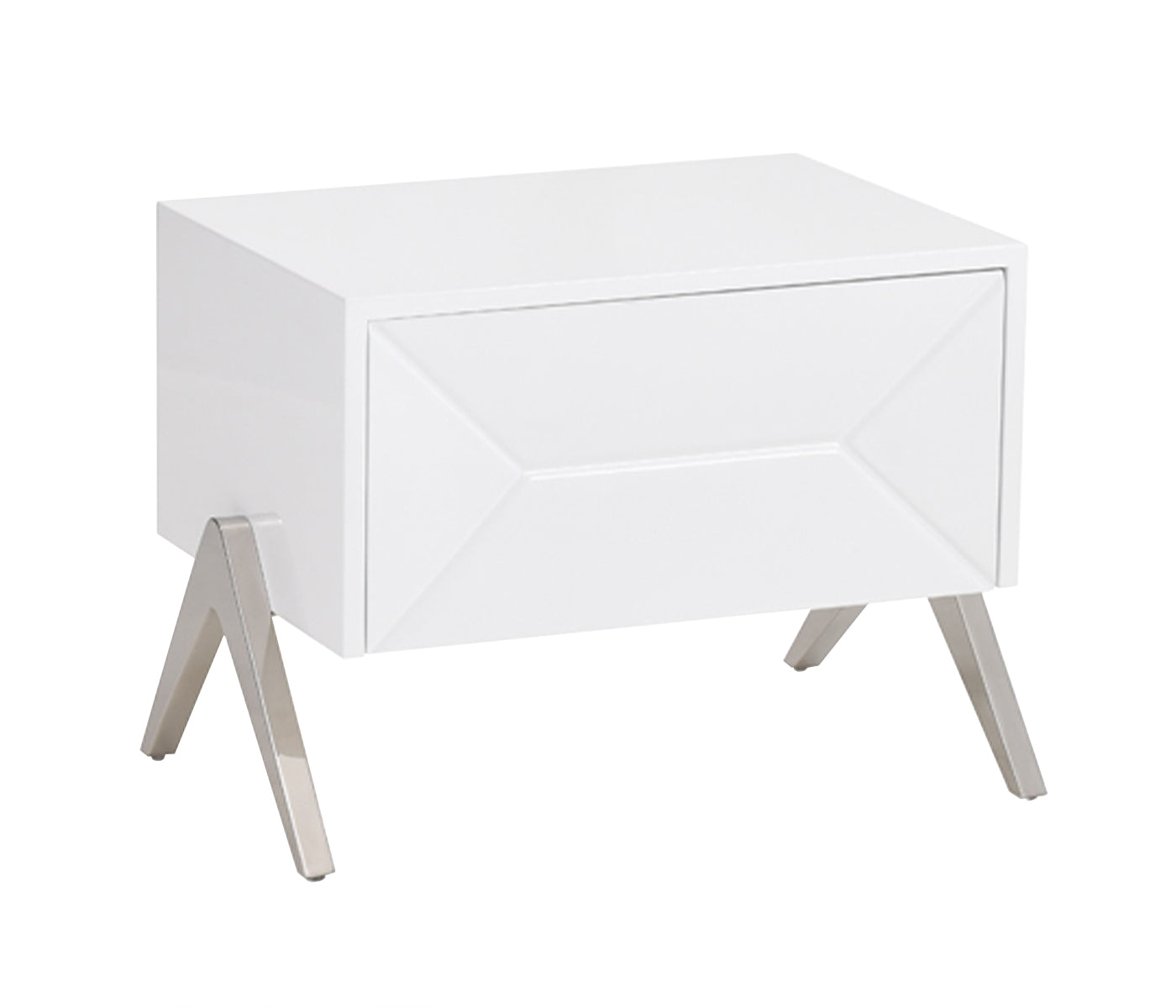 The Modrest Candid Modern White Nightstand presents a winsome style featuring a dainty white high gloss finish. Fitted with a single drawer with a linear front design, it stands on durable upside-down V-shaped stainless steel legs. Requiring no assembly, this modern nightstand has a dimension of W26" x D17" x H19".