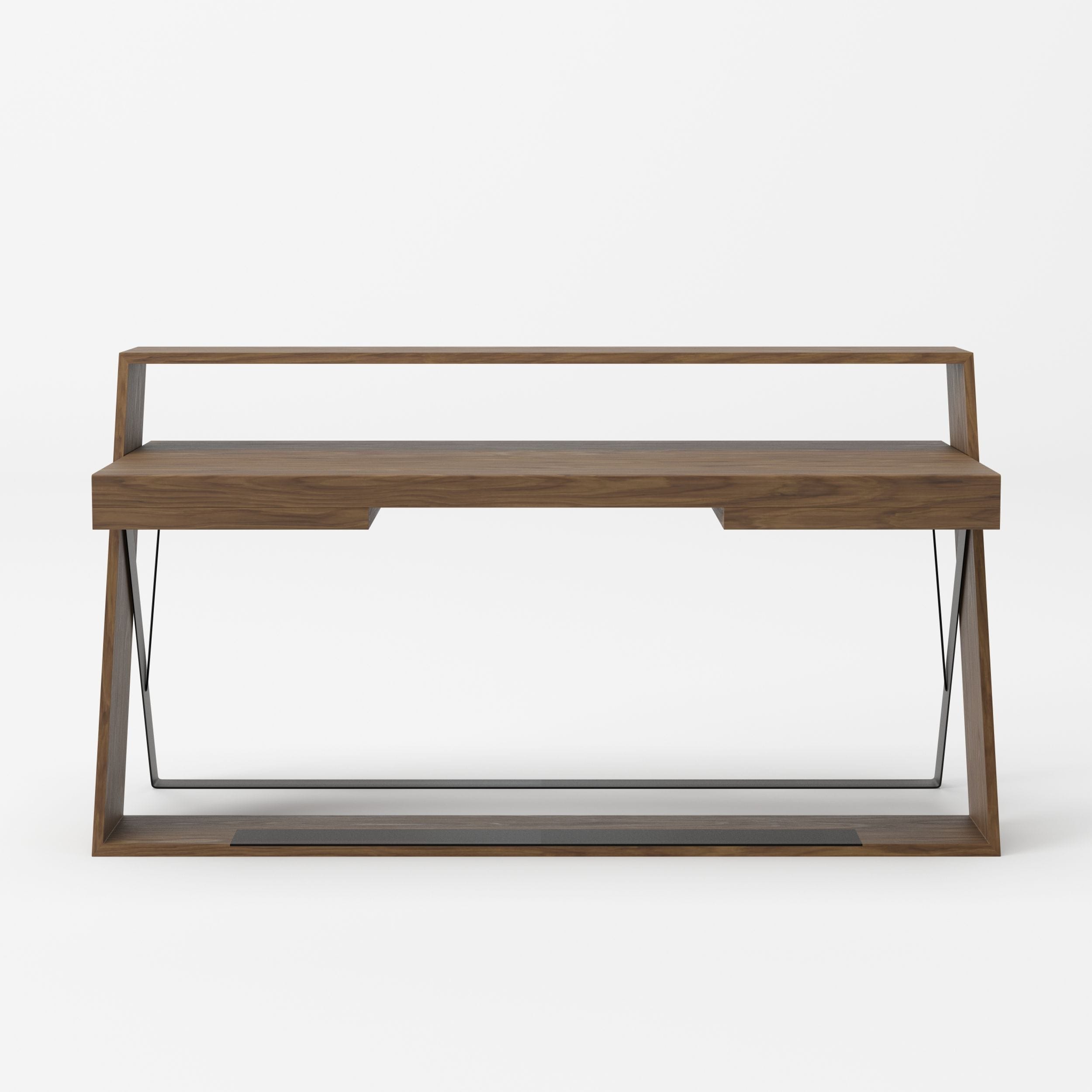 The Carrie desk has an interesting geometric design with crisscrossing legs and two soft-closing drawers. With an American walnut veneer tabletop and leg and another black metal base leg, this desk is certainly a conversation piece for any modern office.