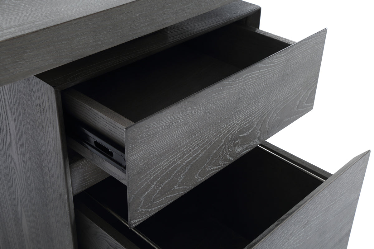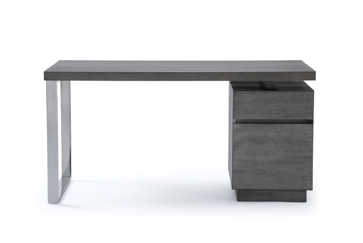Sporting a classic and functional design is the Modrest Carson Modern Grey Elm & Stainless Steel Desk. Featuring a grey glossy Elm veneer finish with sparkly wood lines, it comes with a rectangular work surface and two box drawers. The two full extension soft closing drawers on metal glides plus the space between the table top and the drawer surface offer adequate storage to keep your table free from clutter. This modern desk stands on sturdy slab-cut stainless steel leg.