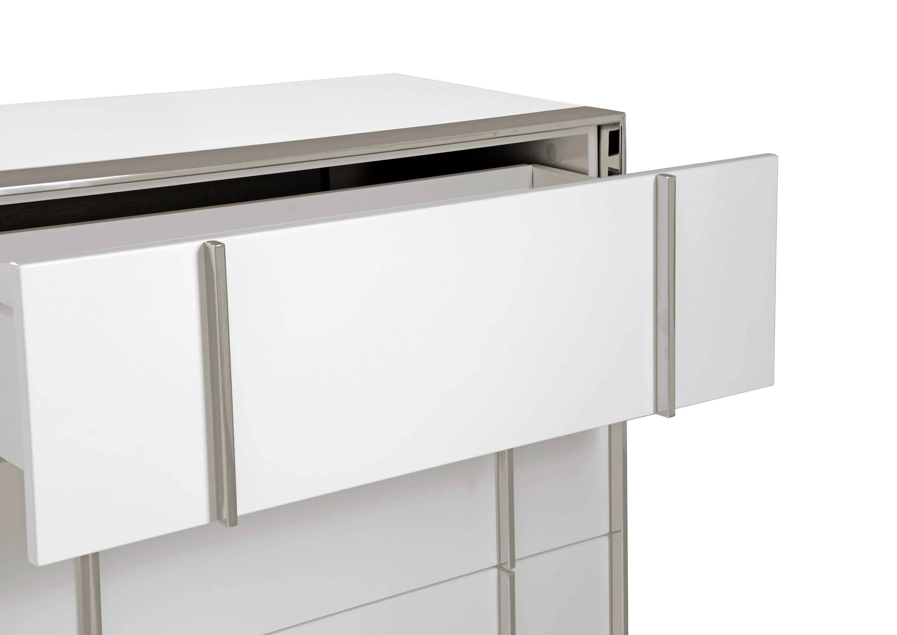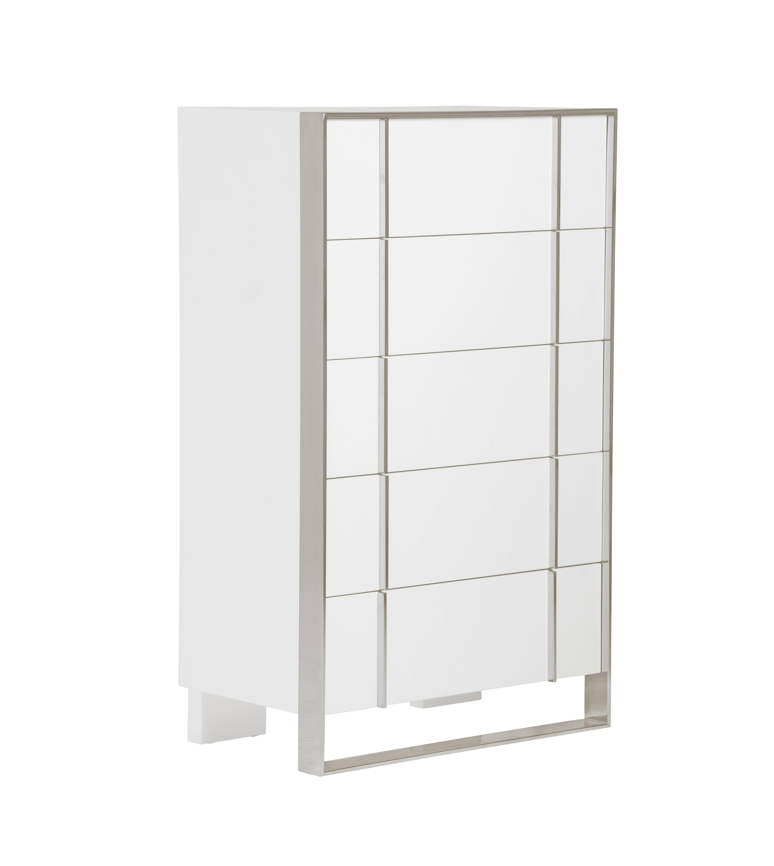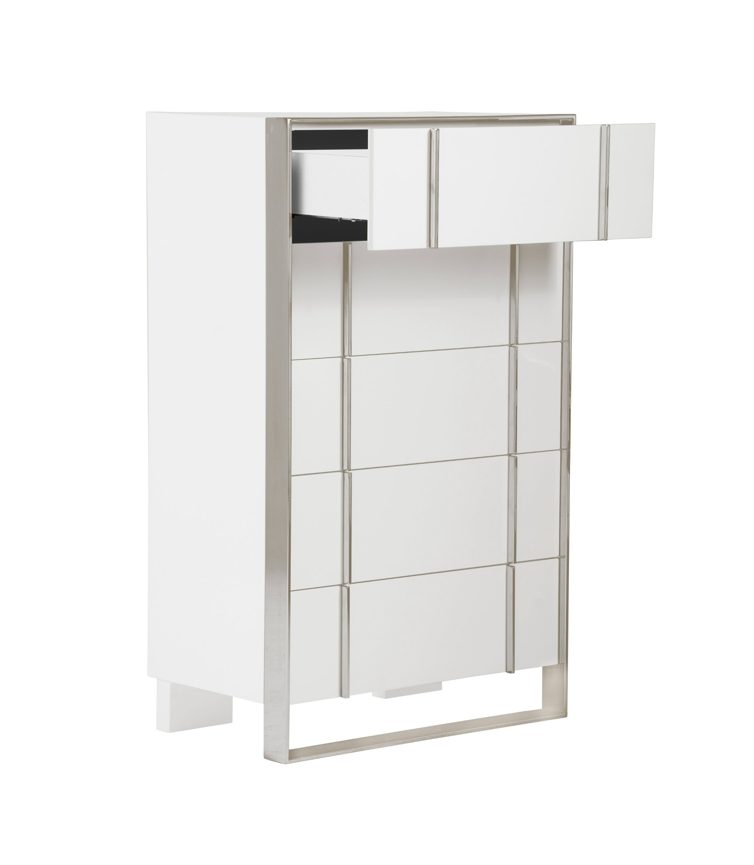 The Nova Domus Cartier Chest Is a credit to its brilliant designer. The stainless steel metal framing masterfully surrounds the bold white high gloss of the chest. Five soft closing drawers create ultimate functionality. Perfect for a glamourous modern home, this Chest will pair perfectly with the Cartier Nightstand, Bed, and Dresser for a full set.