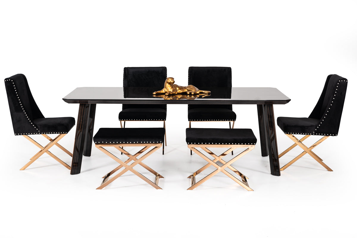 Classy is the best word to describe the Modrest Chadwick Modern Ebony & Rose gold Dining Table. Featuring a rectangular top with angular corners, it has an Ebony high gloss finish surface for that lustrous appeal. Rose Gold stainless steel edge gave this table depth and substance that will fill your guests with admiration. This modern dining table accommodates 4-6 persons comfortably. To complete its refined look, it was fitted with tapered legs.
