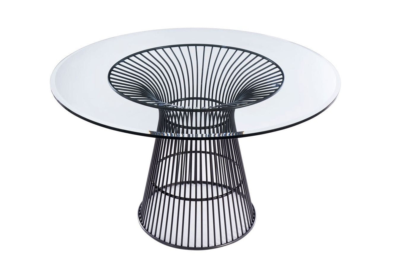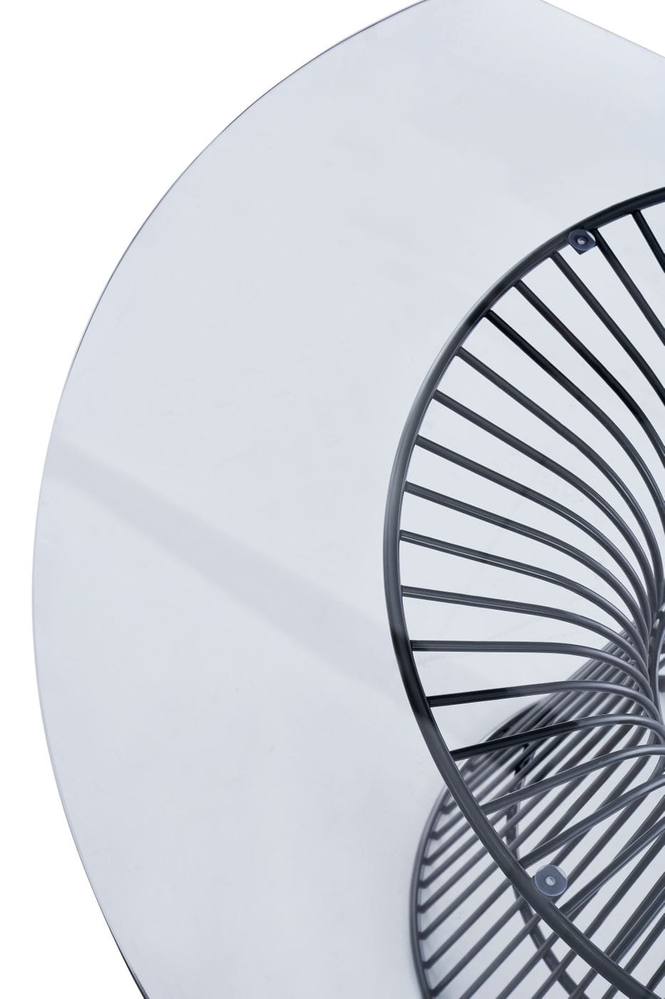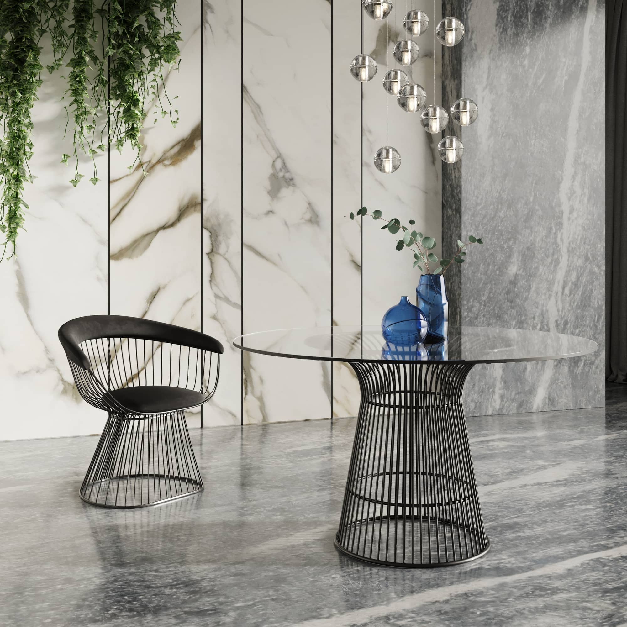 The sunburst pattern that is vectoring around this lovely round dining table in a beautiful black stainless-steel. The grey tempered glass top contrasts the black metal to create extreme visual interest. Pair with the Chandler Chairs to make a perfect match.