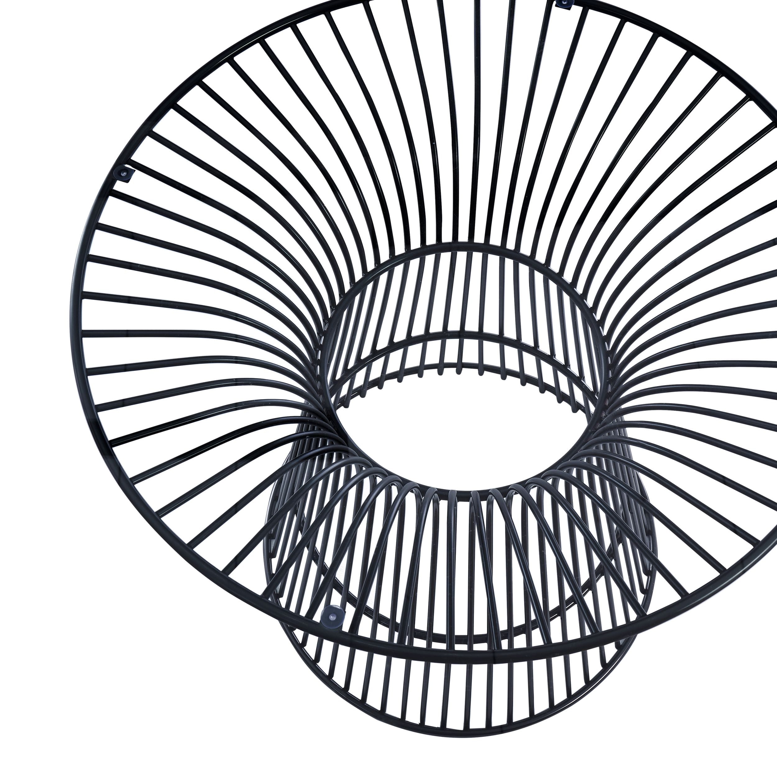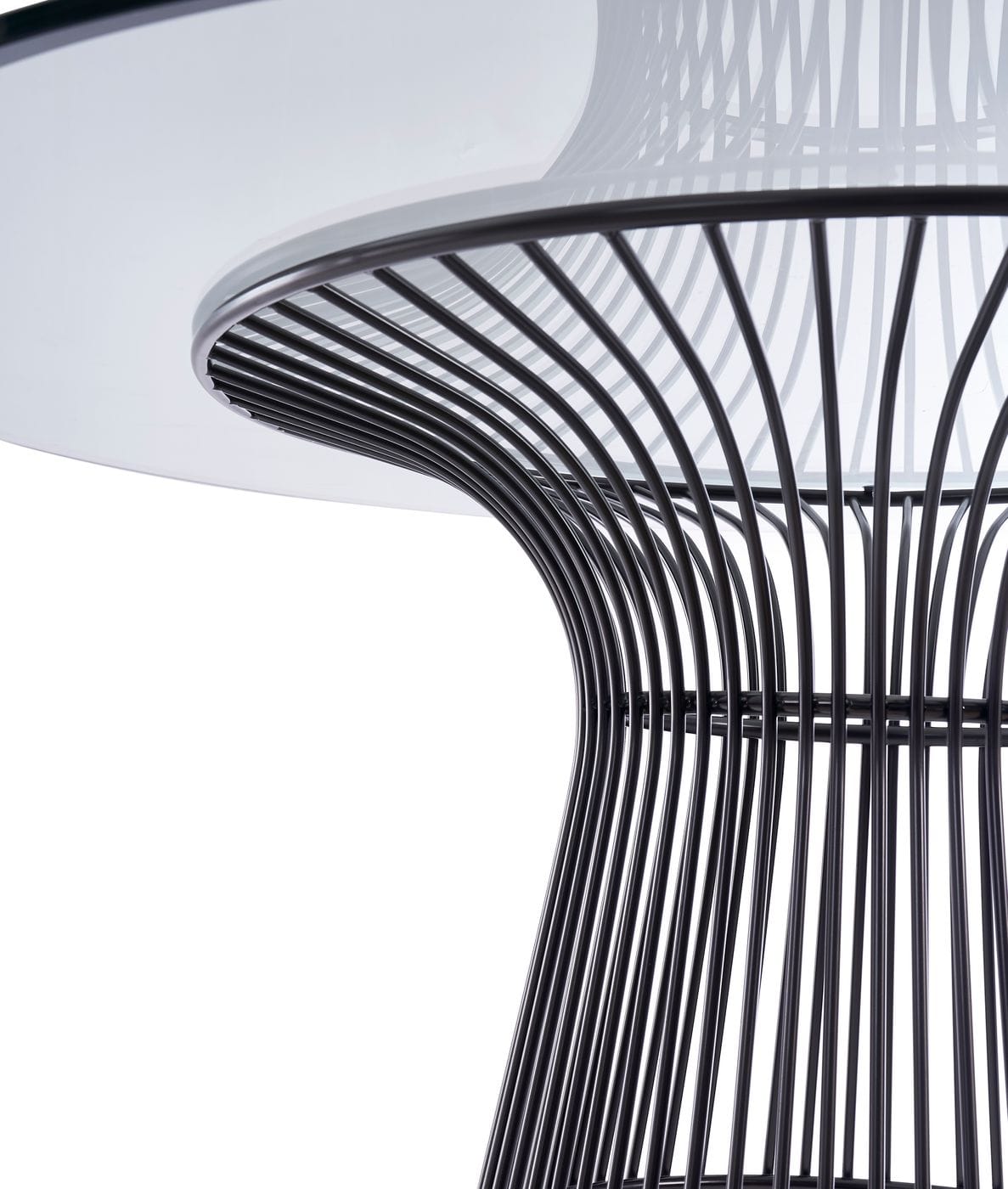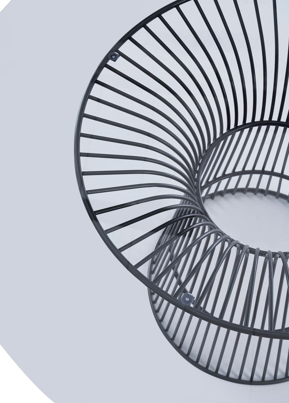 The sunburst pattern that is vectoring around this lovely round dining table in a beautiful black stainless-steel. The grey tempered glass top contrasts the black metal to create extreme visual interest. Pair with the Chandler Chairs to make a perfect match.