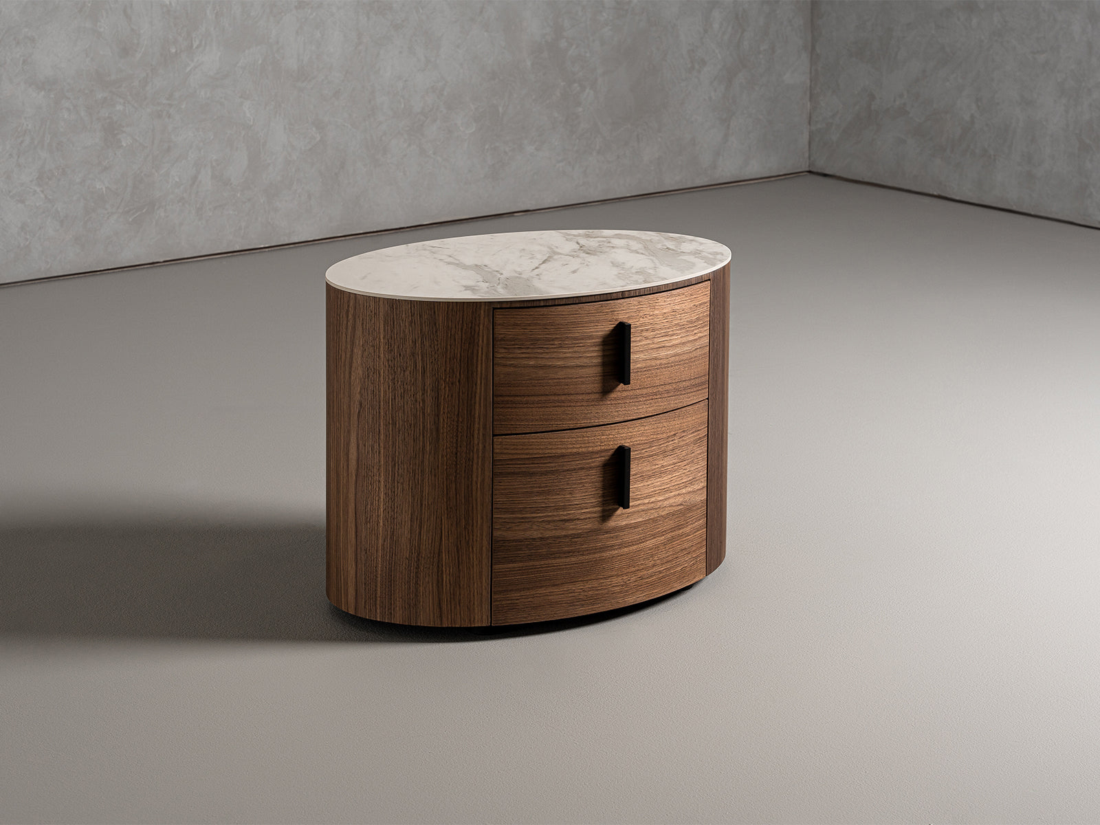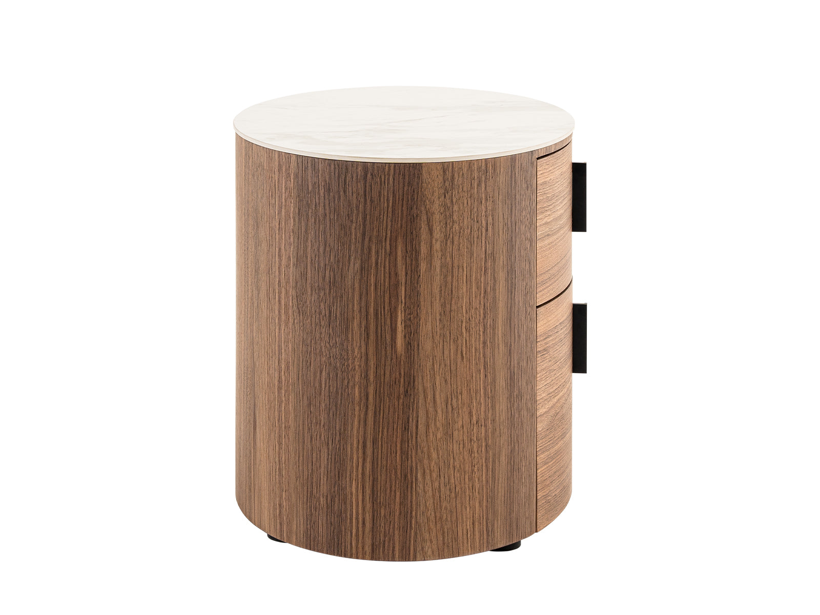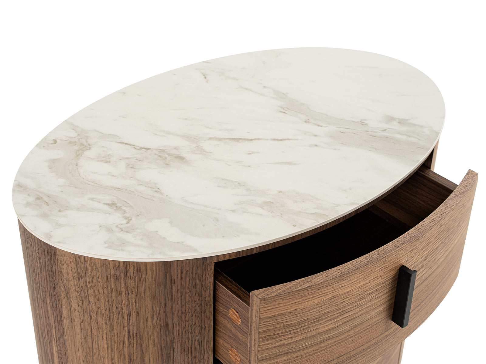 The Modrest Chelton Oval Nightstand is a gorgeous example of Mid-Century design. The curved walnut veneer silhouette extends to the floor, flush with the rest of the nightstand. A white ceramic top with an oval shape finishes the top of the piece. Two walnut veneer faced drawers have black vertical handles and can handle all your bedroom needs.