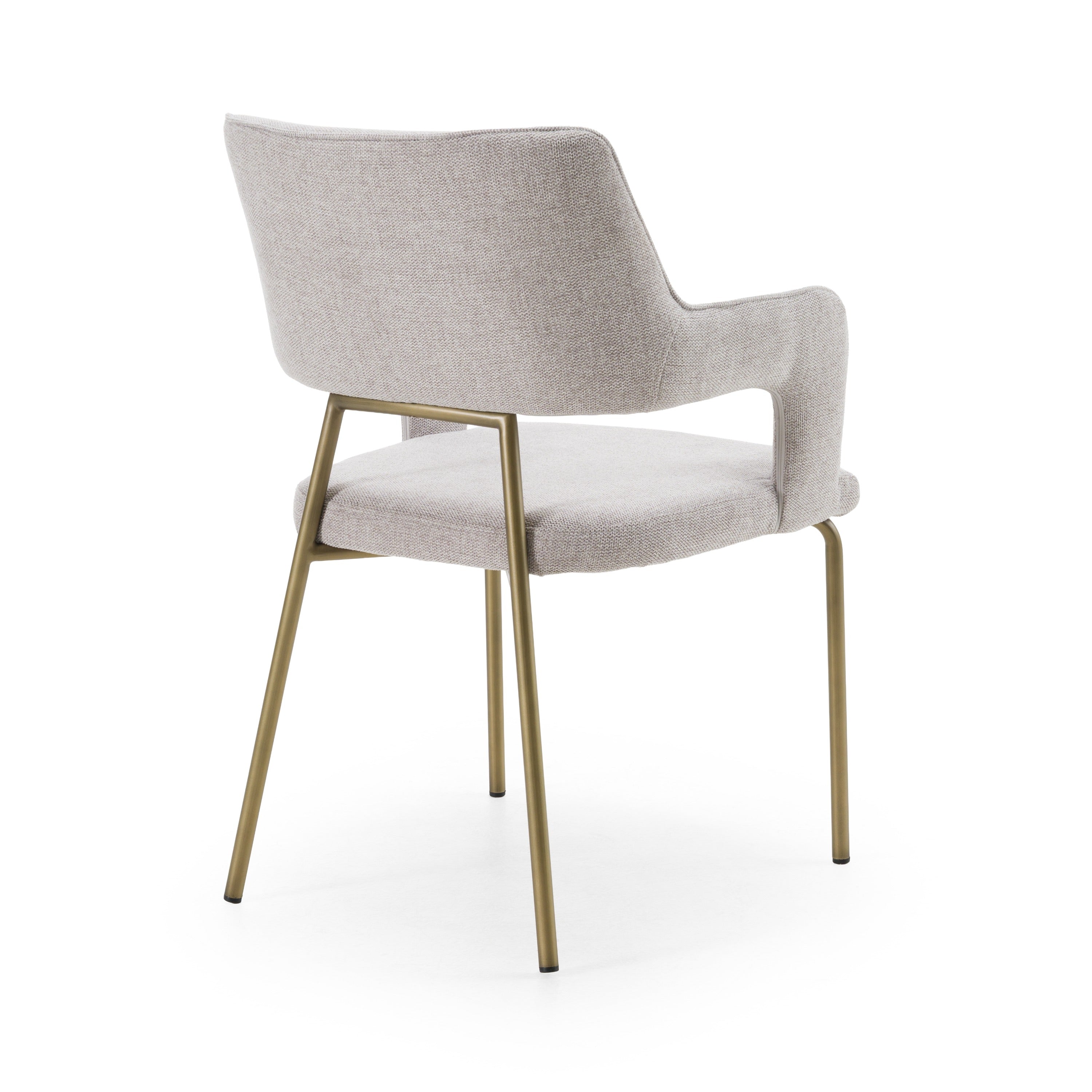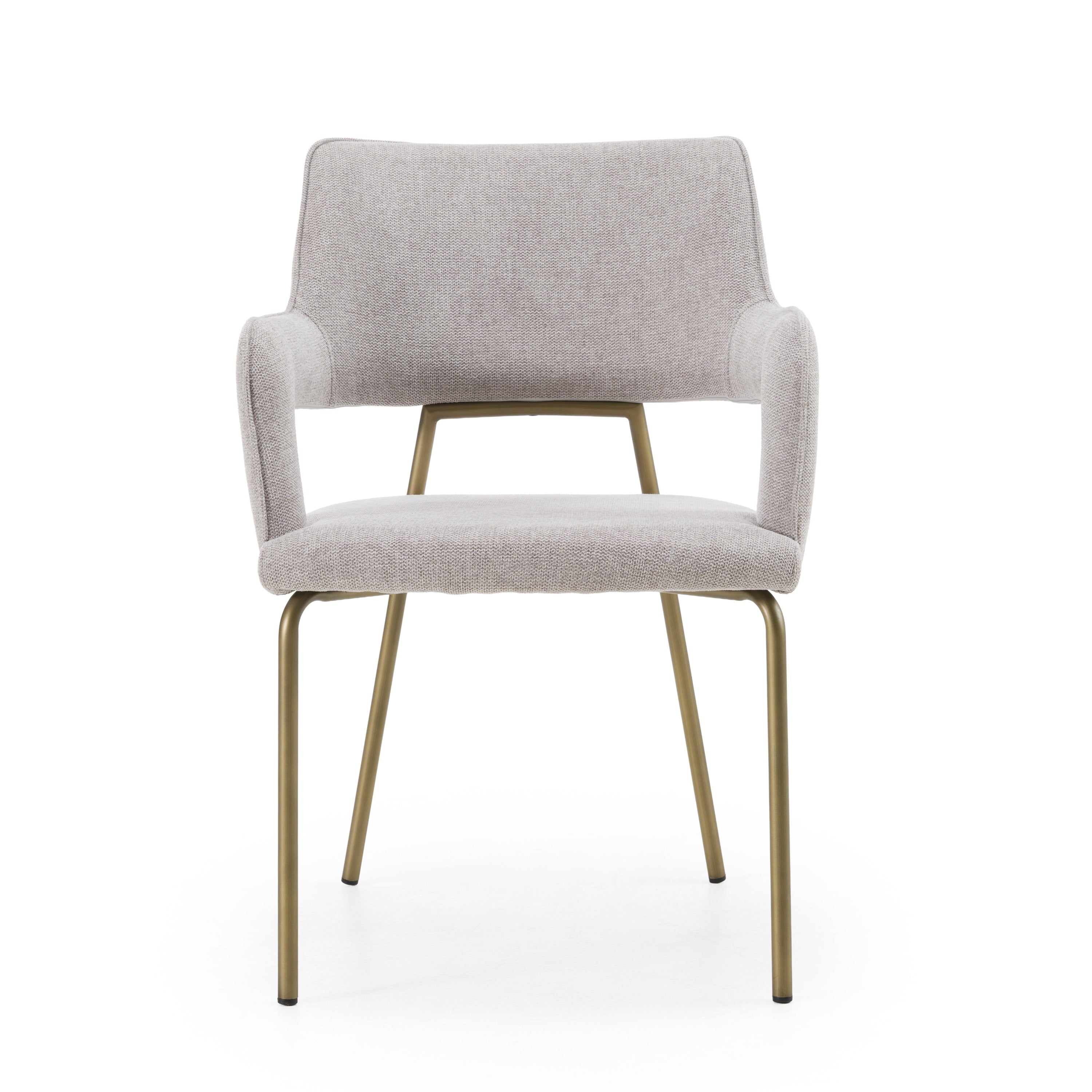 The Modrest Childers Dining Chair showcases a chic modern aesthetic with its soft grey fabric upholstery and sleek antique brass legs. Its ergonomic design features gentle curves and supportive armrests, creating an inviting seating option for any dining space. The combination of contemporary fabric and vintage-inspired metal adds a touch of sophistication and warmth, making it a versatile piece that complements various interior styles. This chair is perfect for enhancing your dining experience with both comfort and elegance.