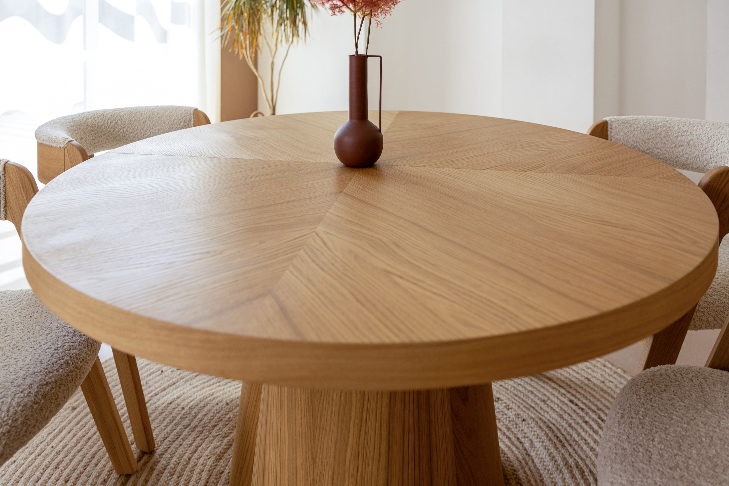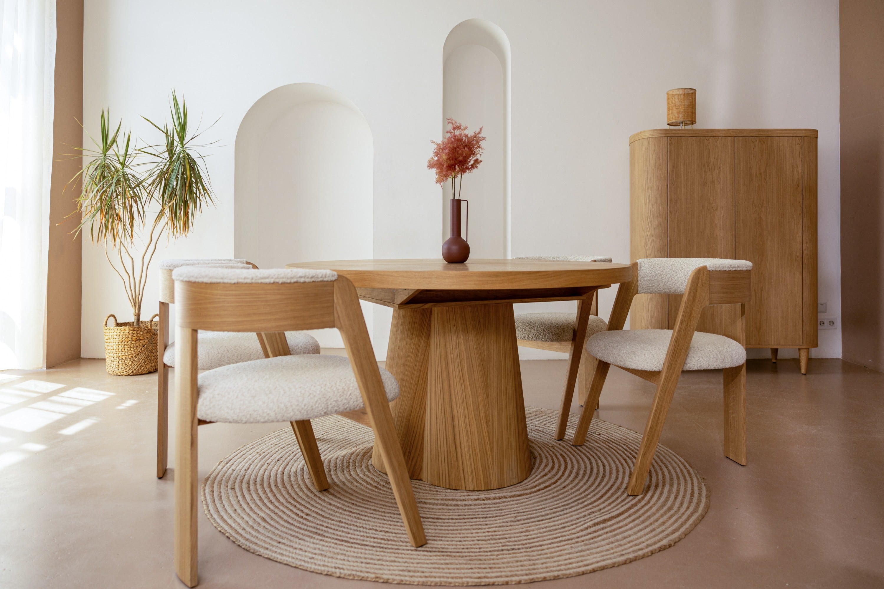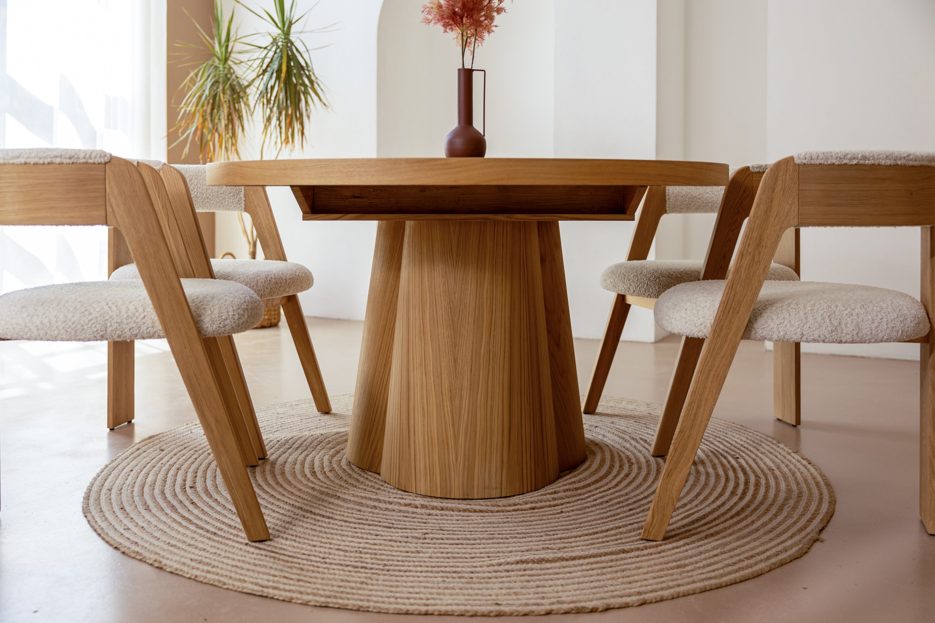 The Modrest Cloud Modern Natural Oak Extendable Dining Table is a masterpiece of contemporary design and elegant craftsmanship. Its natural oak veneer top exudes warmth and sophistication, effortlessly expanding with a seamless butterfly leaf to accommodate larger gatherings. Anchored by a striking pedestal base, this table embodies a sense of both solidity and airy grace, inviting a tranquil yet refined ambiance to your dining space. A perfect blend of form and function, it transforms everyday meals into luxurious moments, setting the stage for memorable dining experiences in a modern, stylish home.