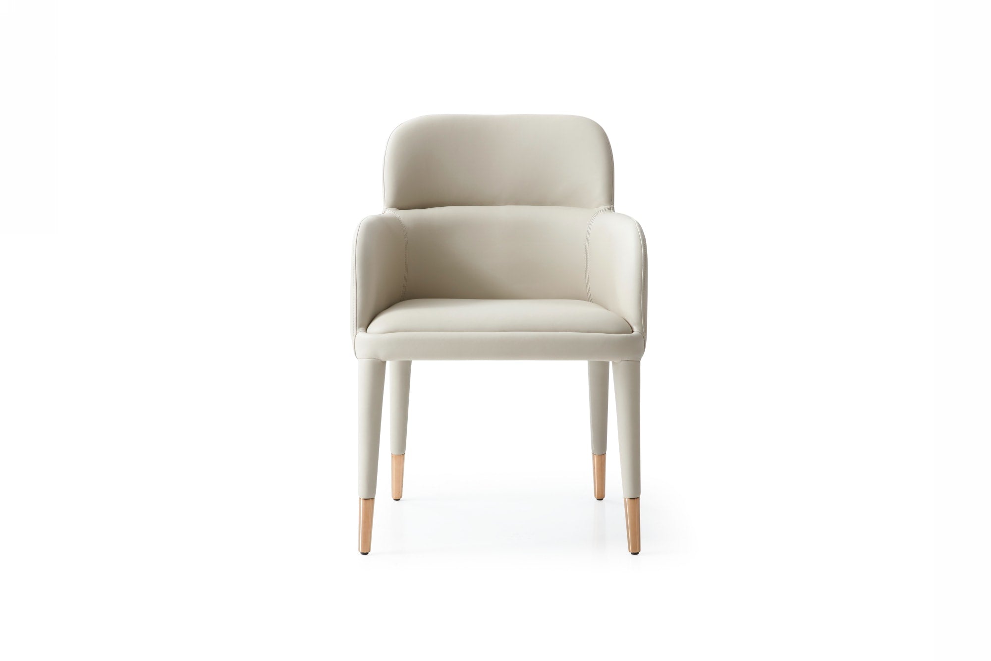 Subtle, and fashionable, the cortina dining chair sits on tapered legs, that are covered in bonded leather and capped with polished rose gold. The seat and back are fully upholstered in beige bonded leather with drop arms, that curve around the body, and a single horizontal channel tuft across the back front. The chair exudes class and sophistication. Easy to clean and maintain, and easy on the eyes.