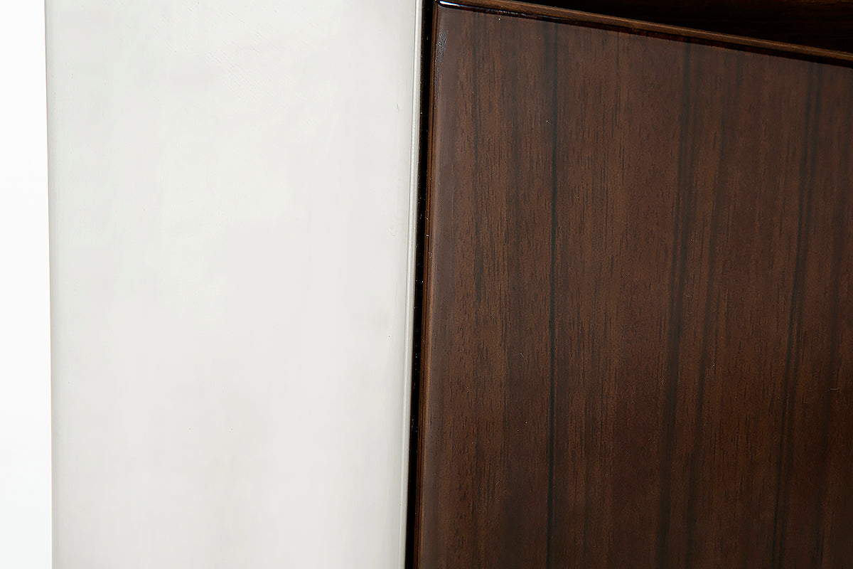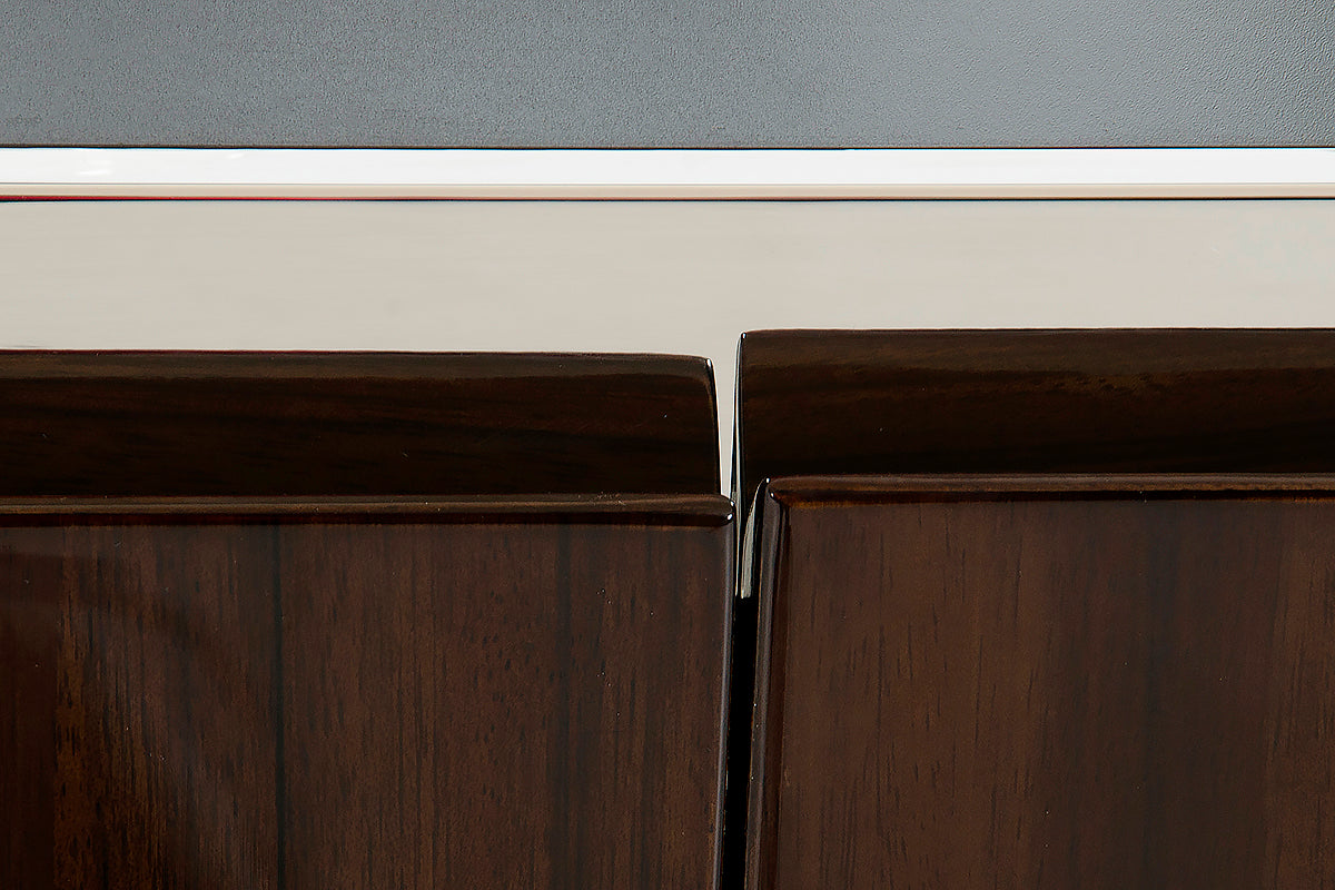 The Modrest Courtland Modern Golden Teak Buffet showcases a streamlined design featuring a smooth rectangular black tempered glass top with high gloss golden teak veneer frame. This 4-door buffet features stainless steel accents on the borders. It requires no assembly and measures W79" x D20" x H32".