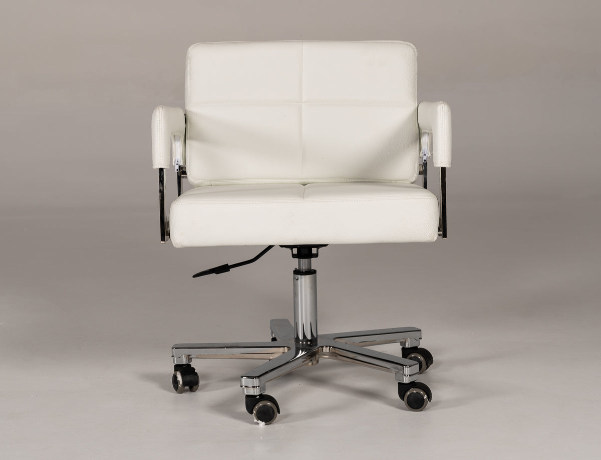 The Modrest A508 Modern White Bonded Leather Office Chair features a wide-spaced seat design in white leatherette upholstery. It features an adjustable seat height (20"-24") and cross over lateral stitching on the back and seat. The arms are covered with white leatherette that can be unzipped. Measuring W22" x D20" x H29", a 5-star chrome base with rolling castors provide sturdy support and ease of movement.