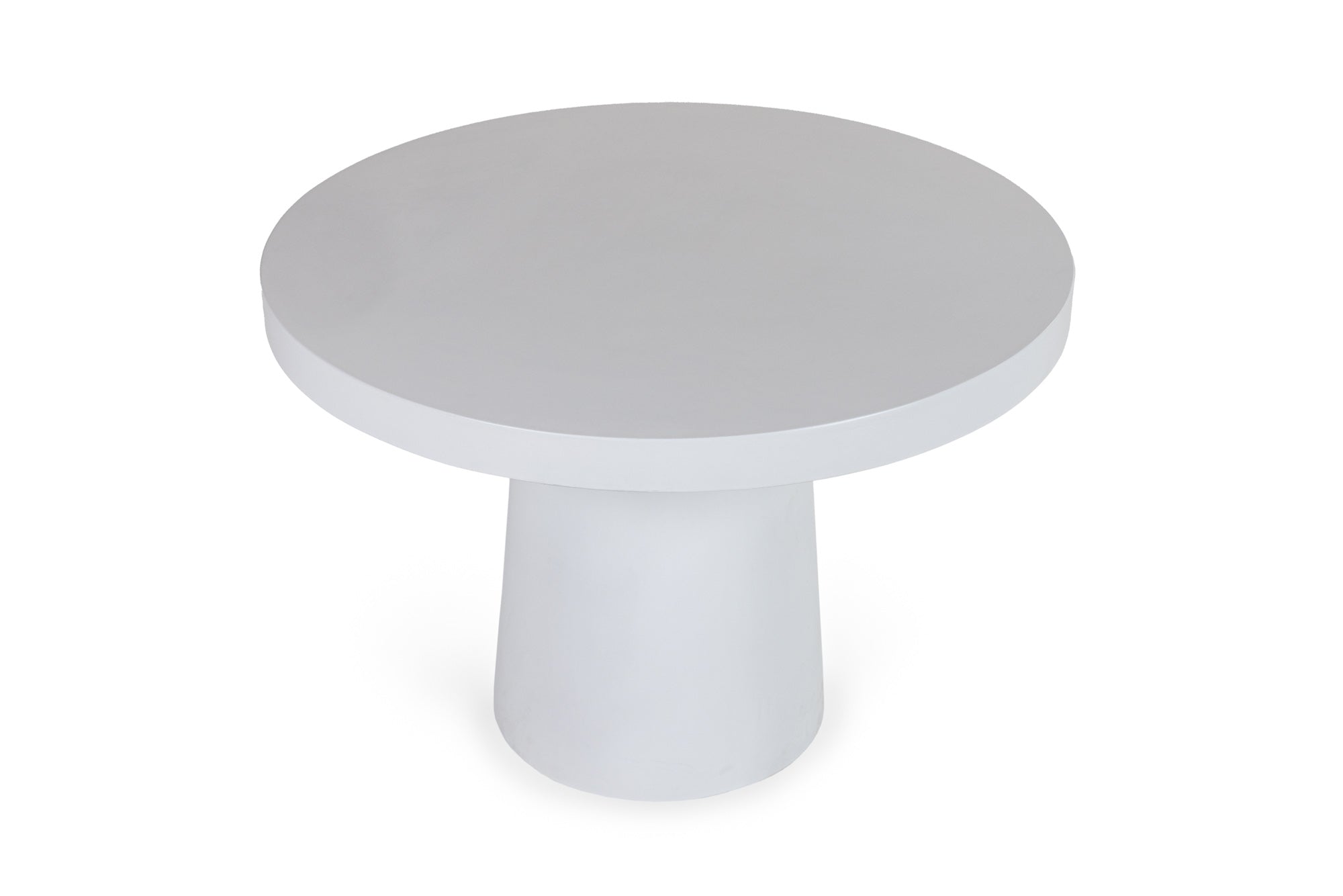 The Modrest Desoto is a modern round dining table that exudes minimalist elegance. Crafted from sleek white concrete, it features a smooth, circular tabletop supported by a conical pedestal base, creating a striking visual contrast. Its clean lines and contemporary design make it a perfect centerpiece for any dining space, seamlessly blending with various decor styles. This table accommodates up to 4 people, ensuring ample room for gatherings and intimate dinners.