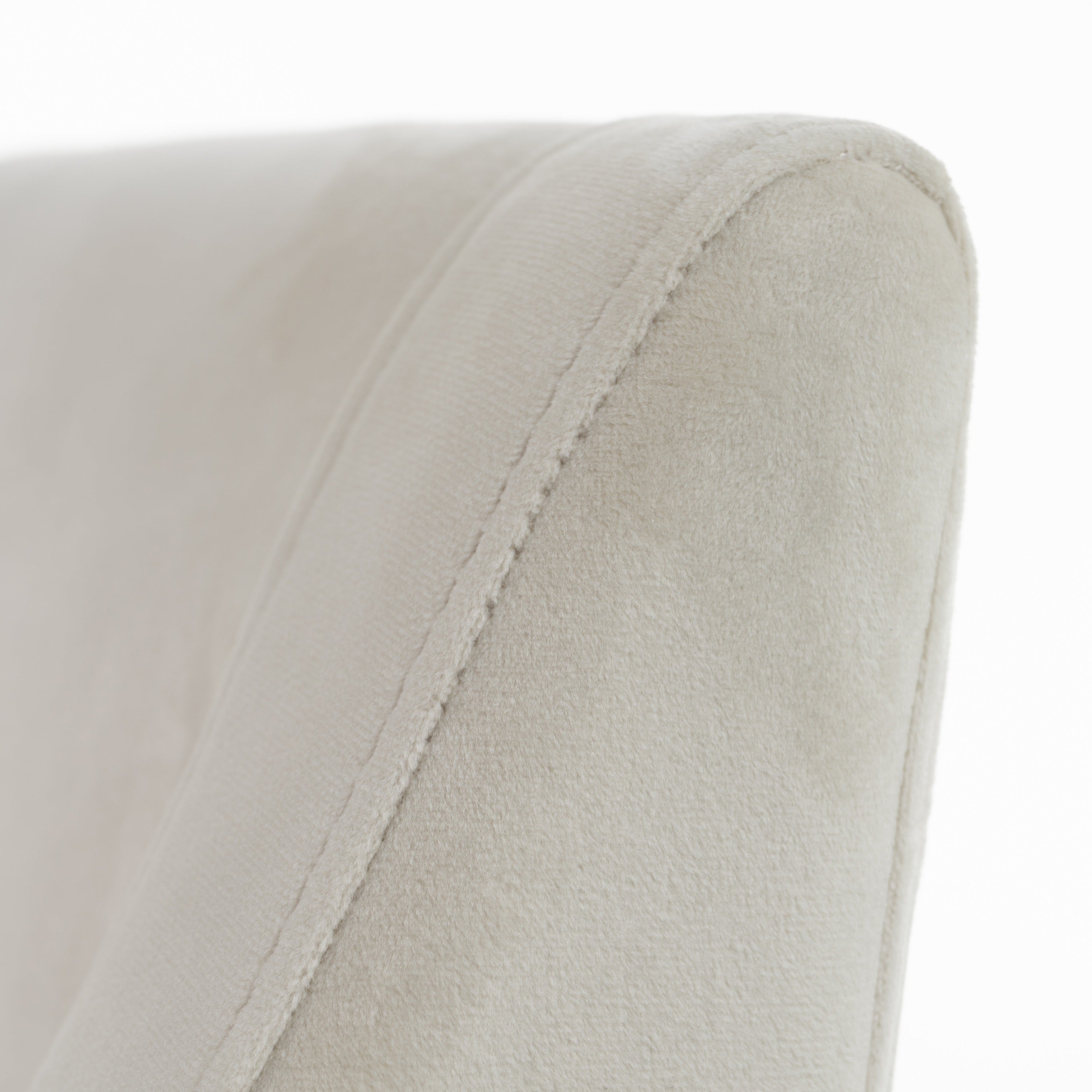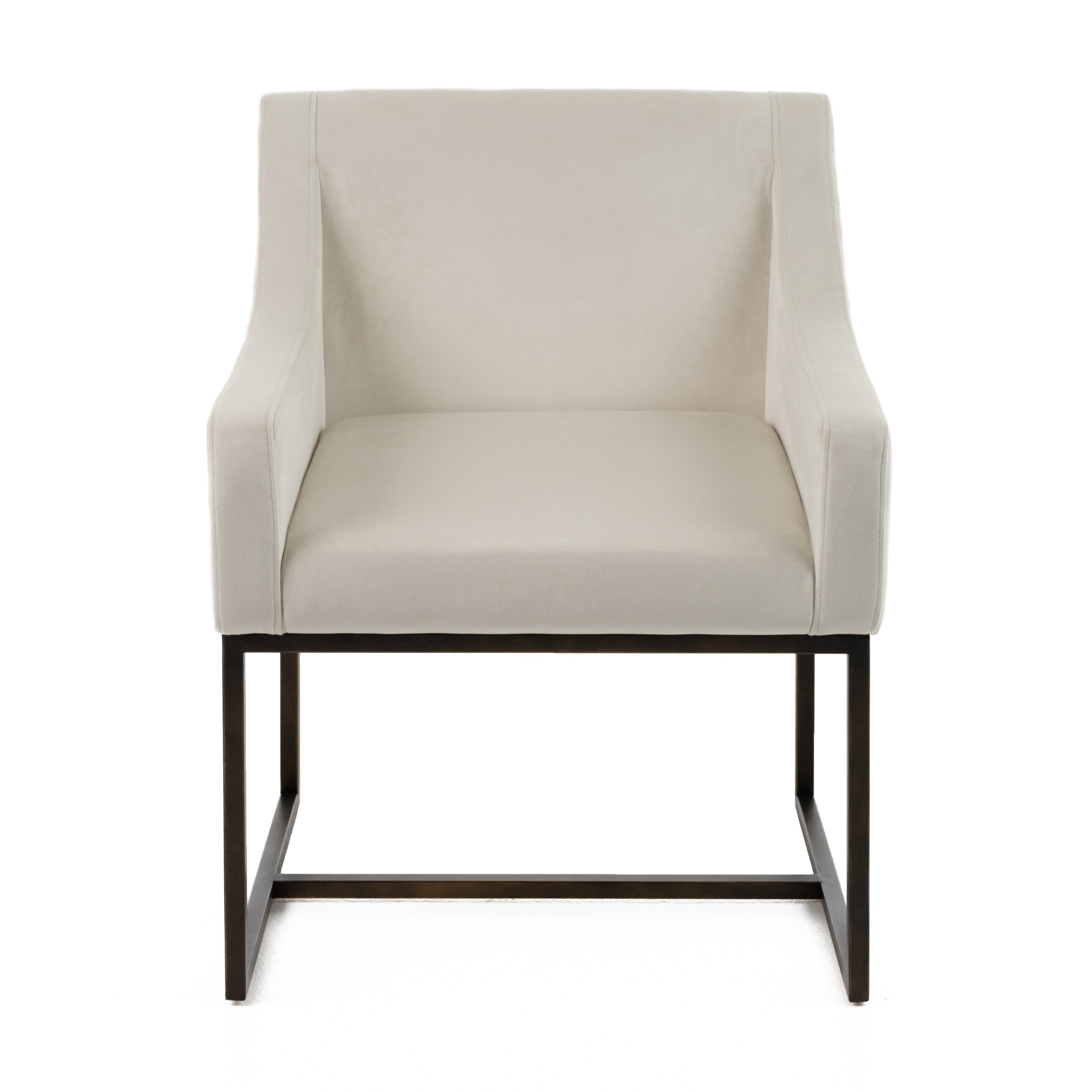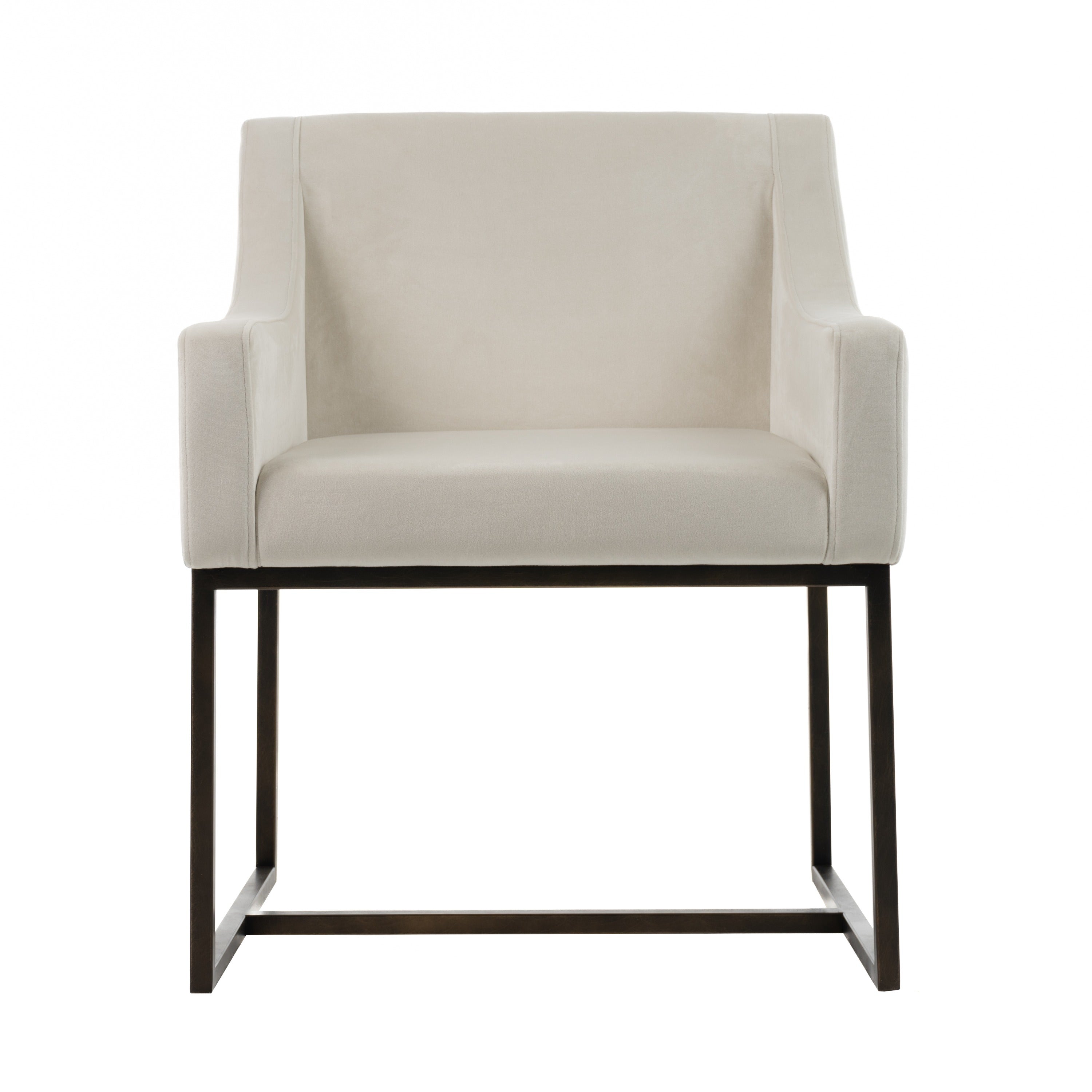 The Elijah Dining Chair is a beautiful modern contemporary piece of furniture. The squared slope arms match height perfectly with the low back of the chair, creating a fully embracing silhouette. Upholstered in an beige velvet fabric, this chair is comfortable and stylish. The antique brass finished legs have modern lines and contrast the soft fabric. These versatile chairs can be paired with any style and look right at home.