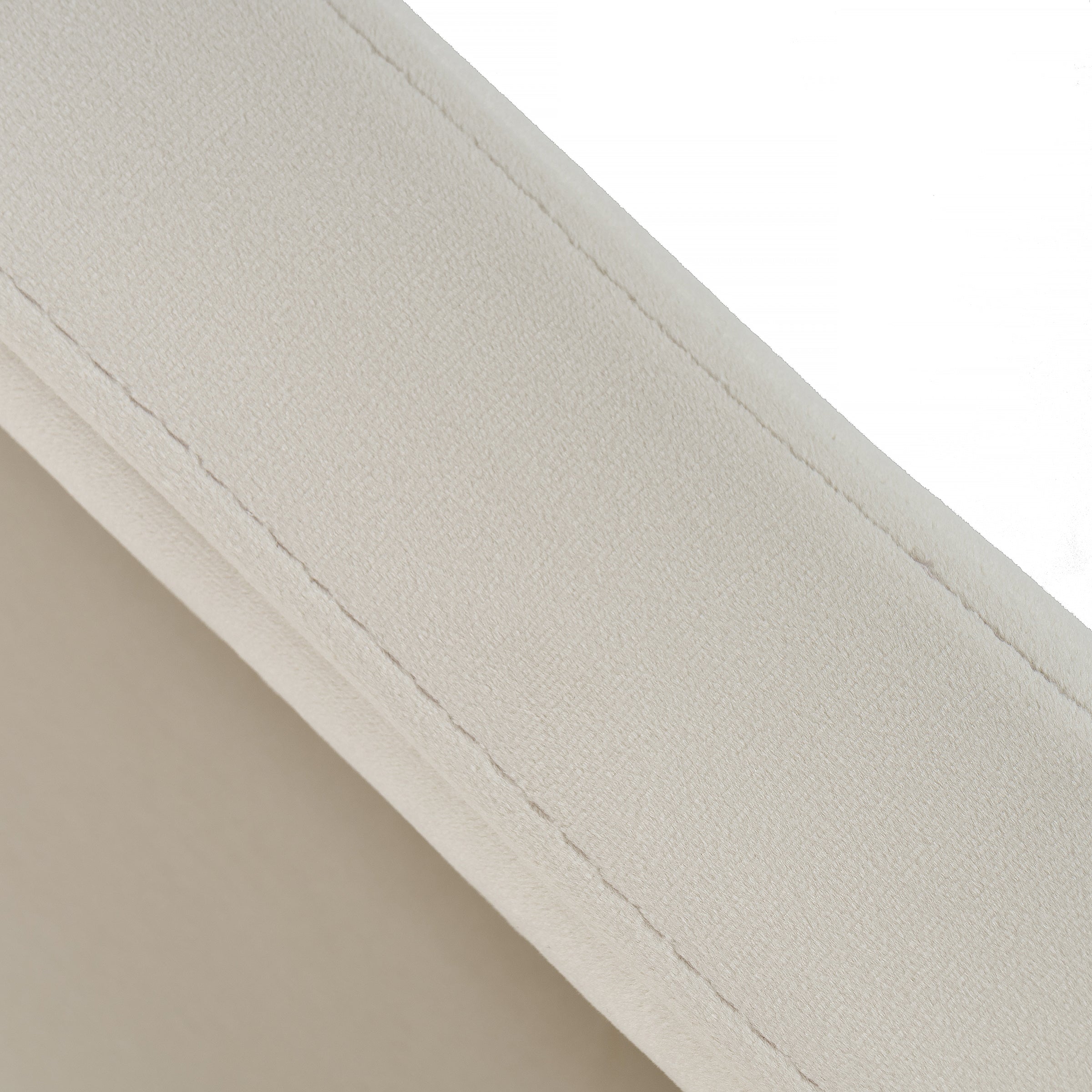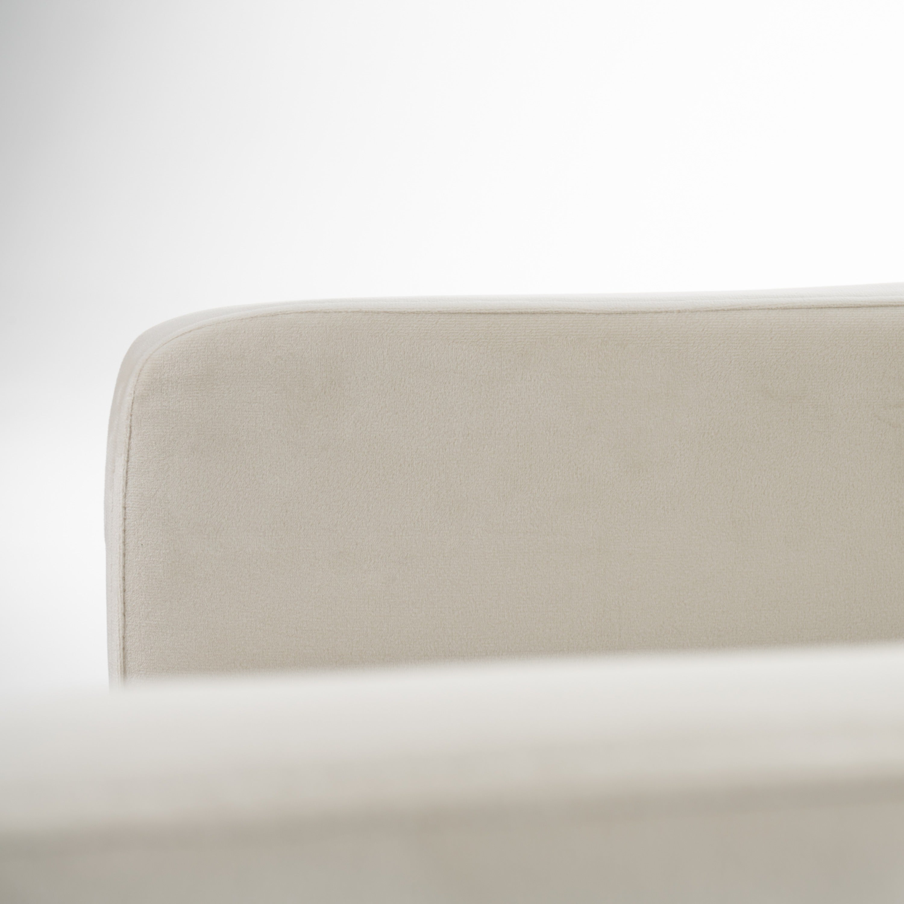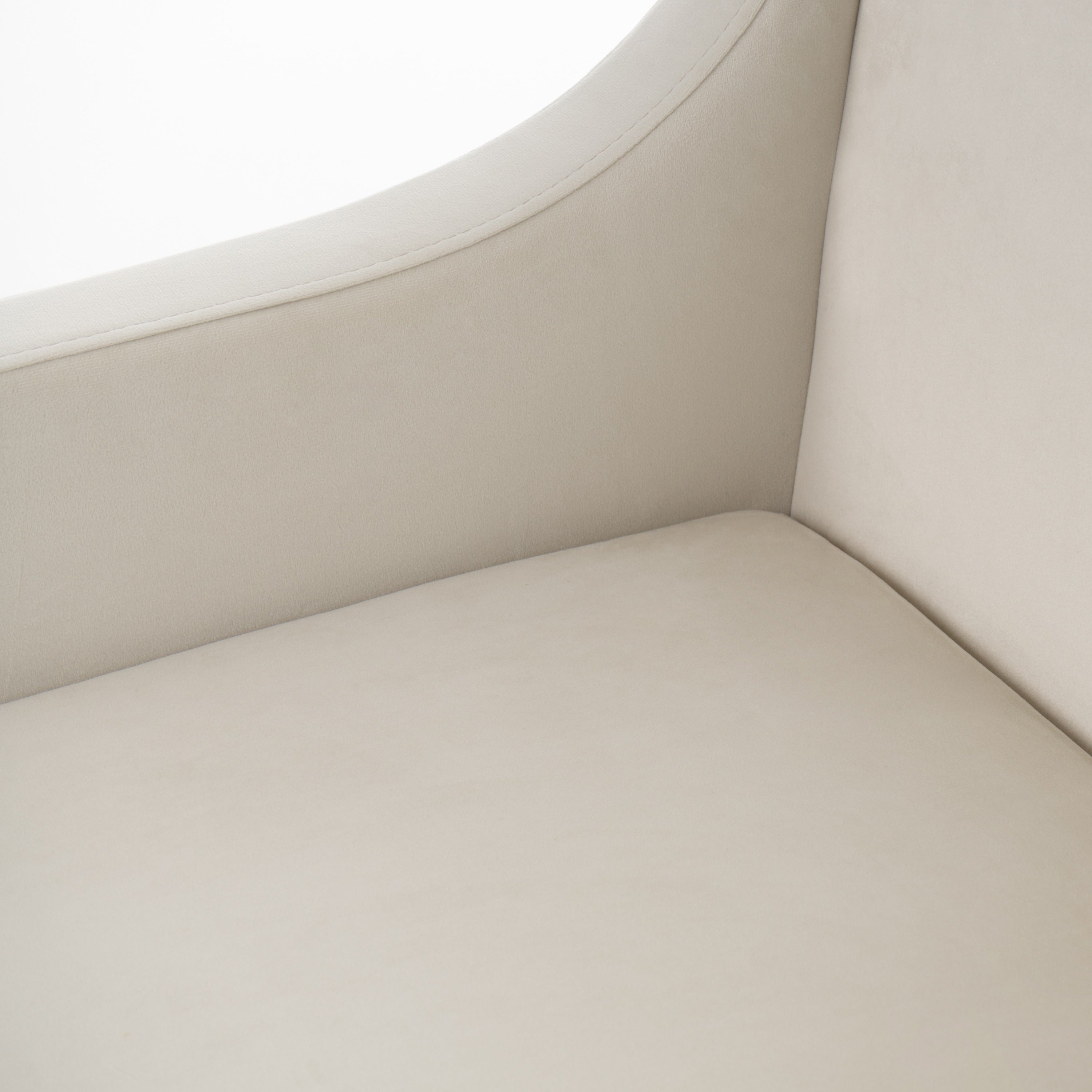 The Elijah Dining Chair is a beautiful modern contemporary piece of furniture. The squared slope arms match height perfectly with the low back of the chair, creating a fully embracing silhouette. Upholstered in an beige velvet fabric, this chair is comfortable and stylish. The antique brass finished legs have modern lines and contrast the soft fabric. These versatile chairs can be paired with any style and look right at home.