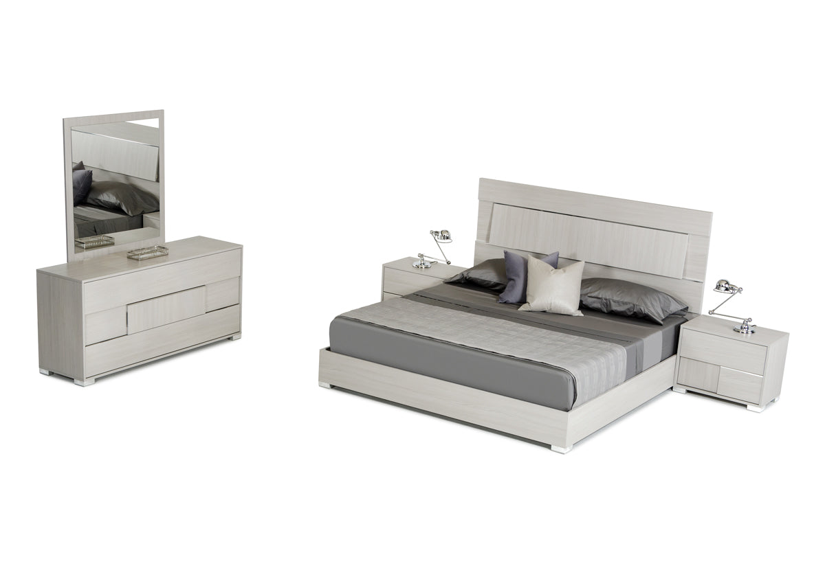 The Ethan bedroom set was crafted in Italy for perfection. A gentle yet striking composition is created using geometrical pieces layered onto one another for visual enhancement. The headboard features these layered pieces including a raised rectangular piece accented by LED lights. A soft ash grey 3D matt finish lightens the Ethan bedroom set and is enhanced with chrome finished accents. Matching nightstands, dresser and mirror all mimic this design for a unified composition.