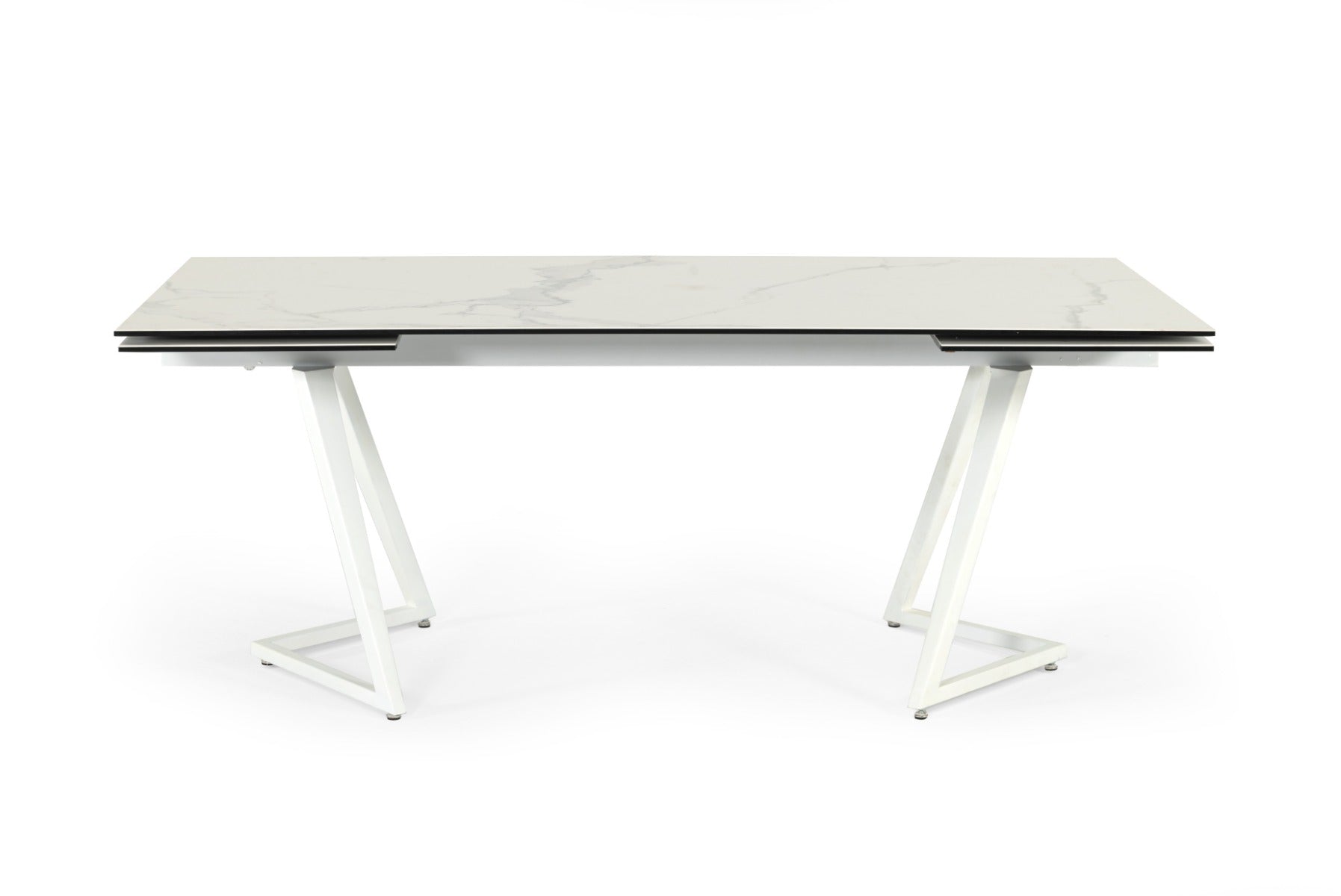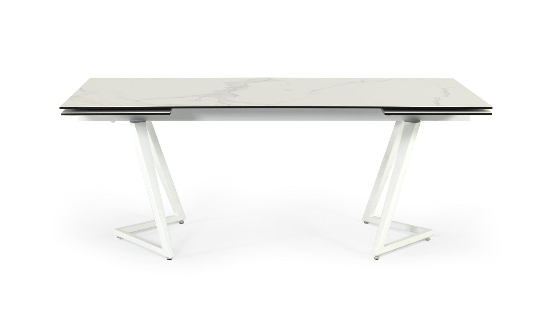 The Farrell Dining Table is a stylish modern piece that adds character to your dining space. This contemporary piece is finished in white ceramic glass that makes the top shine. The double triangular base is architectural and adds dimension and texture. Pair with a bold-colored chair and patterned rug for a perfect dining experience.