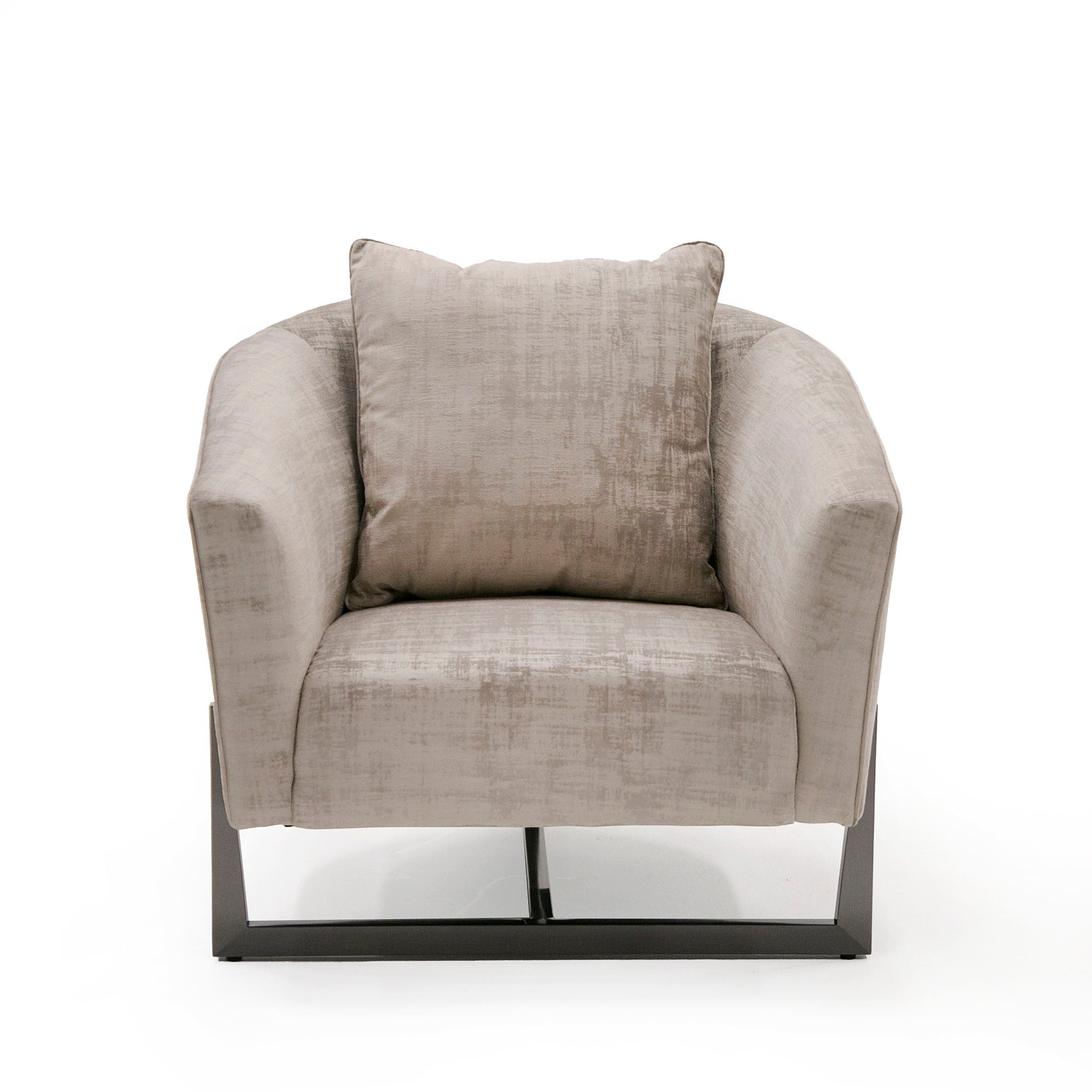 Our Modrest Forbis Accent Chair has a sloped and stylish frame to offer. This soft upholstery of the contemporary chair is perfect in any home setting. Luxury awaits you in the folds of this beautiful accent chair. The dark bronze cross metal provides maximum support.