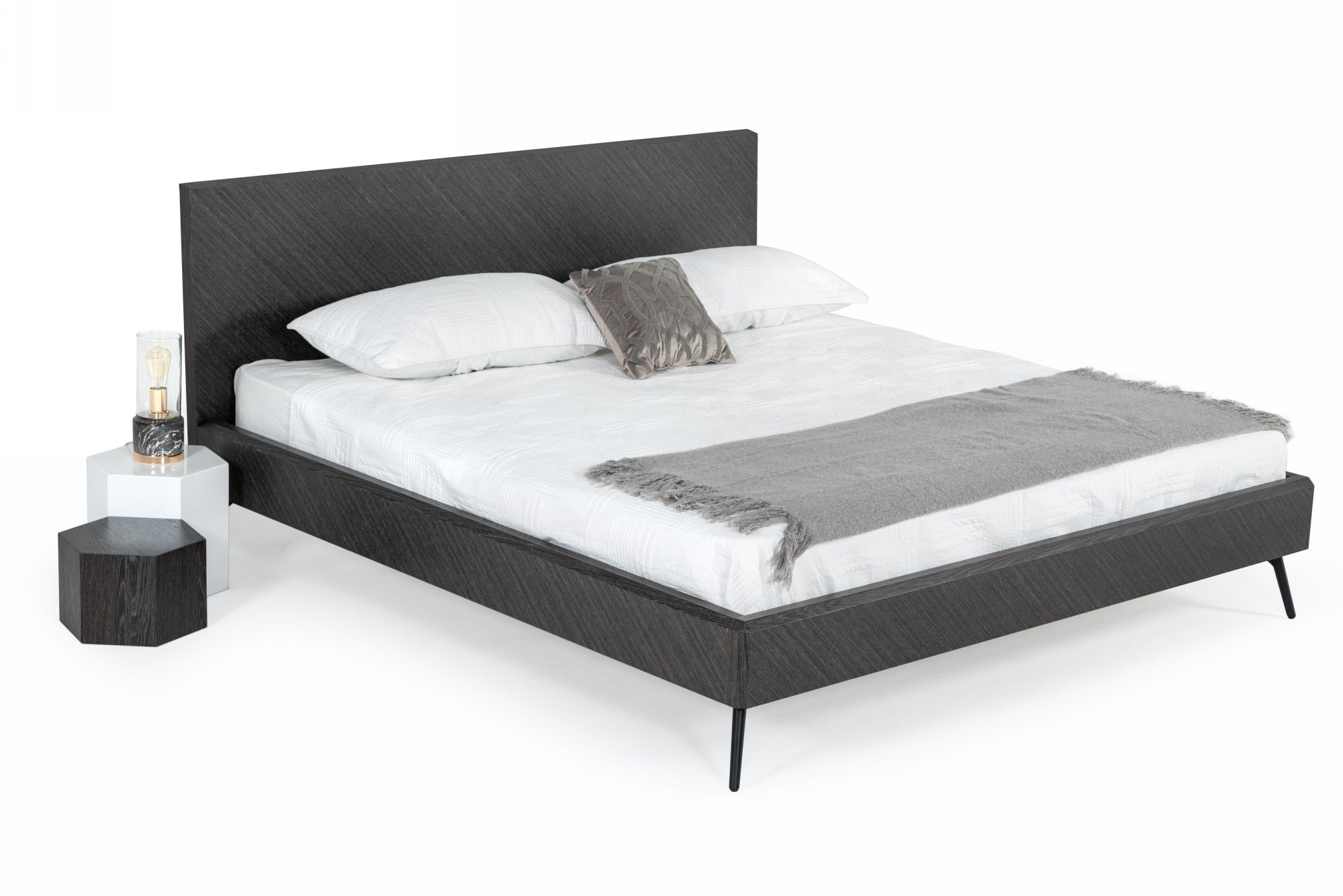 - Grey Elm veneer finish on headboard and bed rails