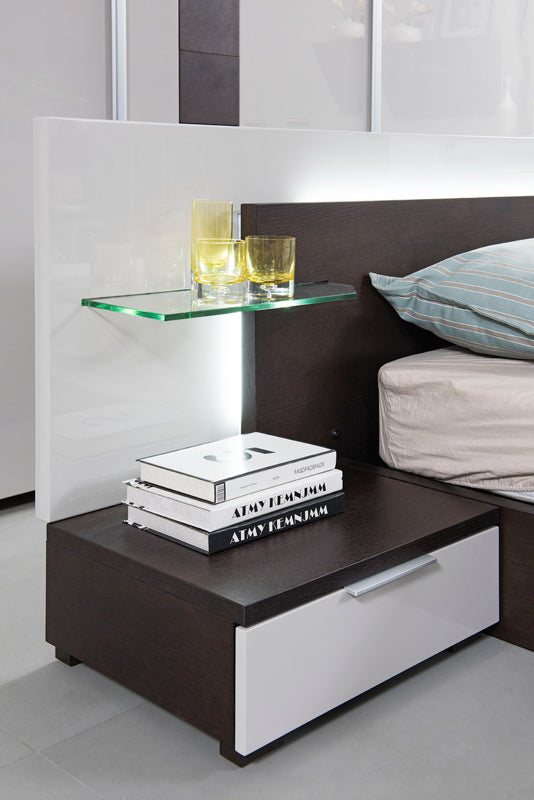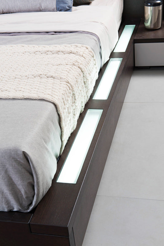 The Modrest Gamma Contemporary Brown Oak Bed with Storage has a multi-purpose design featuring air-lift slats for under-bed storage. It is fitted with soft-closing single drawer nightstands on both sides and a glass shelf on the left facing side. Finished in a sleek brown oak veneer, this contemporary bed has light grey accents and a lighted headboard and side rail.