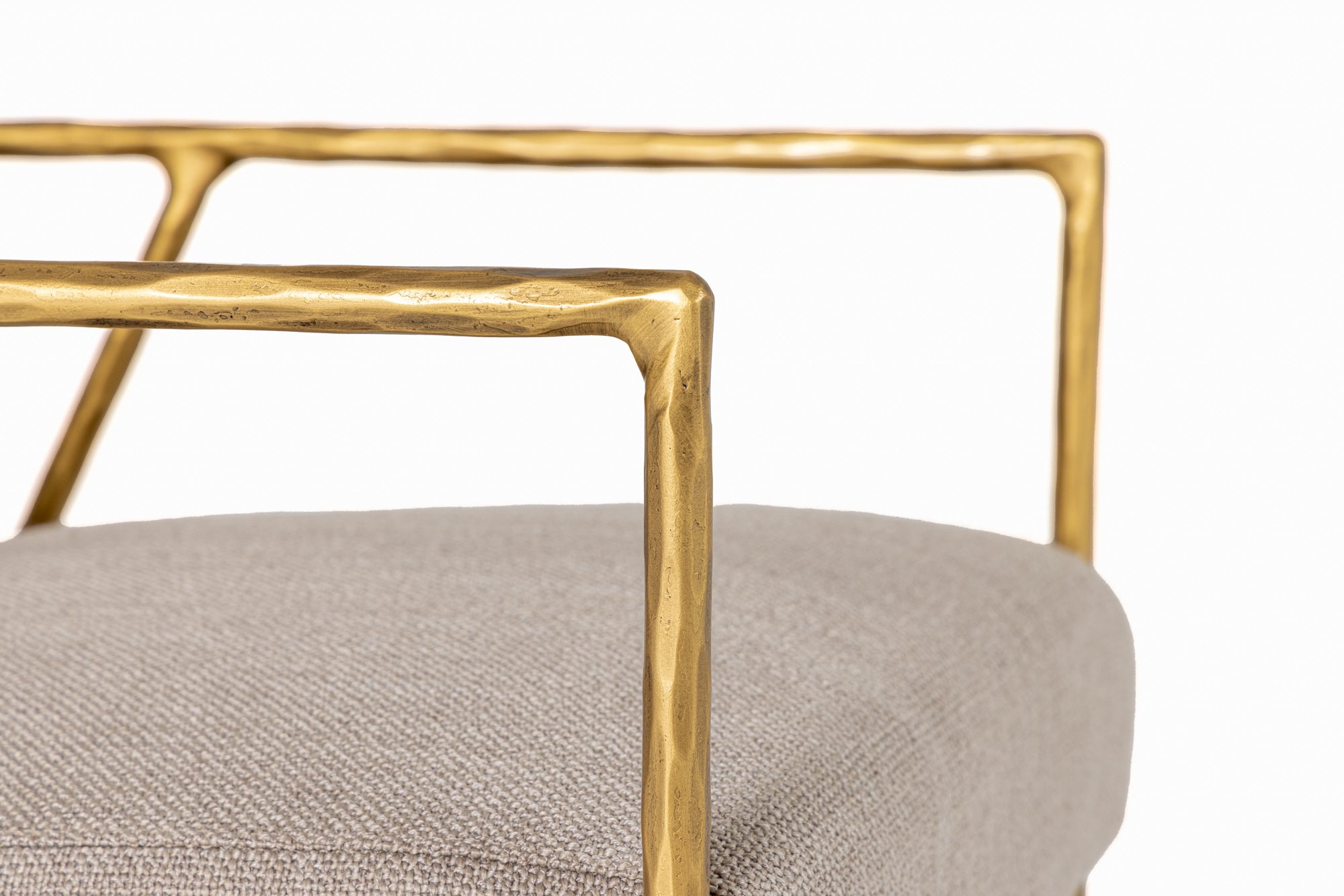 The Modrest Gibbons Accent Chair showcases a chic, modern design featuring a soft beige linen upholstery that exudes comfort and sophistication. Its sleek silhouette is complemented by forged gold accents in the frame, adding a touch of elegance. The minimalist structure makes it a versatile addition to any contemporary space, whether as an accent piece in a living room or a stylish statement in a reading nook. This chair merges functionality with aesthetic appeal, creating a perfect balance for modern interiors.