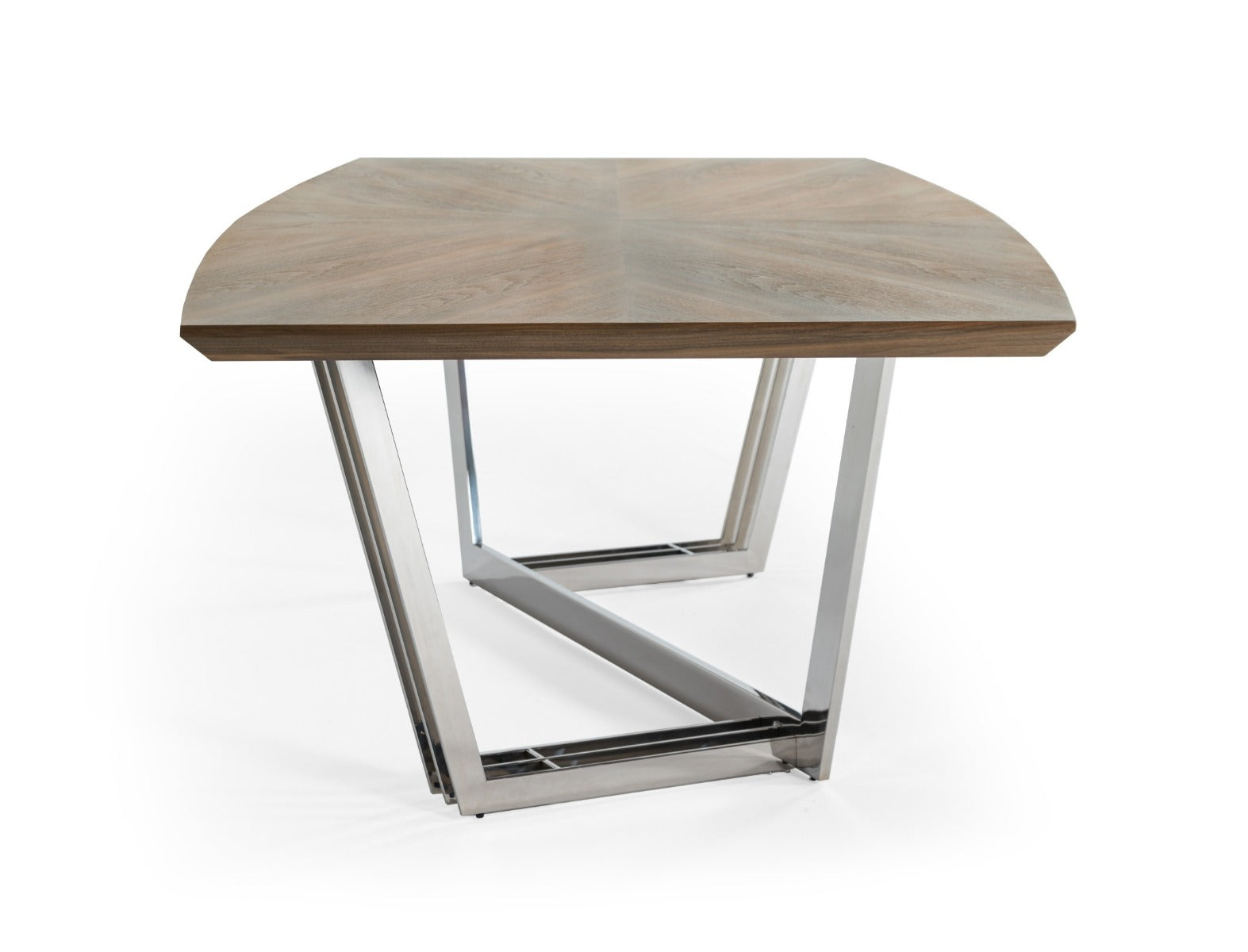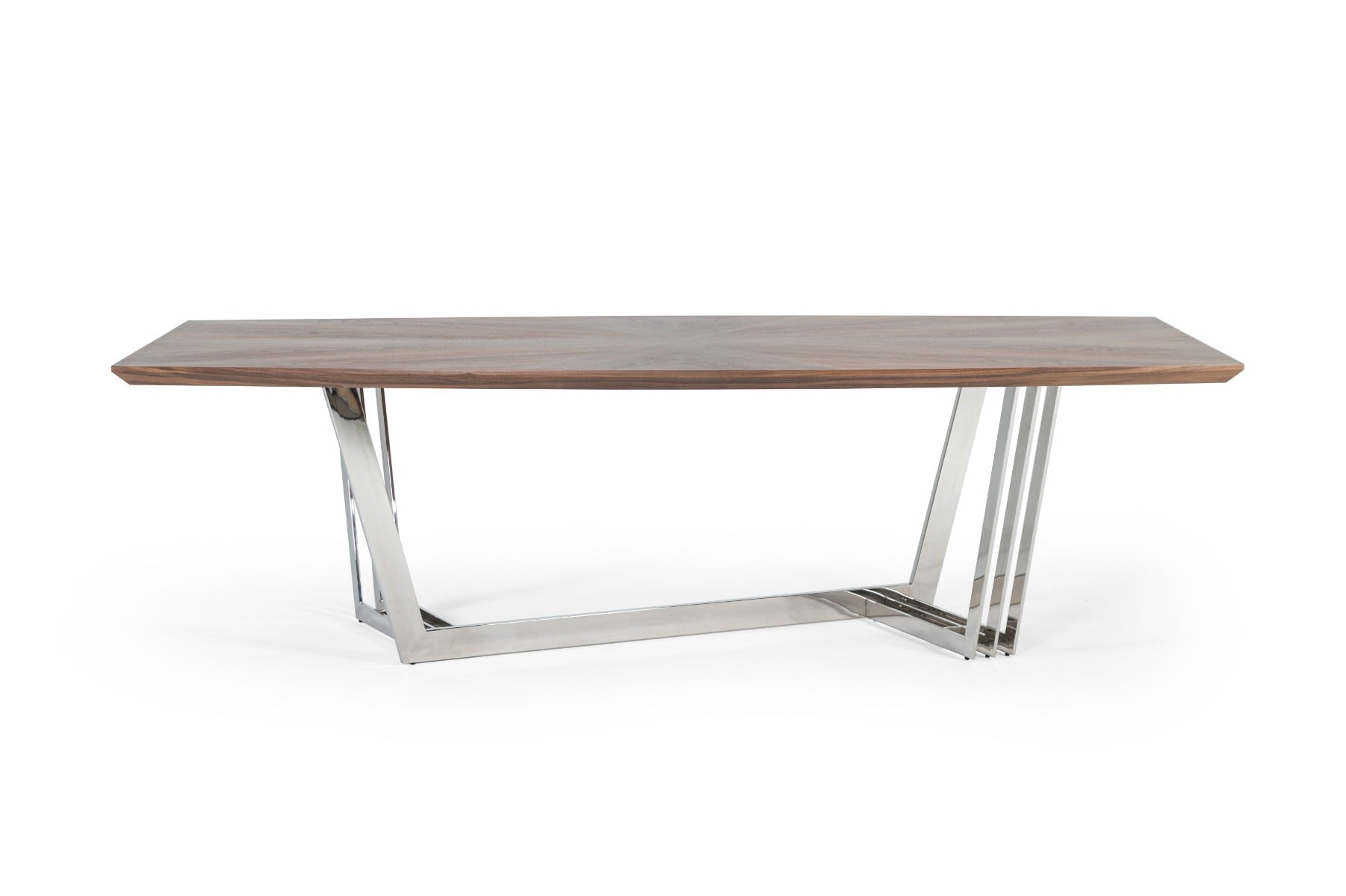 The Gilroy Dining Tables walnut starburst top compliments the Gilroy buffet yet still holds its own. This solid table has a unique stainless steel base with diagonals and a rectangular top.