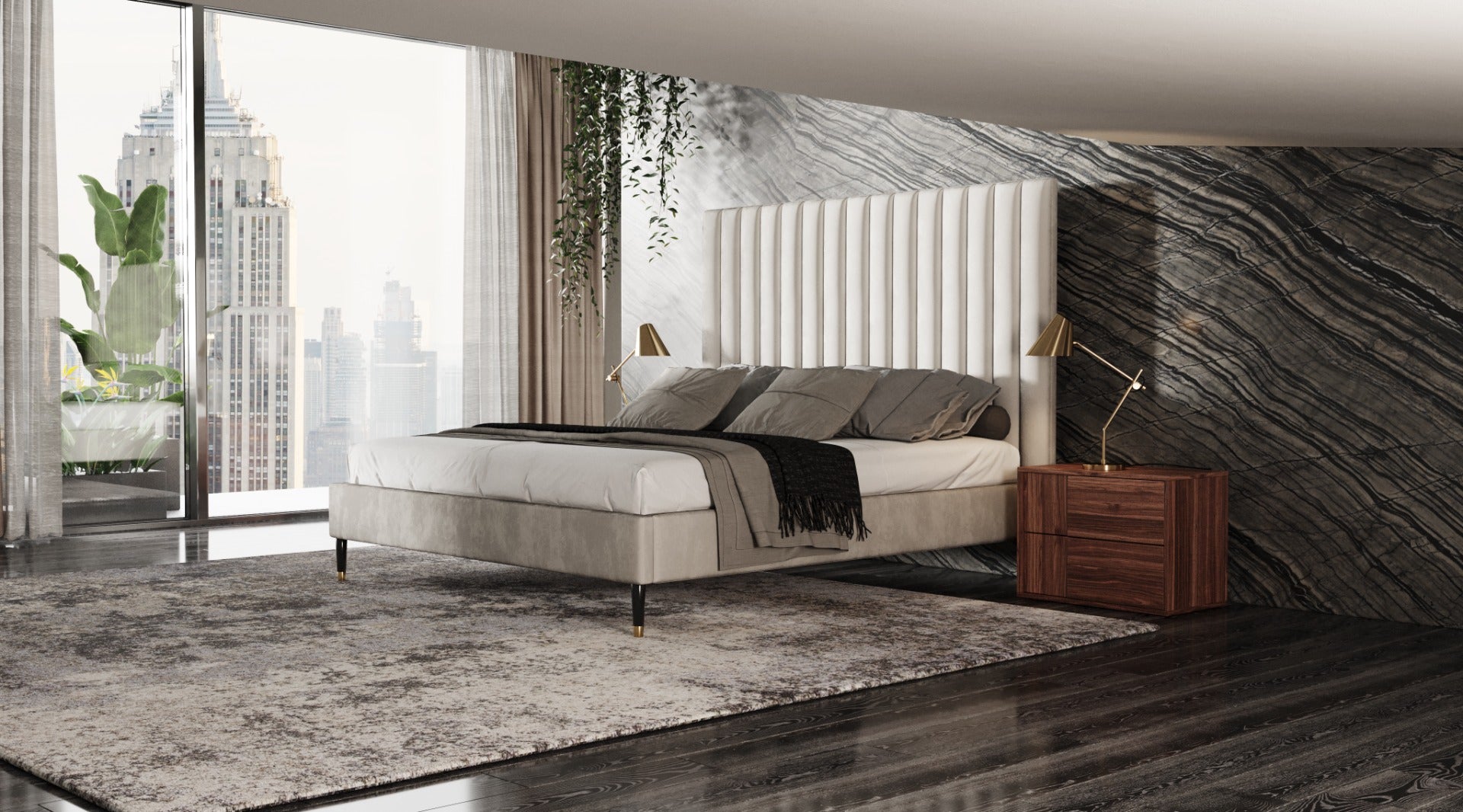Create a simple yet elegant style in your bedroom with the Modrest Hemlock Contemporary White Fabric Bed. Donning a tall headrest with a pleated design in front, it is upholstered in soothing white velvet fabric. Complementing the headrest is a sunken mattress frame with slats to ensure good aeration and to keep the mattress in place even if you move a lot while asleep. This modern bed serves your sleeping needs perfectly and adequately, making your bedroom a quiet resting area. Tapered legs with gold rings on each end provide sturdy support.