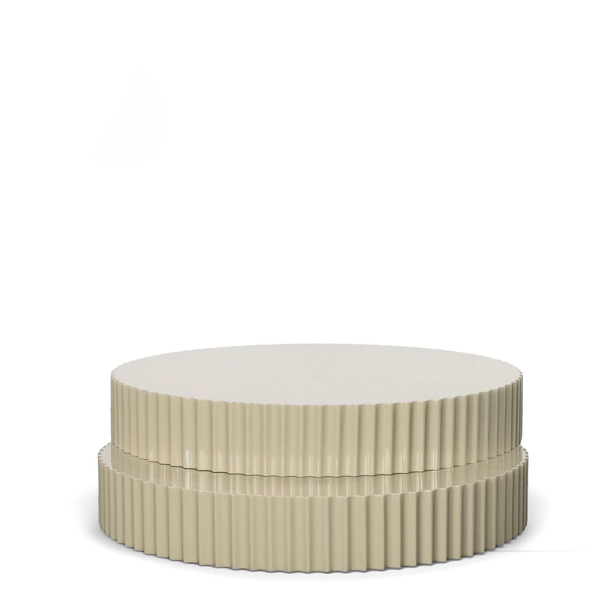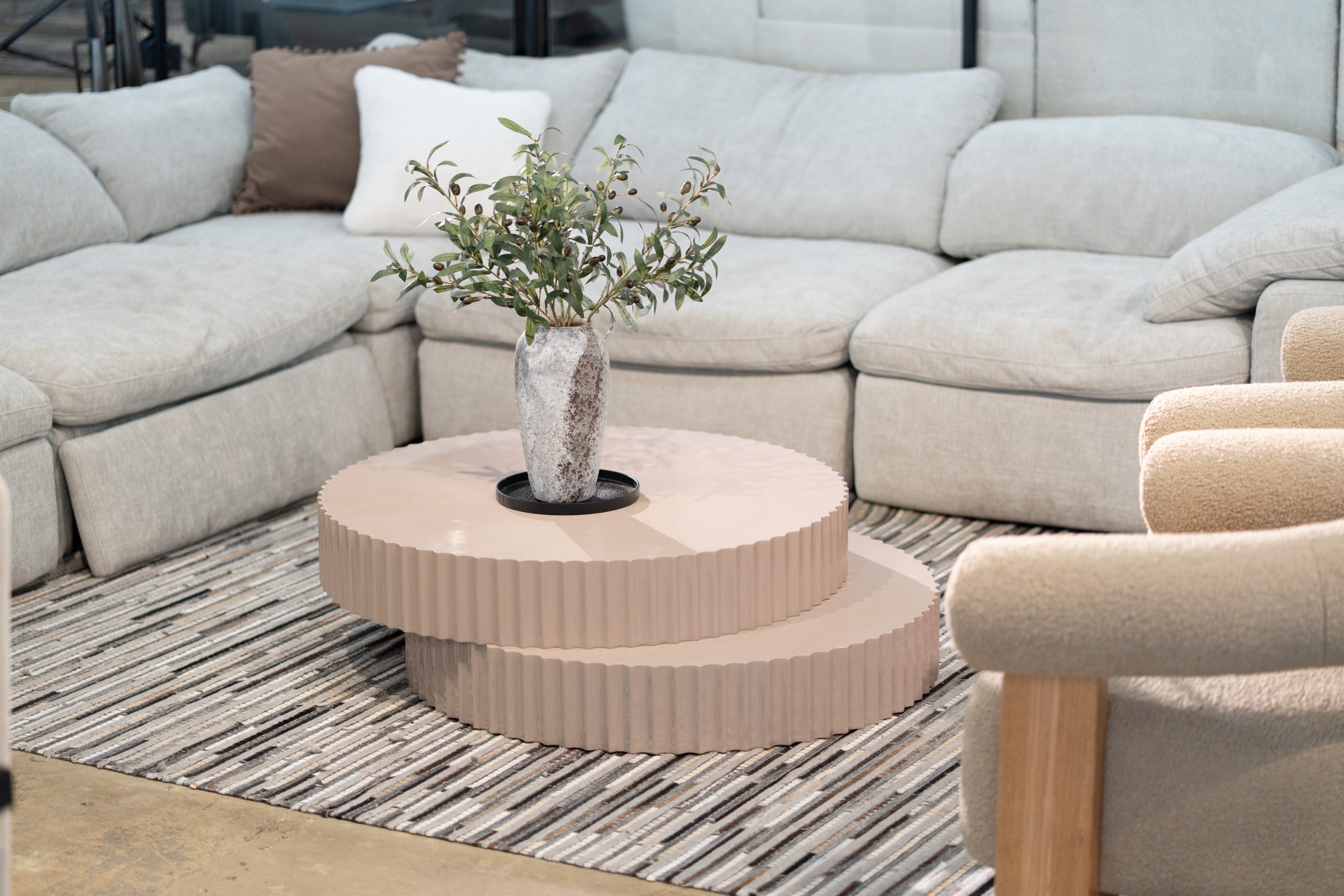 The Jacinto Coffee Table doubles as sculptural art piece that is sure to strike up a conversation. With a glossy taupe grey finish and an enticing section cut that runs through the center. The fluted accents and shifting form further emphasize its distinctiveness, making this option both fashionable and useful.
