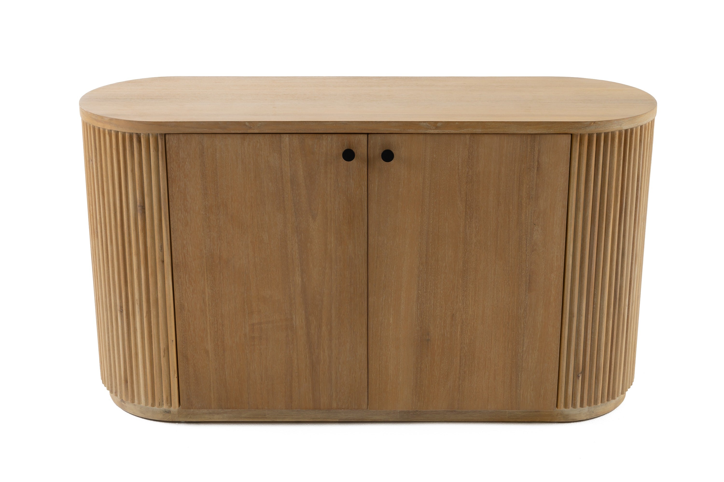 The Modrest Jacobson Modern Natural Acacia Buffet showcases a sleek, contemporary design with a rounded top and elegant ribbed detailing. Crafted from natural acacia wood, it features two doors for concealed storage, enhancing its minimalist aesthetic. The warm, light finish brings a touch of organic warmth to any space, making it a stunning addition to dining areas or living rooms. This buffet blends functionality with style, perfect for displaying decor or storing essentials while adding a sophisticated flair to your interior design.