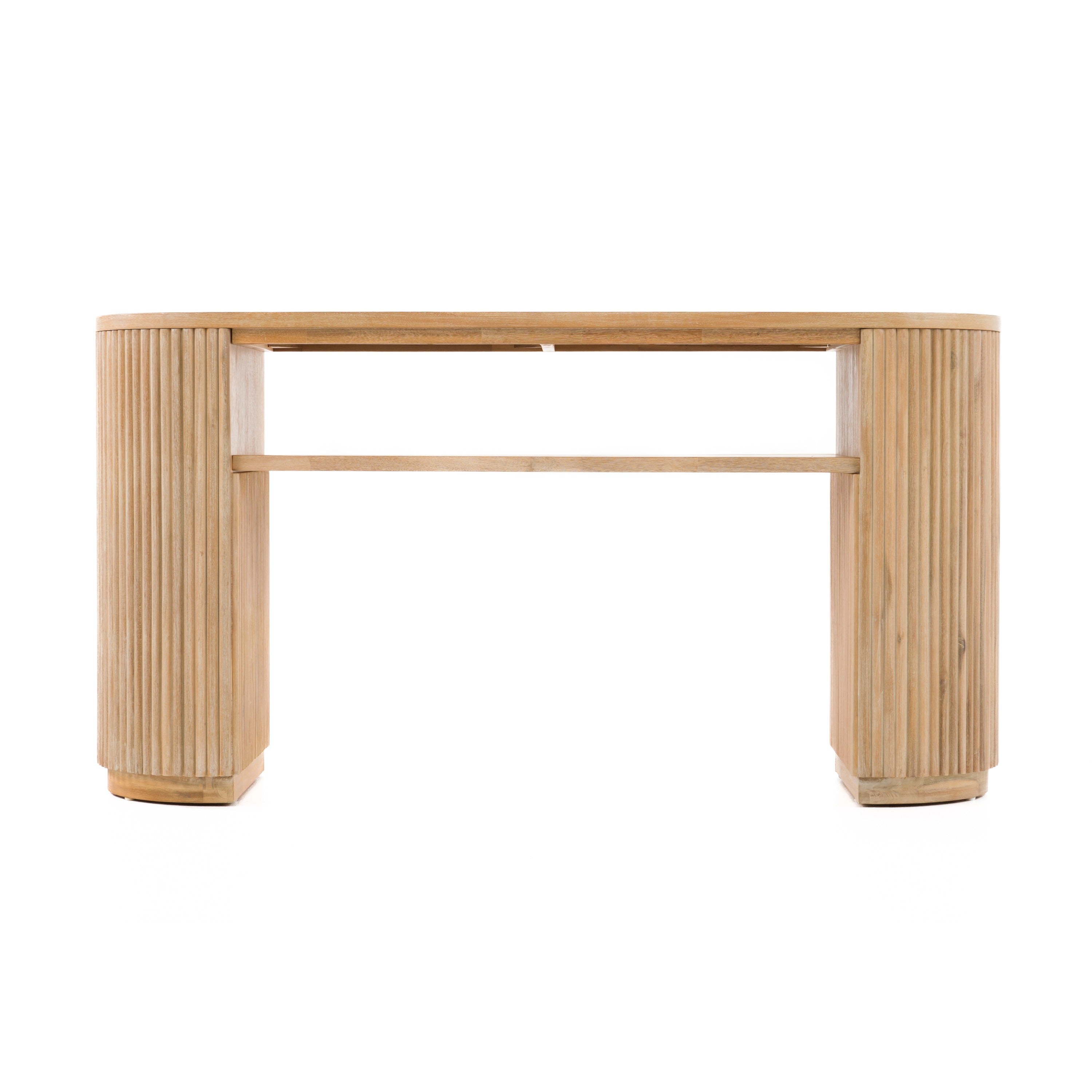 The Modrest Jacobson Console Table is a stunning piece that showcases modern design with a natural acacia finish. Its rounded top and fluted side panels create a sophisticated silhouette, while the open shelf offers functional storage without sacrificing style. Ideal for entryways or living areas, this console table blends seamlessly with contemporary decor, adding warmth and texture to any space. It's a striking statement piece that enhances the beauty of its surroundings.
