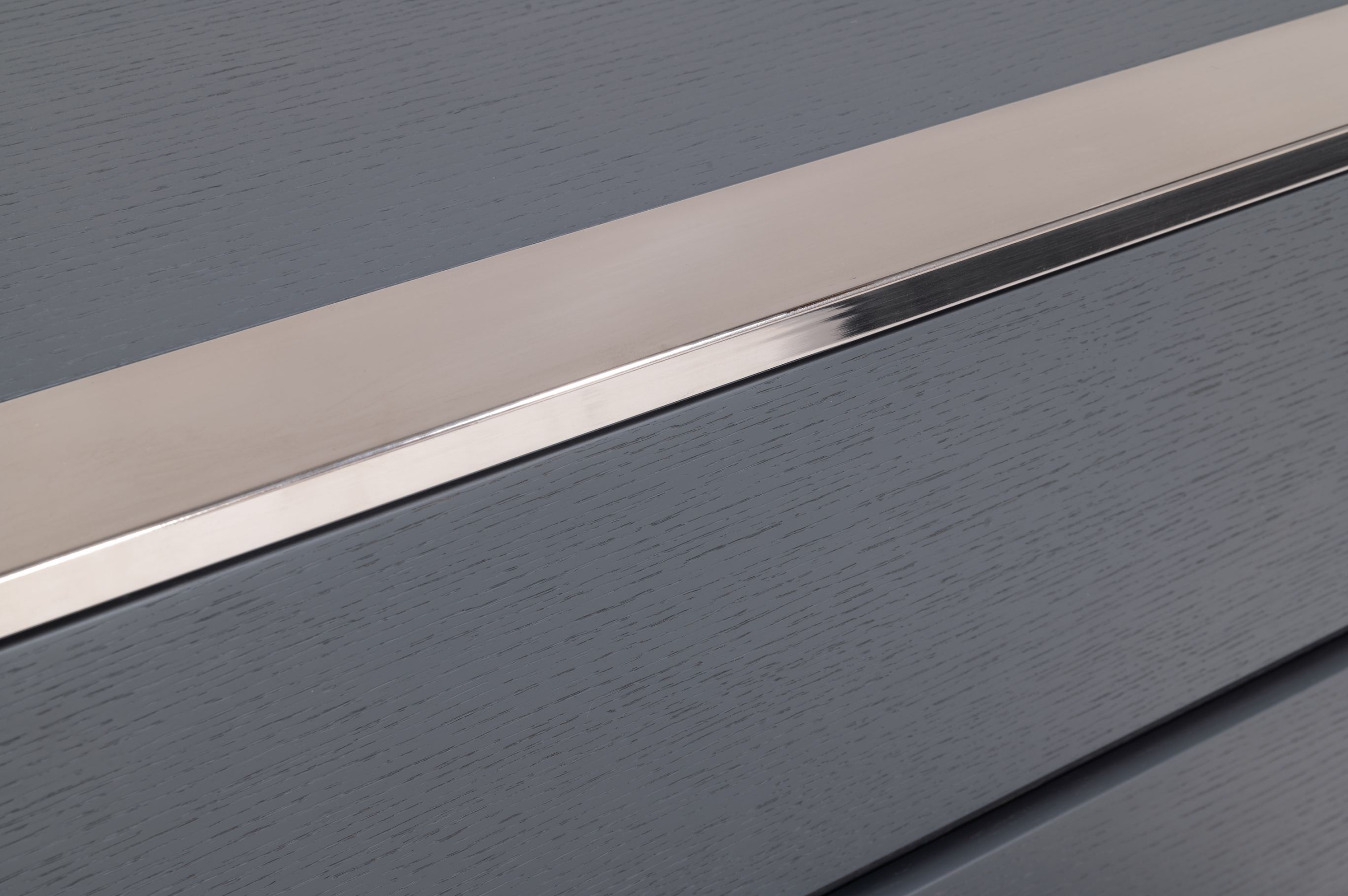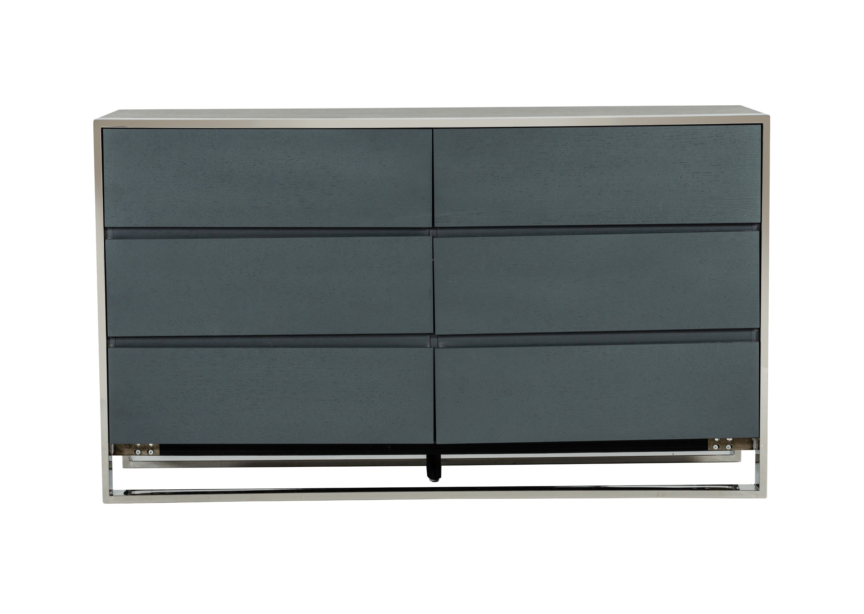 The Jolene Bed is a totally unique modern design. The metal legs support the intricately designed headrest upholstered in a dark grey and light grey vegan leather. This contemporary style interested the eye with its bell-shaped headboard. Invite all the good vibes into your room with the Jolene Bed. The Jolene Dresser is the perfect modern example of design. The grey oak veneer of the six drawers is smooth and modern. Surrounding the front and back of this piece is a polished stainless-steel frame that contrasts the grey of the drawers. All drawers are self-closing creating a truly contemporary piece. The Jolene Nightstand is the perfect modern example of design. The grey oak veneer of the two drawers is smooth and modern. Surrounding the front and back of this piece is a polished stainless-steel frame that contrasts the grey of the drawers. All drawers are self-closing creating a truly contemporary piece.
