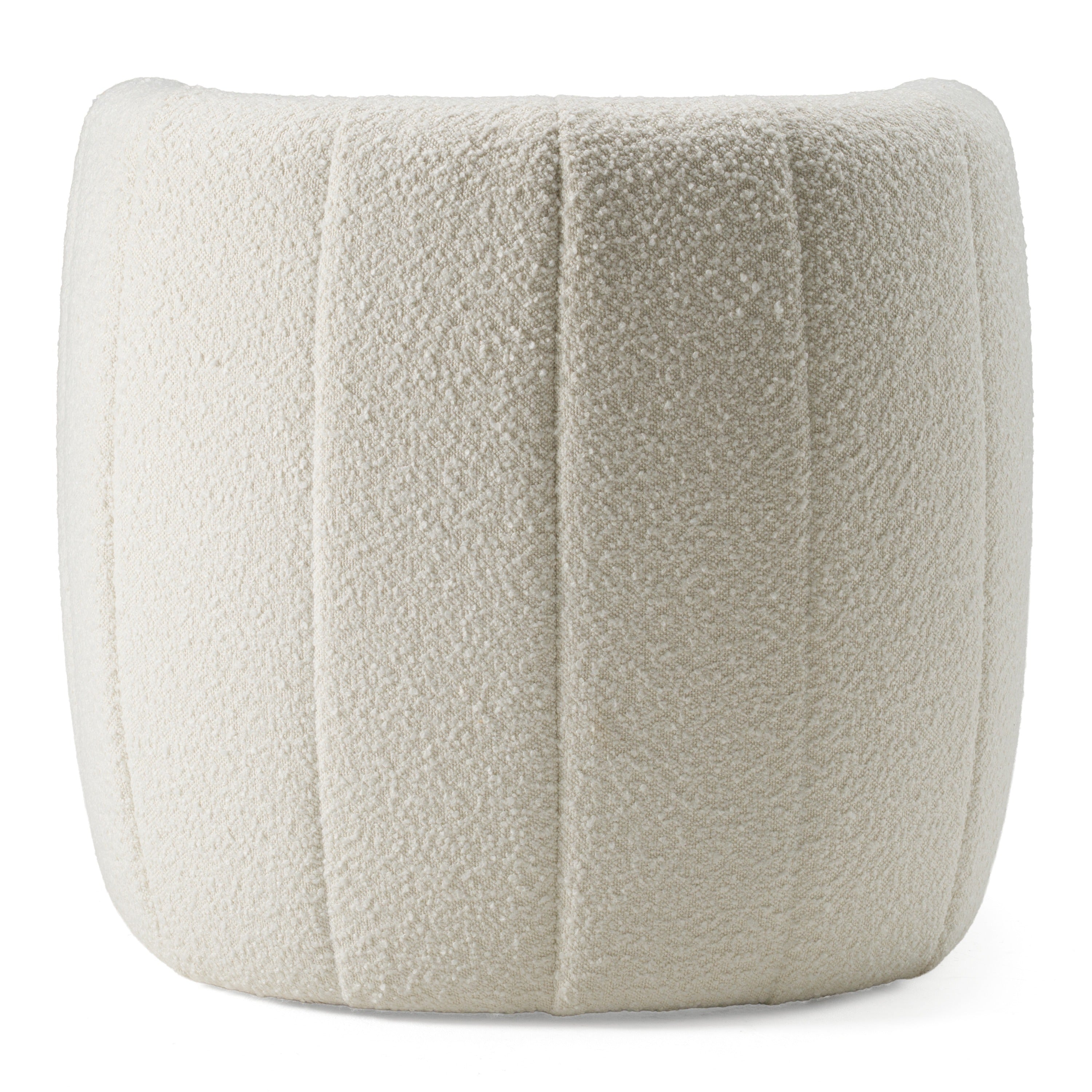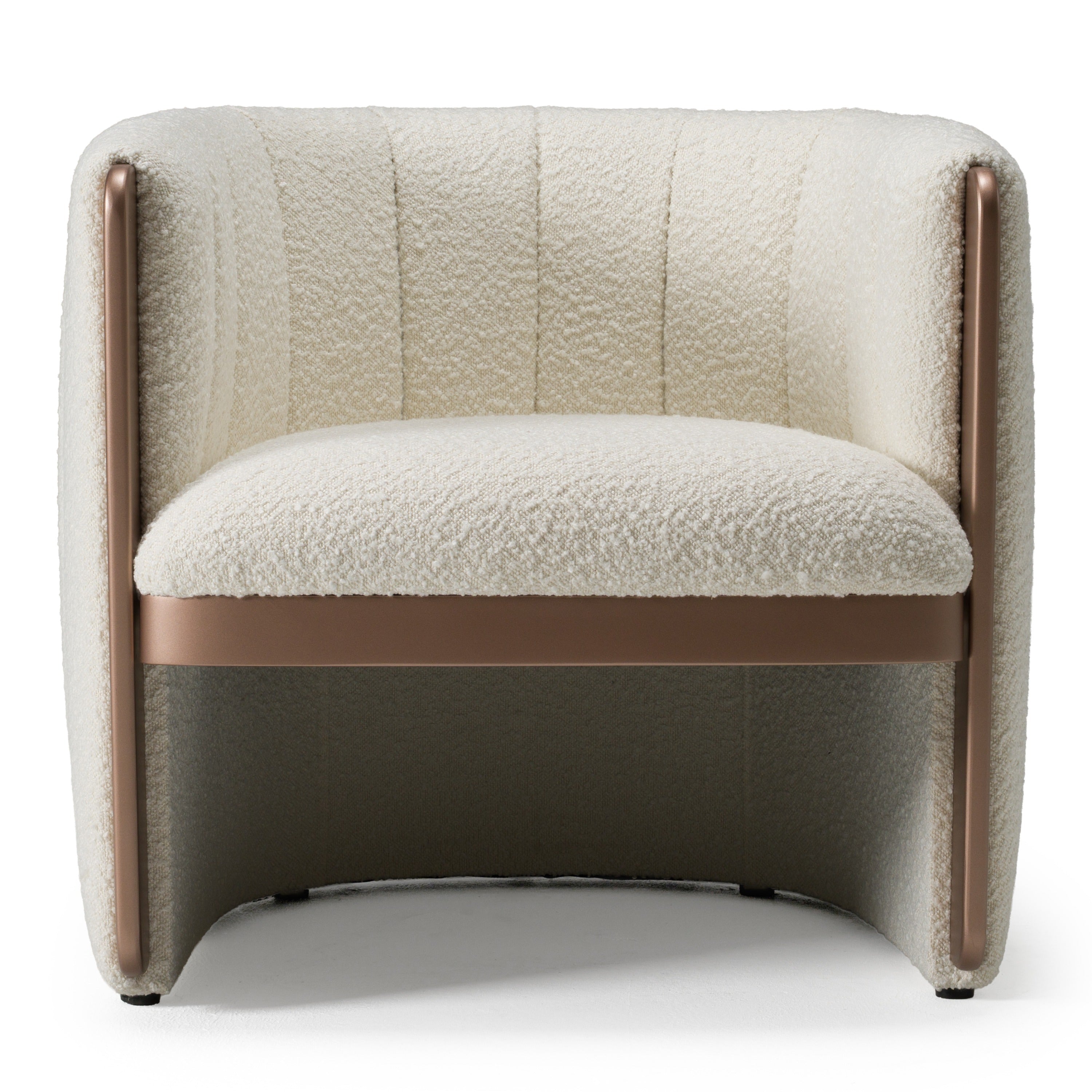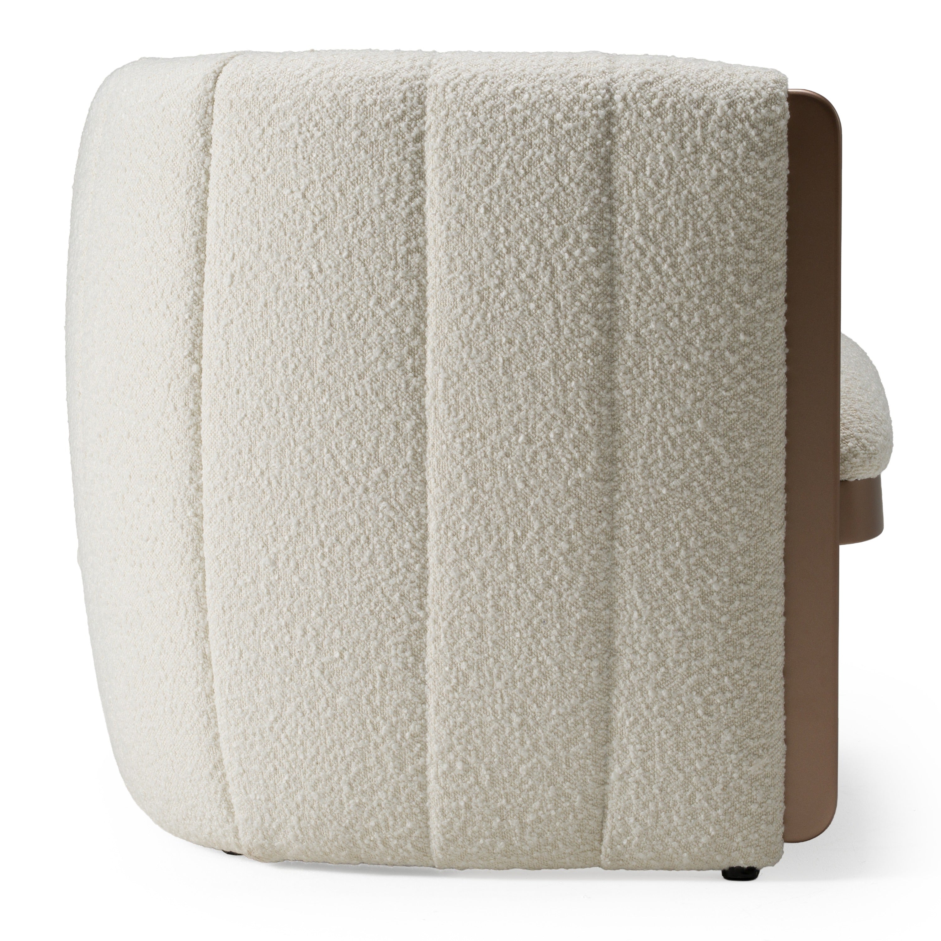 Wrapped in a soft bouclé fabric, the Jocelyn accent chair appeals to the contemporary connoisseur. The curved design makes for an inviting resting place as you are supported by the paneled back. A copper brown finish is applied to the legs to offer contrast. Pair with the Laura round end table for a complete look.