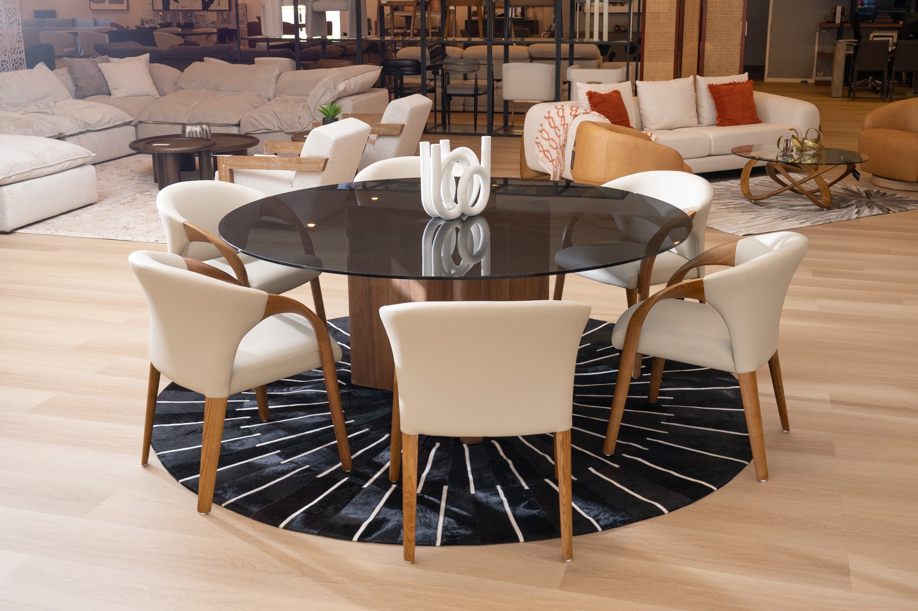 The Kaye Dining Table is a stylish modern piece that will fill your dining room with excitement and class. The glass top is tempered with a grey tint to give it color and texture. Layed sweetly atop a walnut veneer wood base with a three-point star shape. Perfect for a modern or contemporary space, this piece is a must-have.