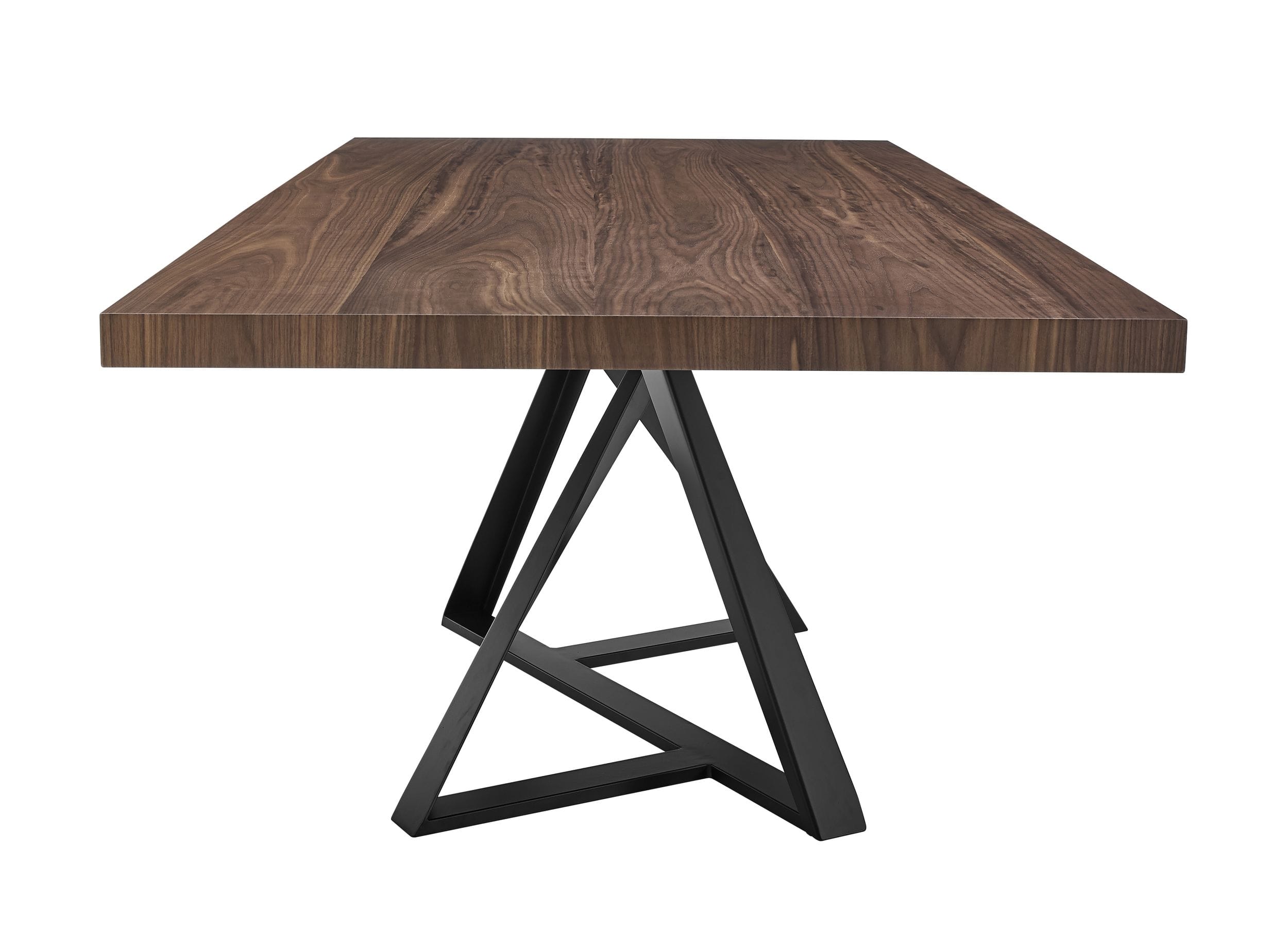 The Keanna Walnut and Black Dining Table is the perfect industrial option for your modern home. The black pedestal legs are beautifully finished in a black powder coating that invites abstract forms. The thick Walnut veneer top has a farmhouse visual style. Sure to stand out in any contemporary home, this item is useful and gorgeous.