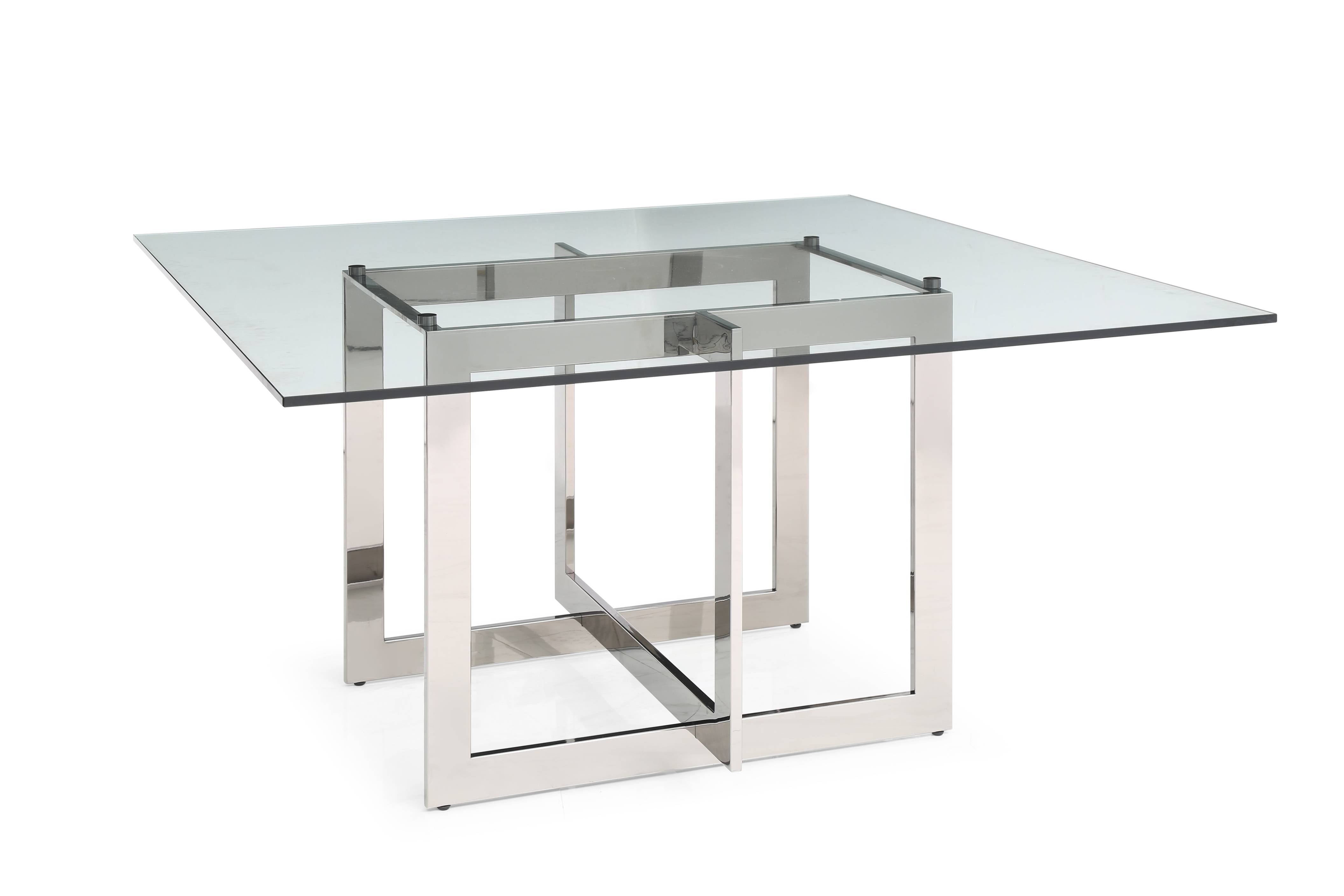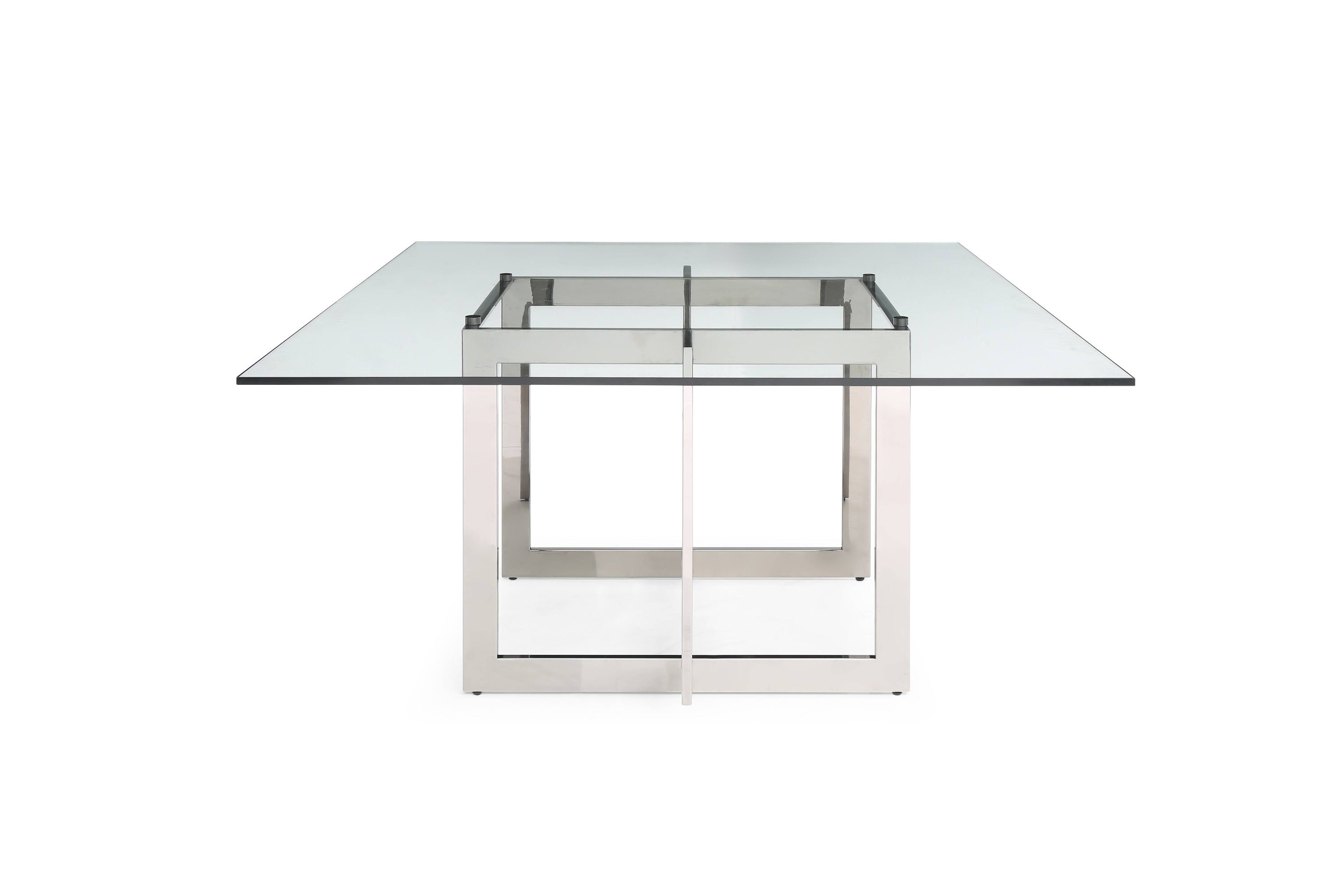 The Keaton Dining Table is a beautiful place to sit with your family and enjoy a meal. The cear top table is sure to fit any guests you want to invite over. The Stainless Steel base is boxy and sleek. Pair with a funky colored chair to get the full effect.