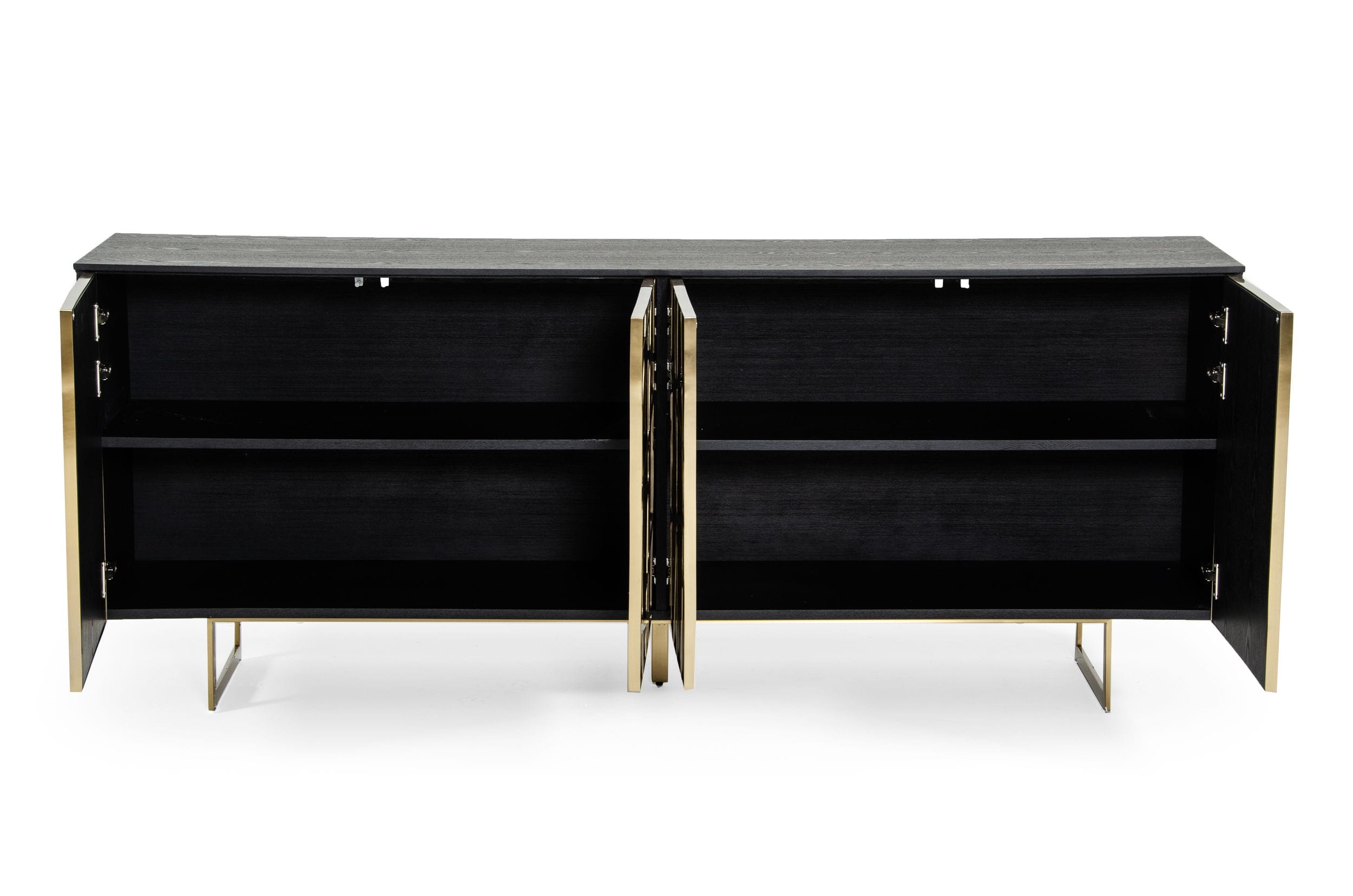 The glam, contemporary modern, black and gold buffet has 4 doors, with interior fixed shelves. The black oak buffet is decorated with champagne gold chrome strips in a geometric pattern across the front. The U-shaped matching legs complete the sleek contemporary look. This buffet will fit in with many decorating styles such as contemporary, modern, glam.