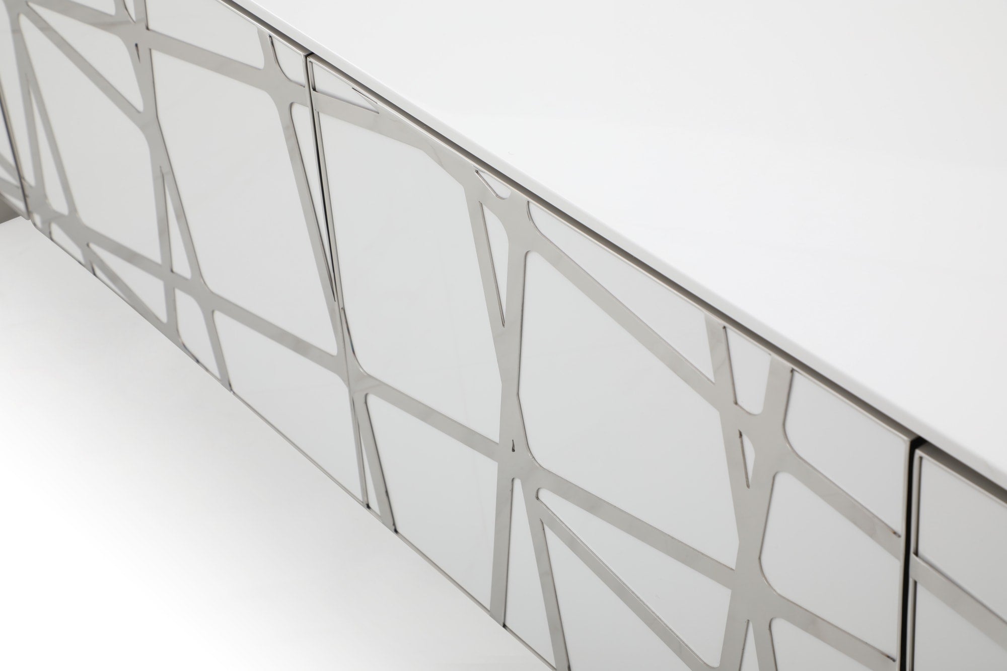 The Kilson TV Stand is a white high gloss TV stand with polished stainless steel accents. The geometric pattern makes it perfect for a mod or mid-century style room. The finished add class to a modern style and the construction is sturdy. At 87" wide, this TV stand can hold a 32-74 inch tv with plenty of space leftover. The stand has four drawers and two shelves per drawer.
