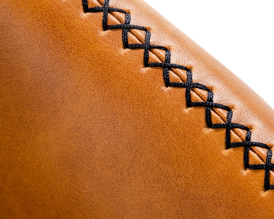 The Kirk Accent chair is the perfect accent chair for your contemporary, mid-century, or farmhouse home. This lovely chair is adorned with eco-leather upholstery in a deep-aged Cognac color. The black exposed stitching contrasts the lovely leather and adds a detail that is unexpected. Perfect with a plush throw blanket by the fire.