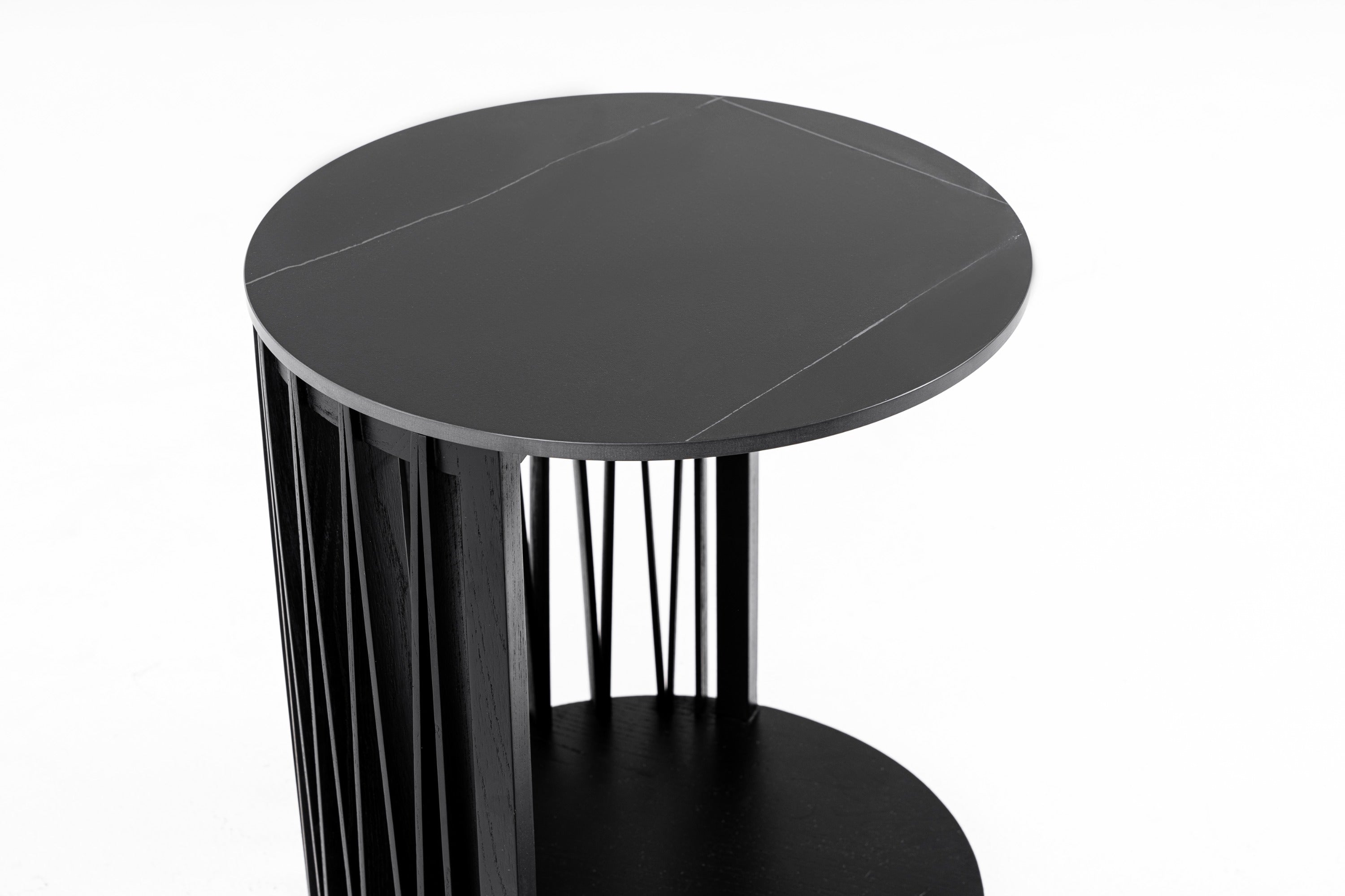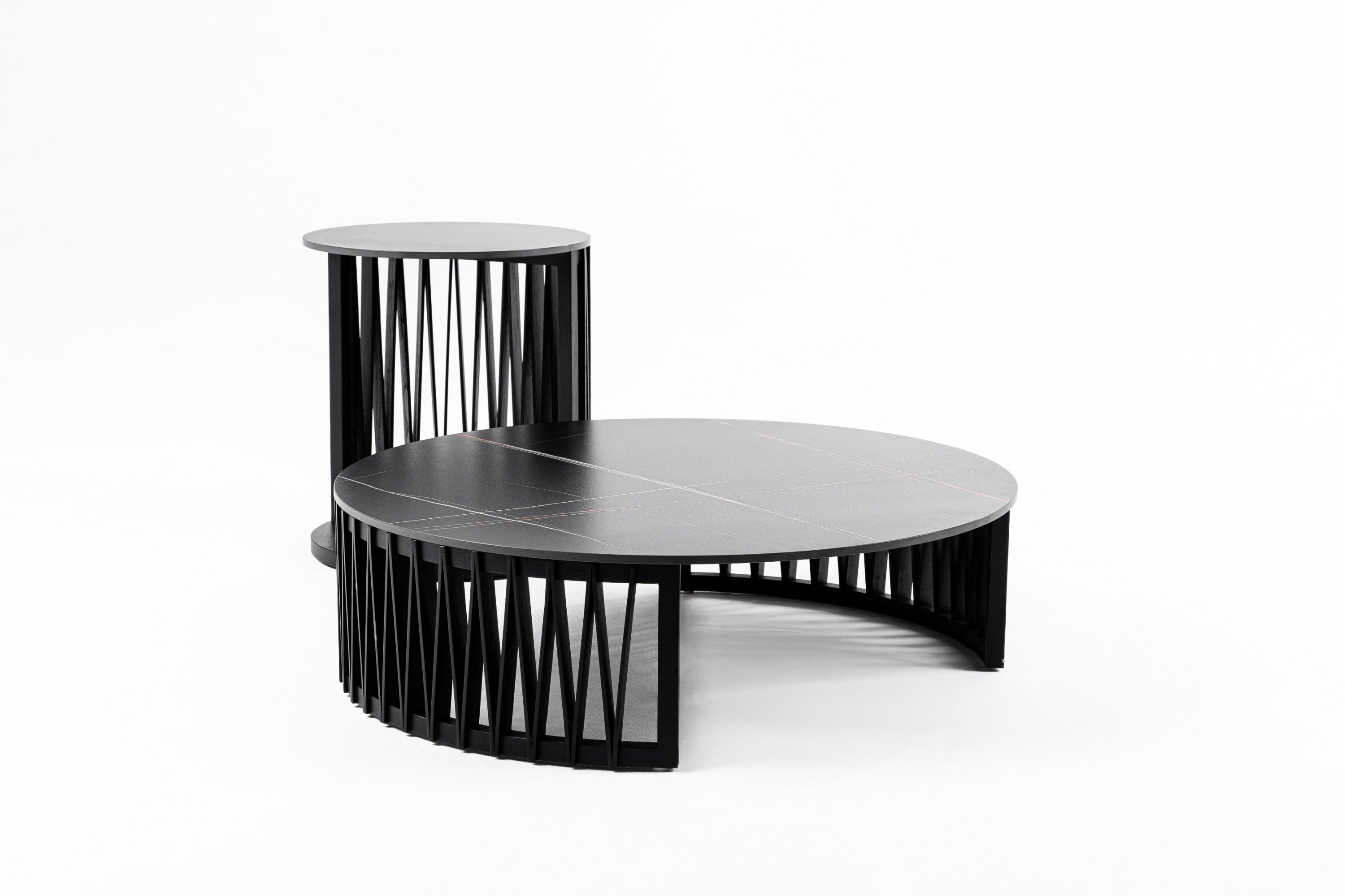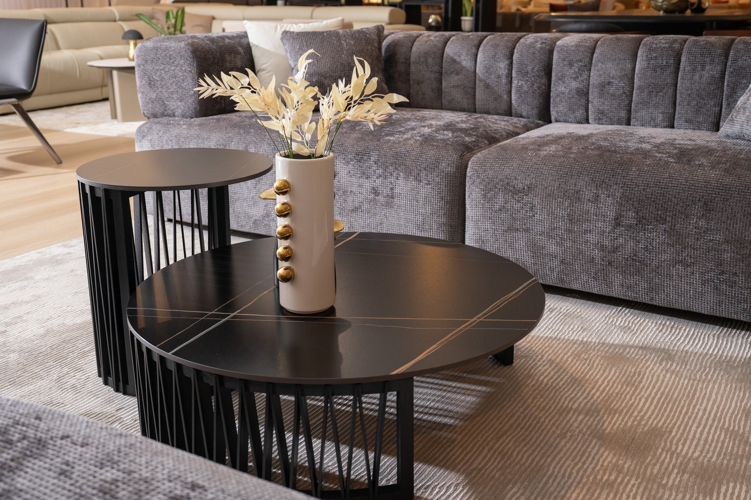 The Larmier Coffee table set is the perfect choice for tight living areas. This drum style table is large enough to bring your space together, but not too large to overtake the room. A hardy black ceramic with natural stone pattern and solid wood slat base will add a one-of-a-kind design touch to your home. Stack these two tables for a nesting effect or use seperately. The choice is yours!