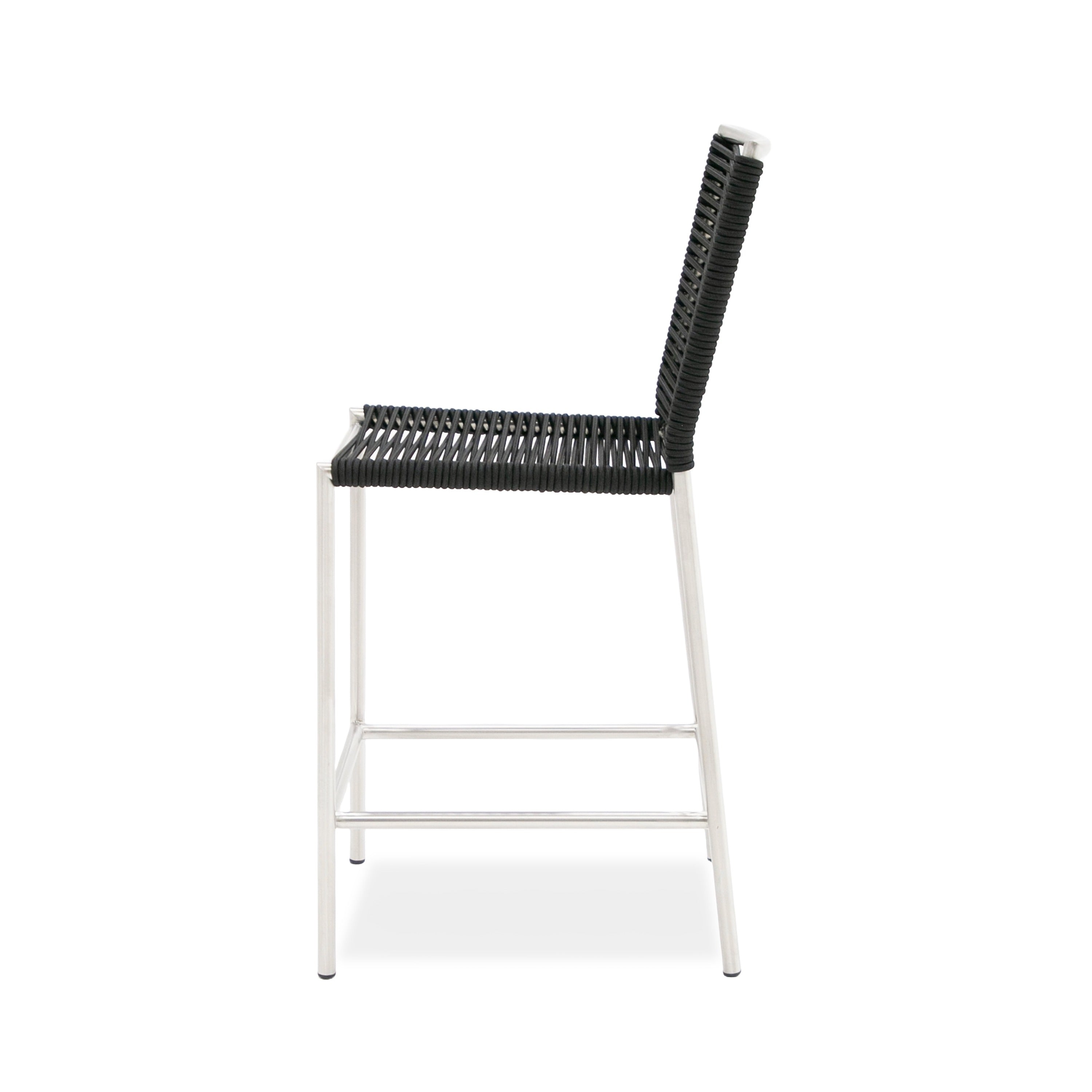 The Lathrop Counter stool is constructed of stainless steel frame and black bungee cord for the seat and back, that are laced and looped around the tubular frame. The counter stool is indoor-outdoor, meaning it has been treated for outdoor use.