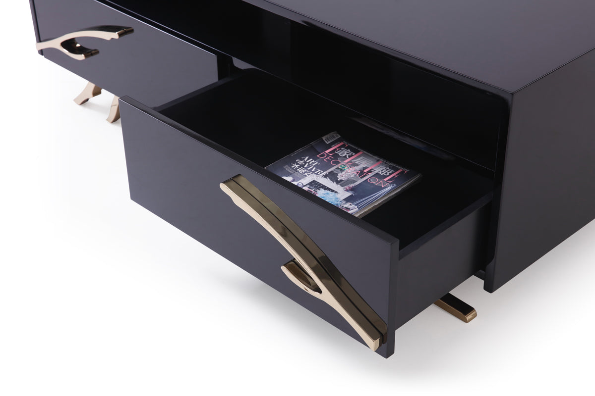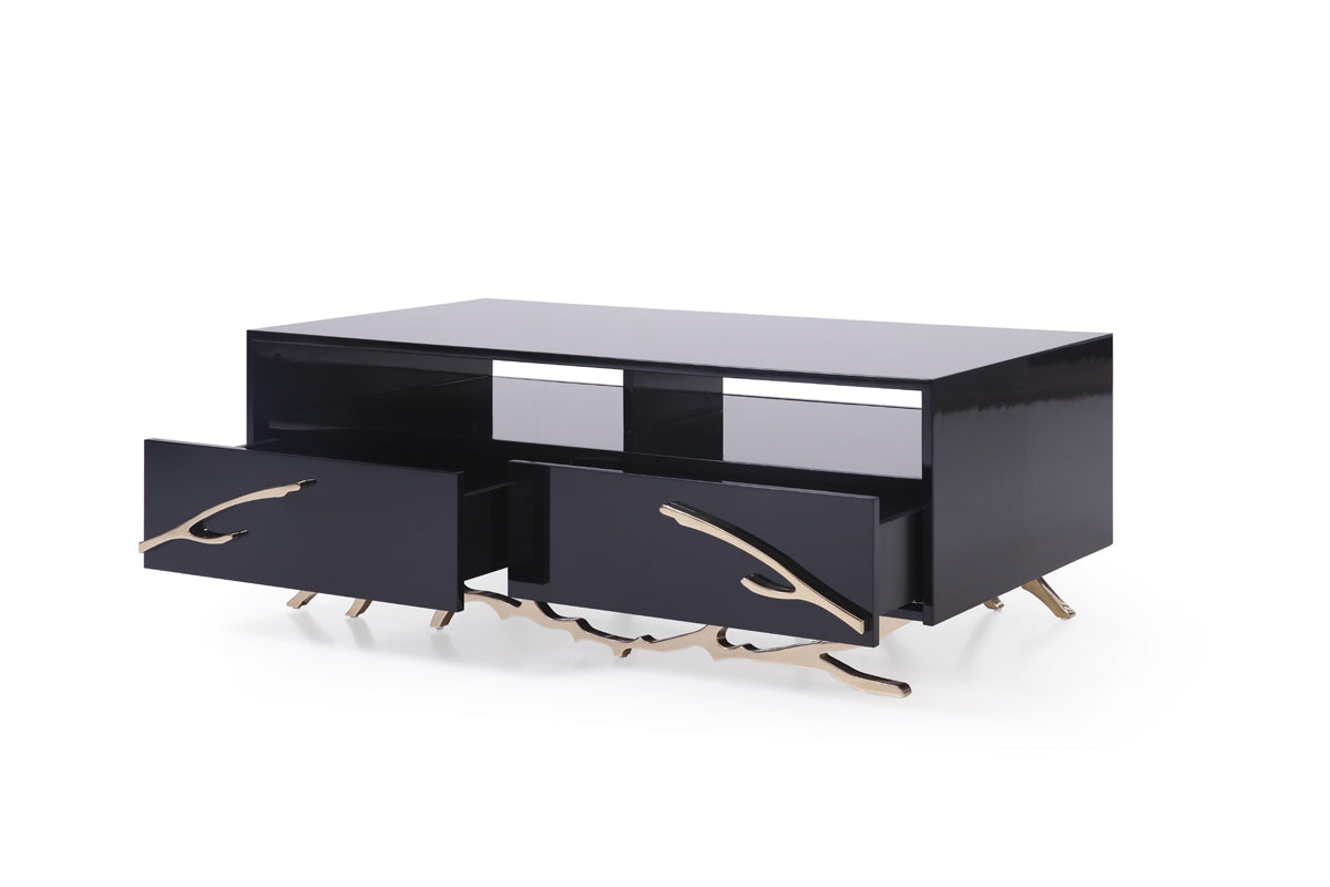 Keep your living space clutter-free with the Modrest Legend Modern Black & Gold Coffee Table. Sporting an awesome design and style, it features 2 storage open shelves and 2 drawers in a sheer black high gloss finish. Intricate gold stainless steel leg and handles complete its breathtaking appeal.